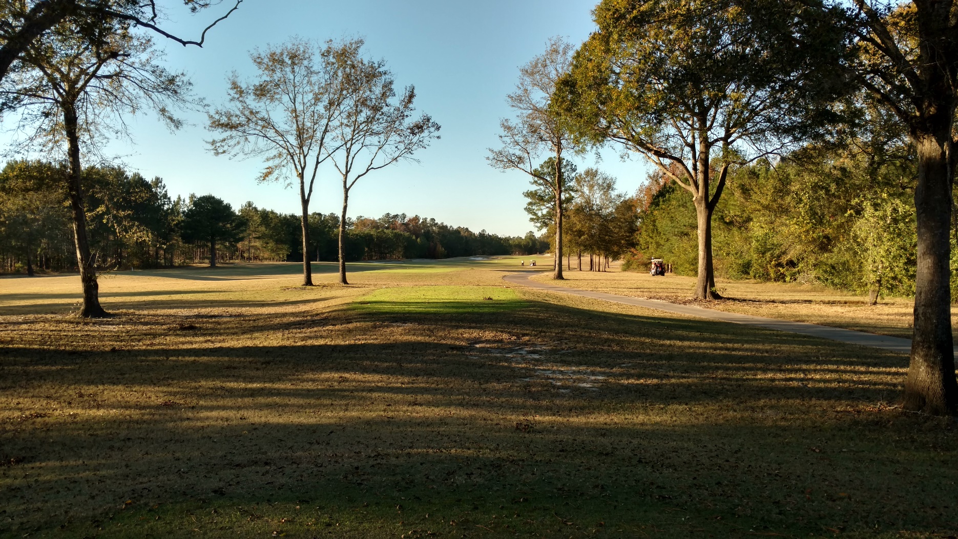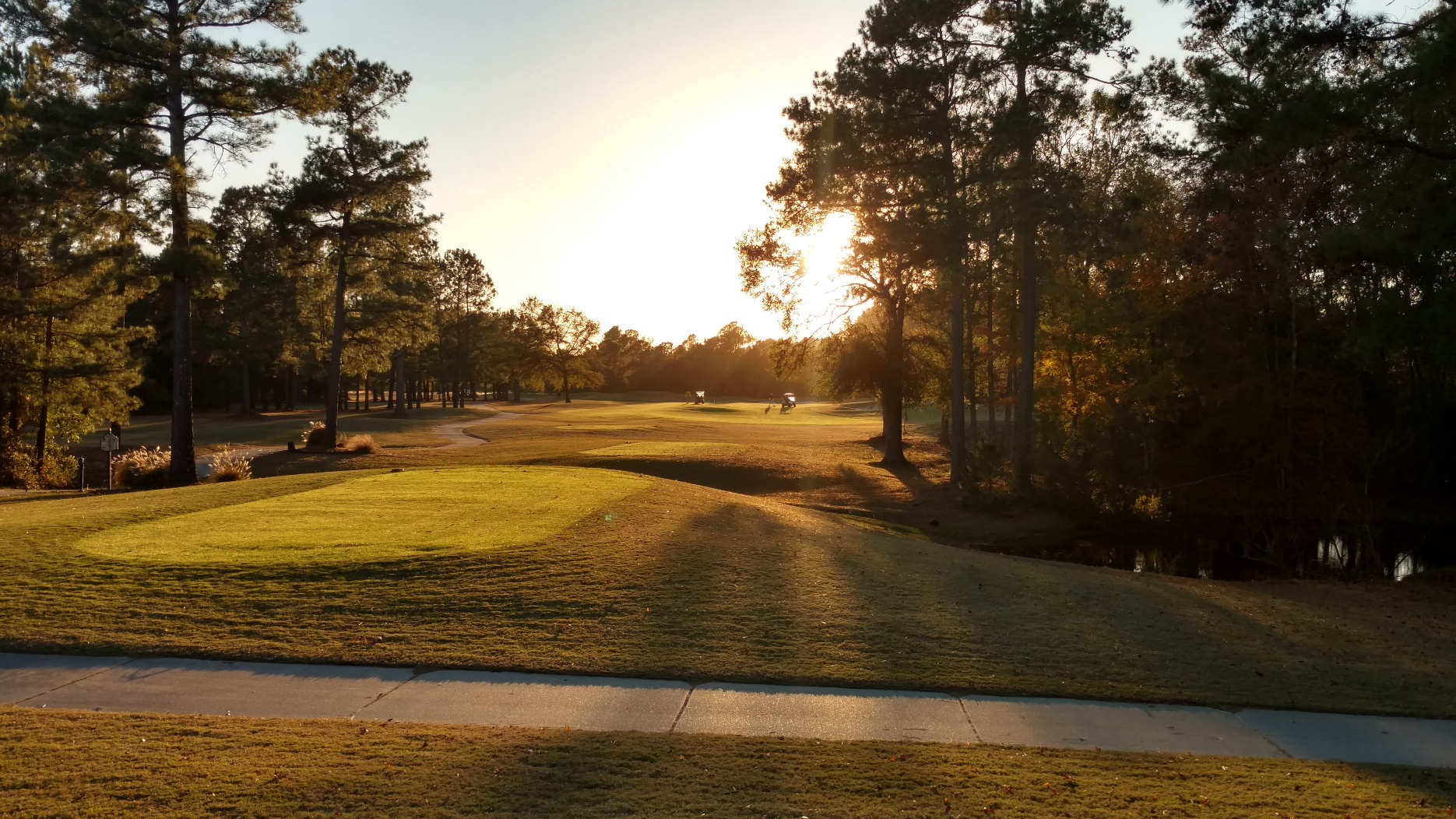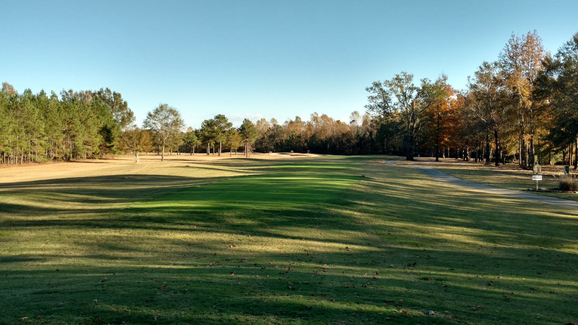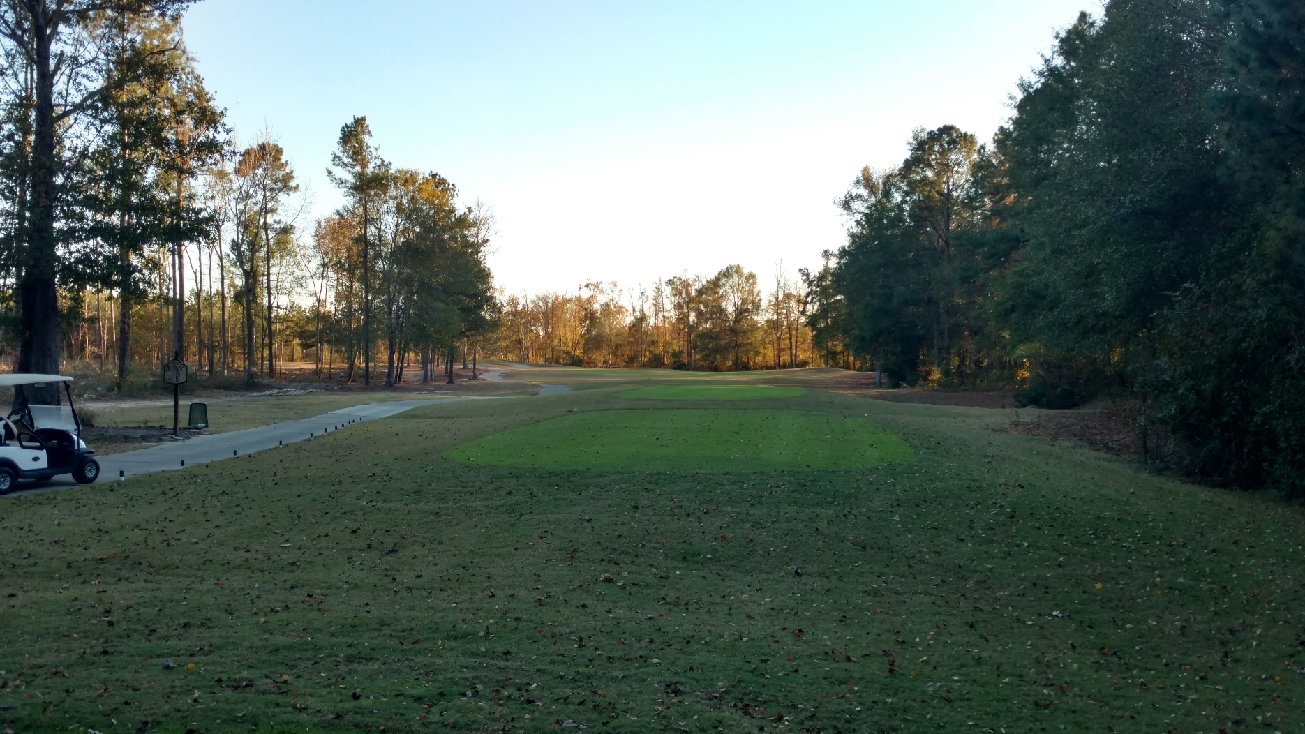 This hole is straightaway. With the trees, a lesser club may make sense for accuracy. Great photo from Brian with the sun coming in.