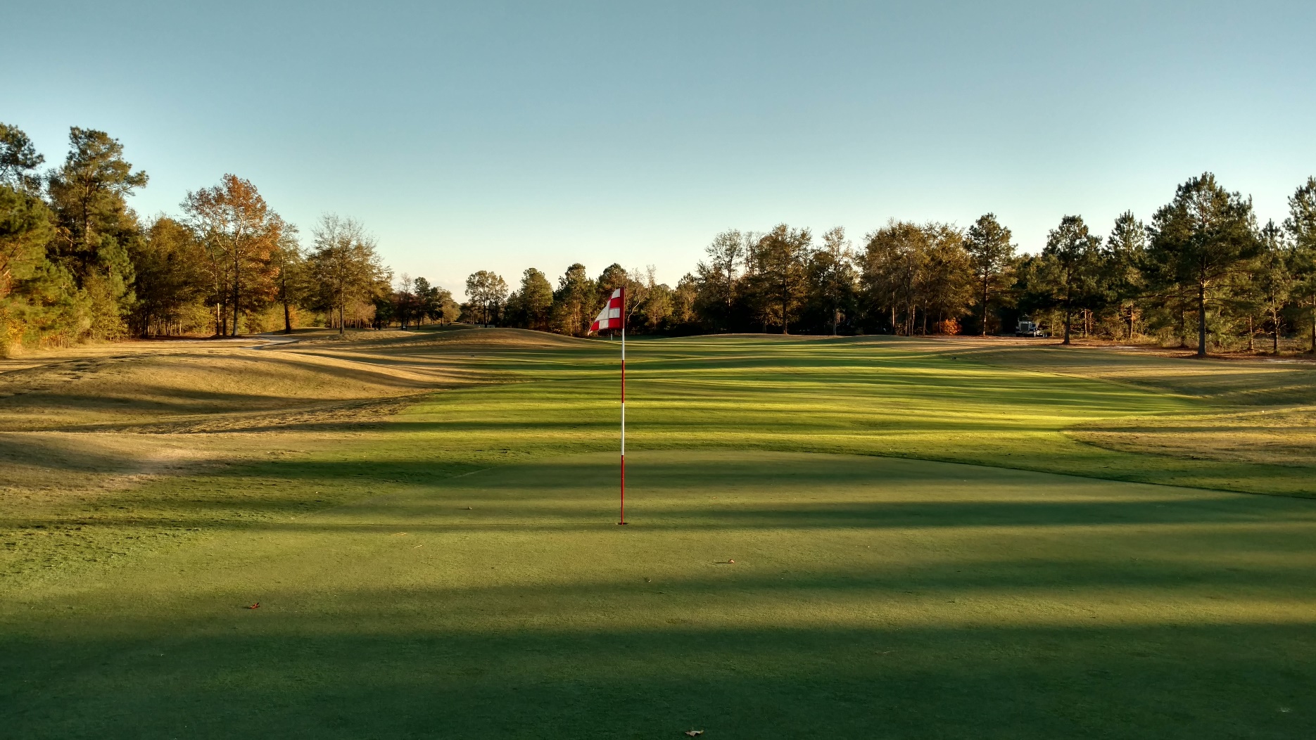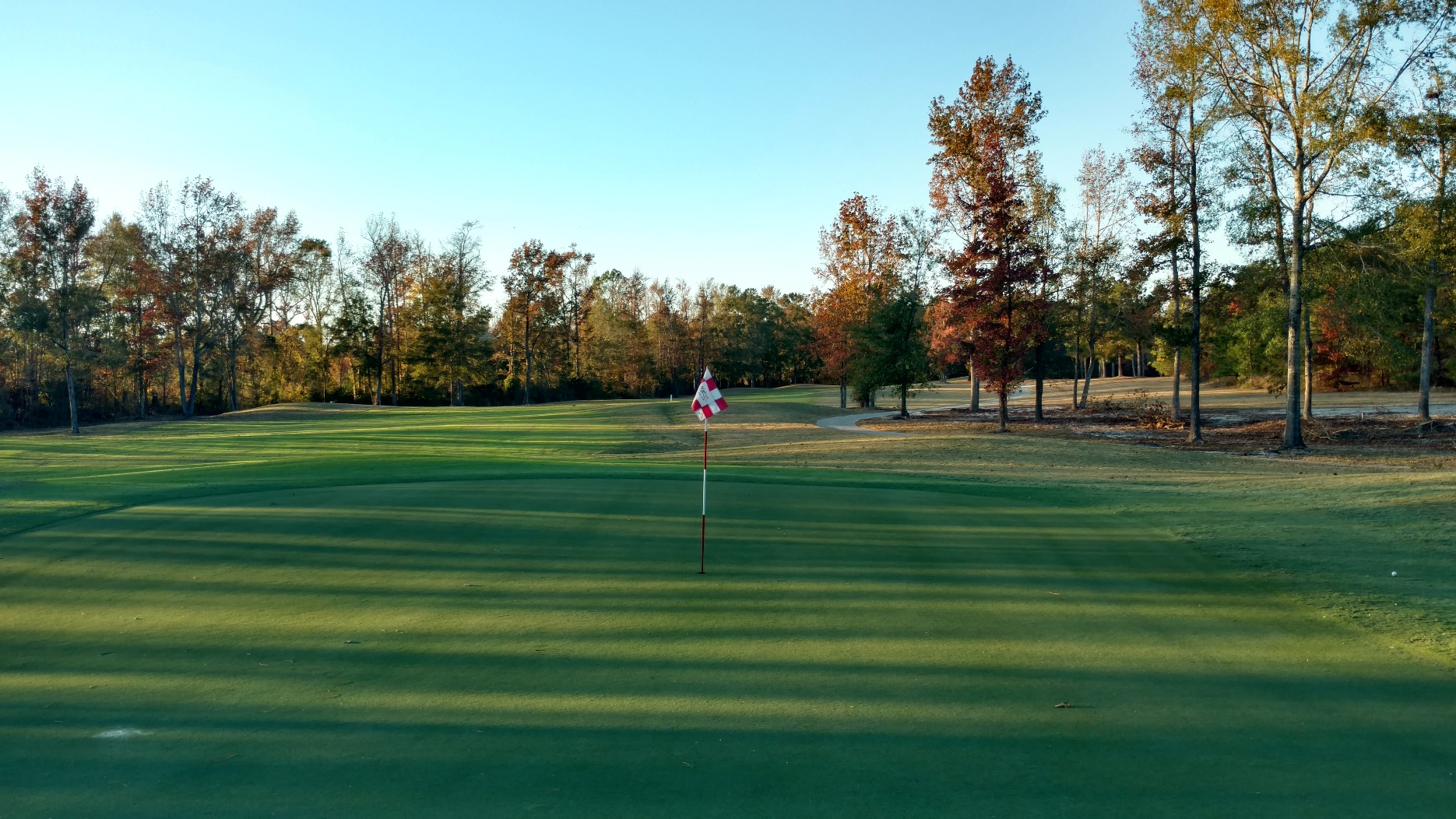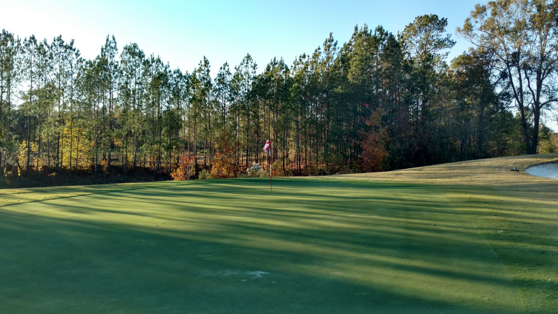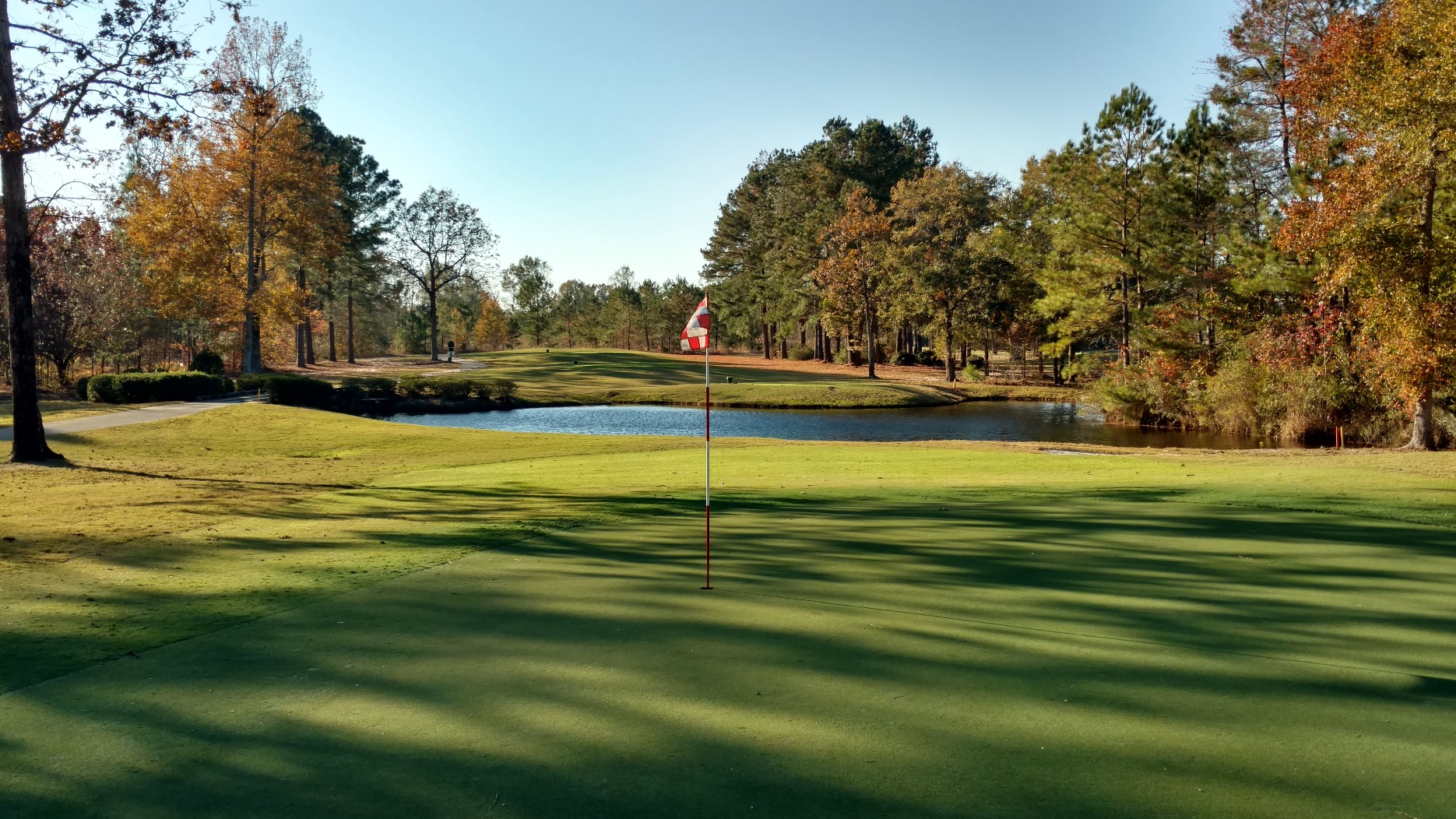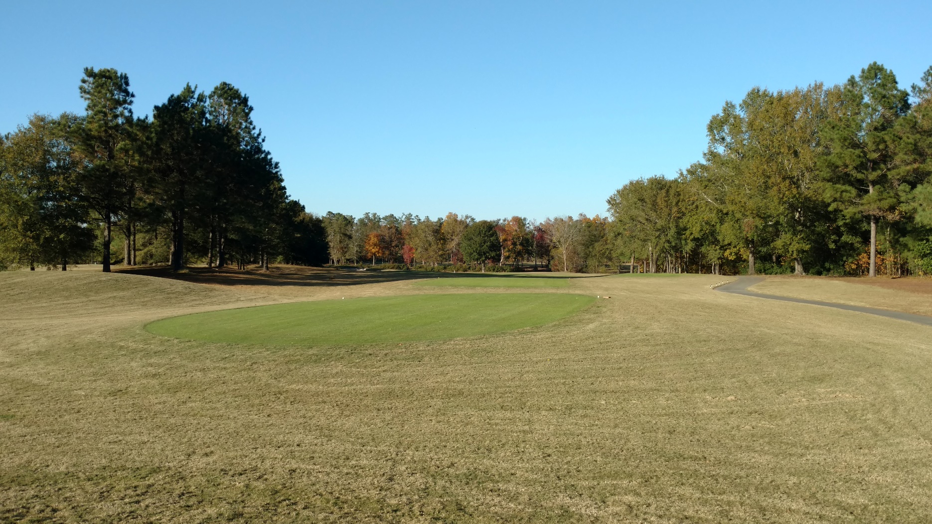 This hole is straightaway. With the trees, a lesser club may make sense for accuracy. Great photo from Brian with the sun coming in.