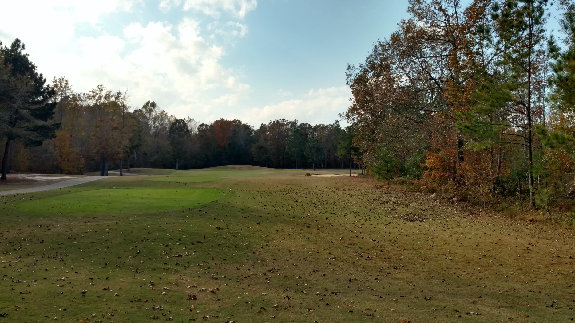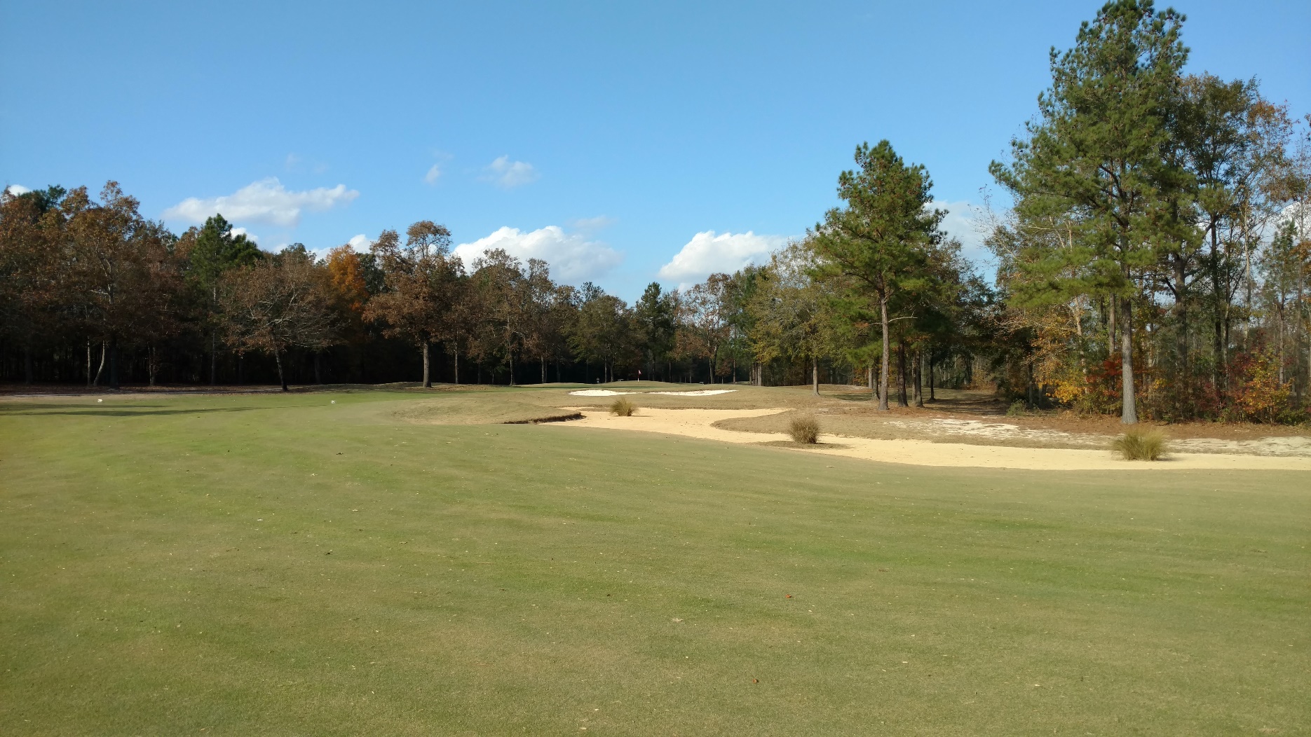 This hole is a dogleg right with trees guarding the right side. You can see the beginning of the sand that will extend to a large waste area you can see in the second photo.