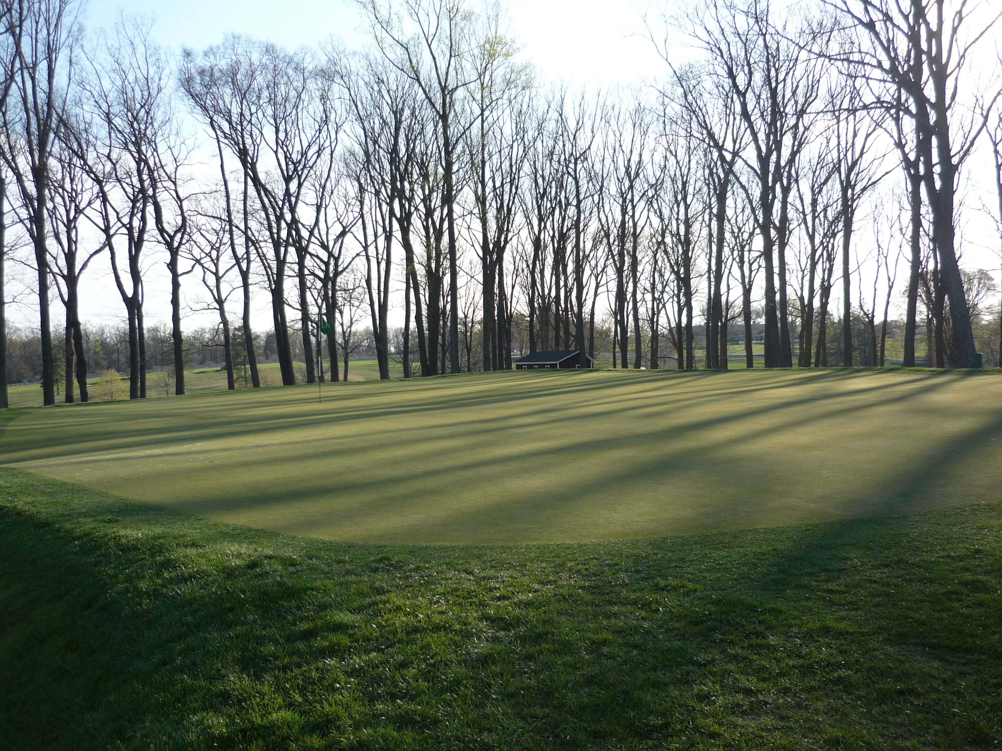 Playing back into the grove of trees the green here is shrouded in shadows. The target is pretty big considering the short distance. A miss long is the worst outcome.