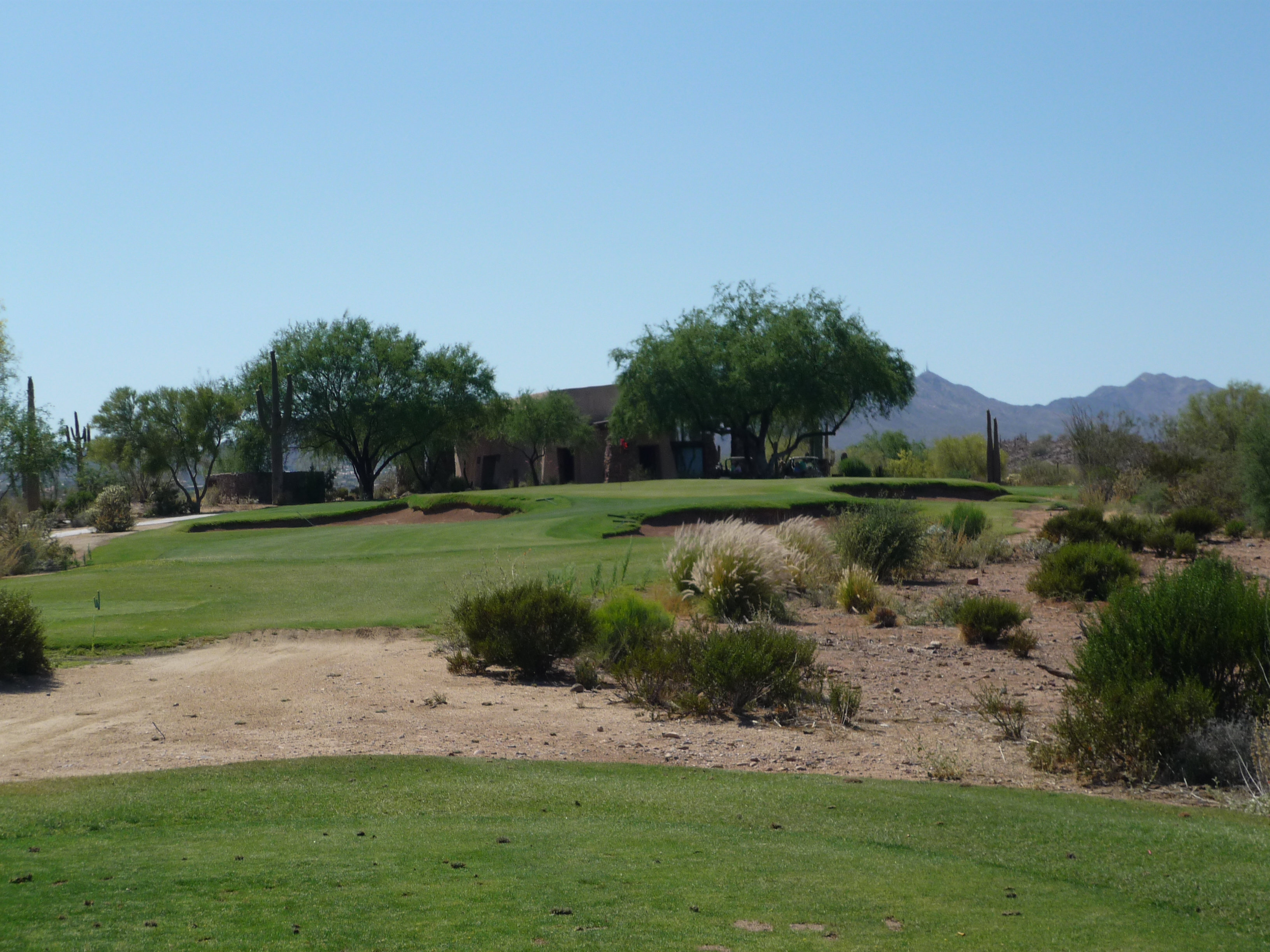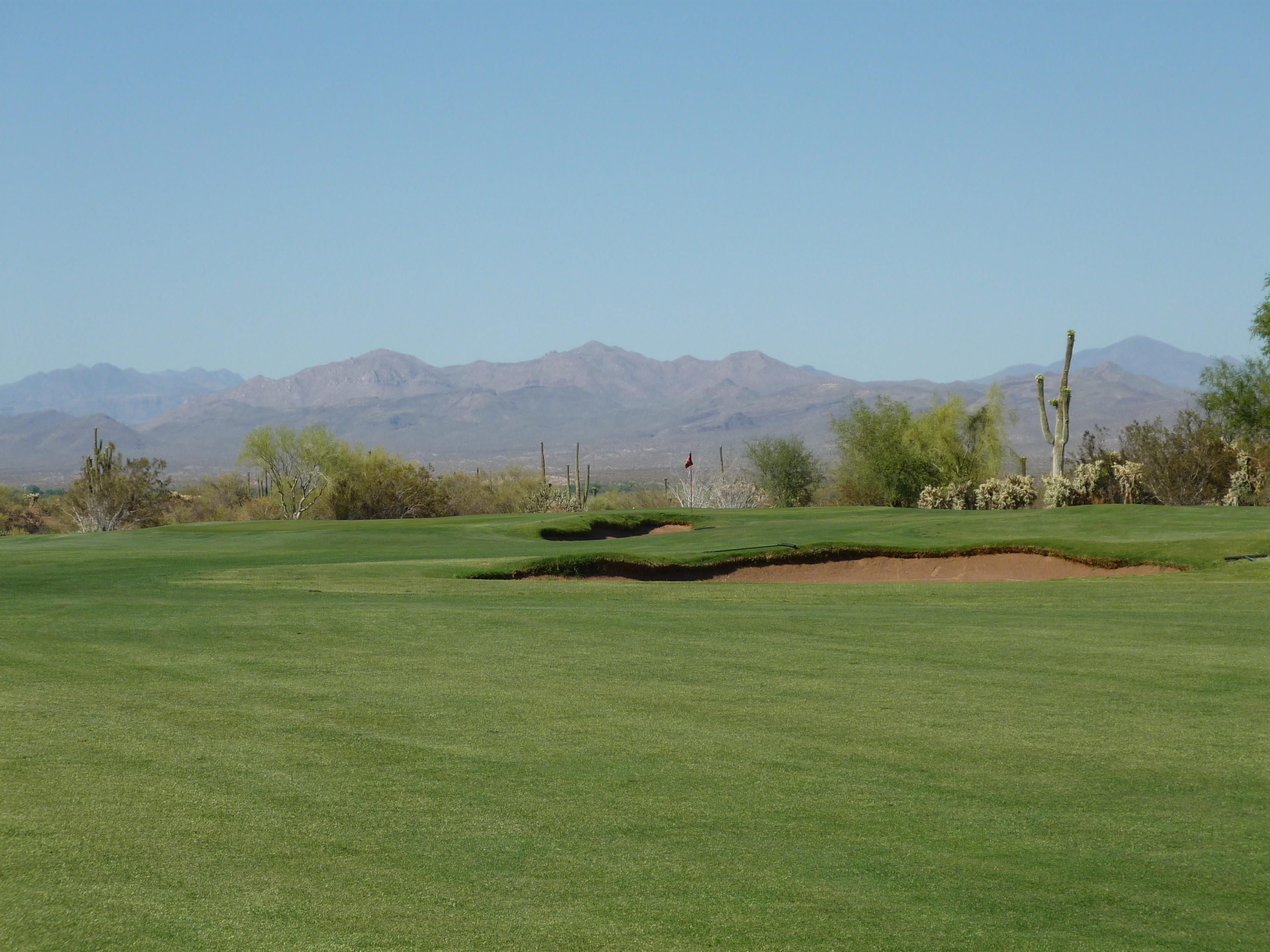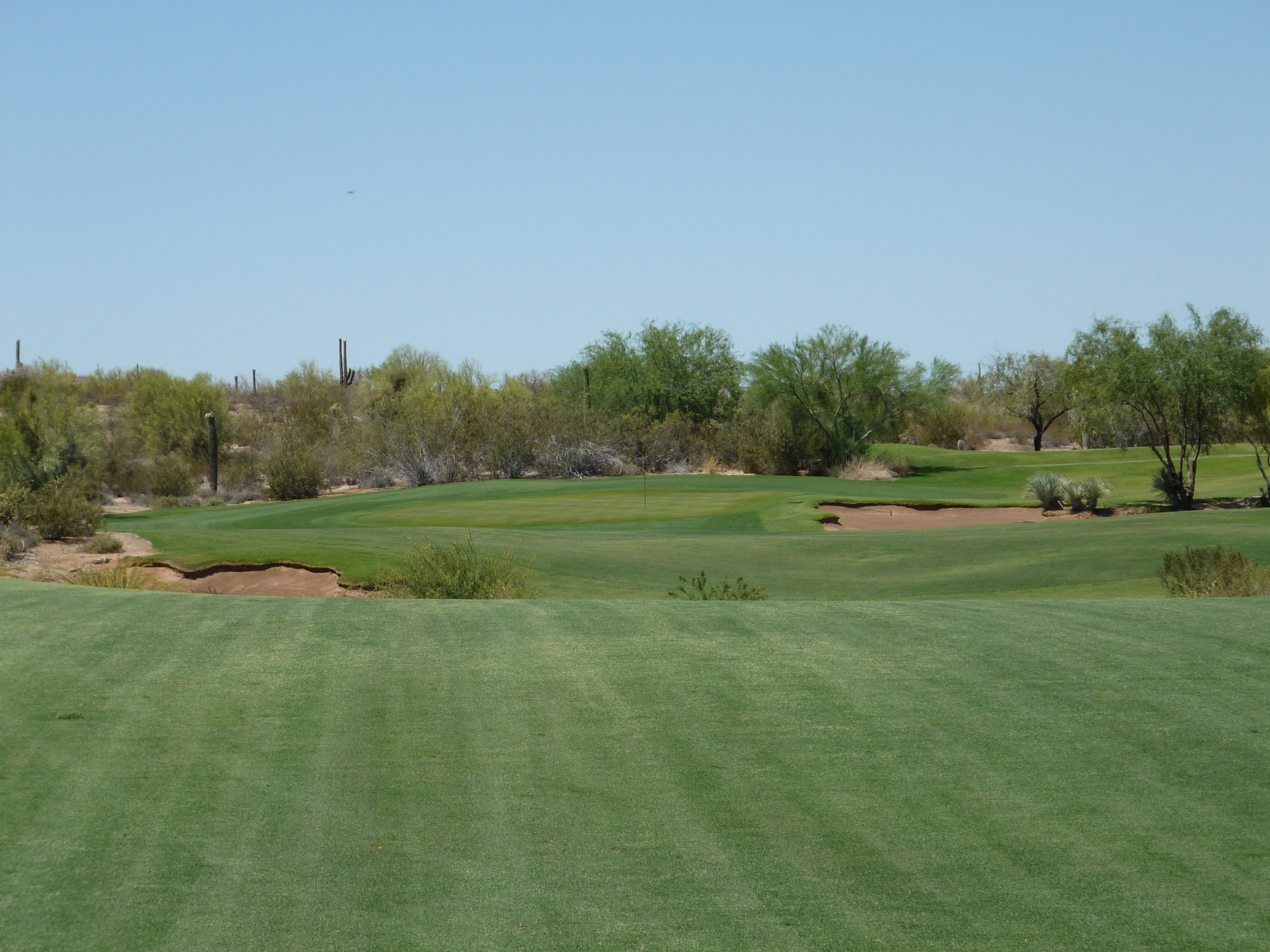 The tee shot here goes over a desert wash that isn’t really in play. The front bunkers are a different story.