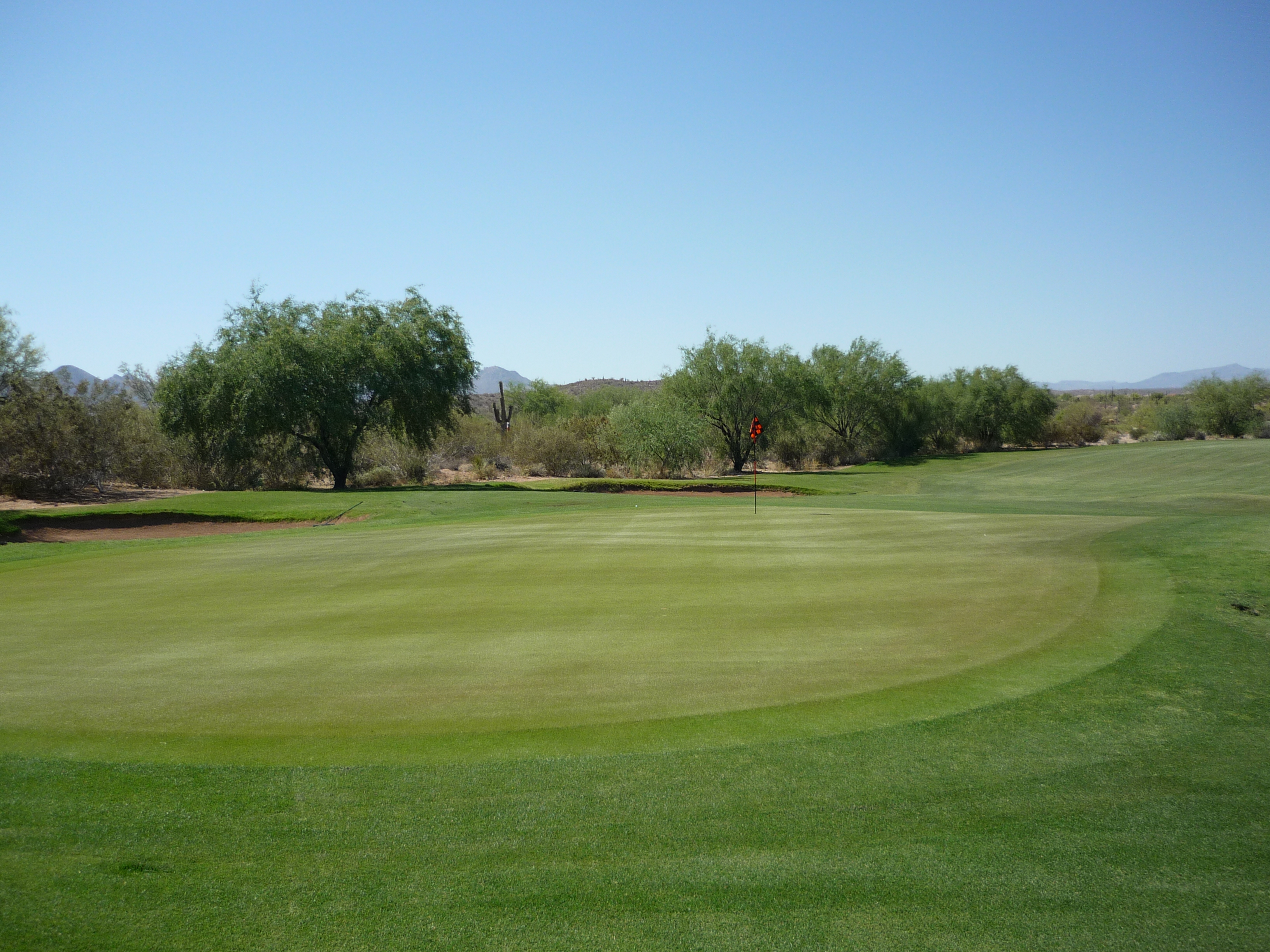 The approach plays to a green that is not protected by anything except slope. The left side does run away towards the desert though and is not the preferred side to miss.