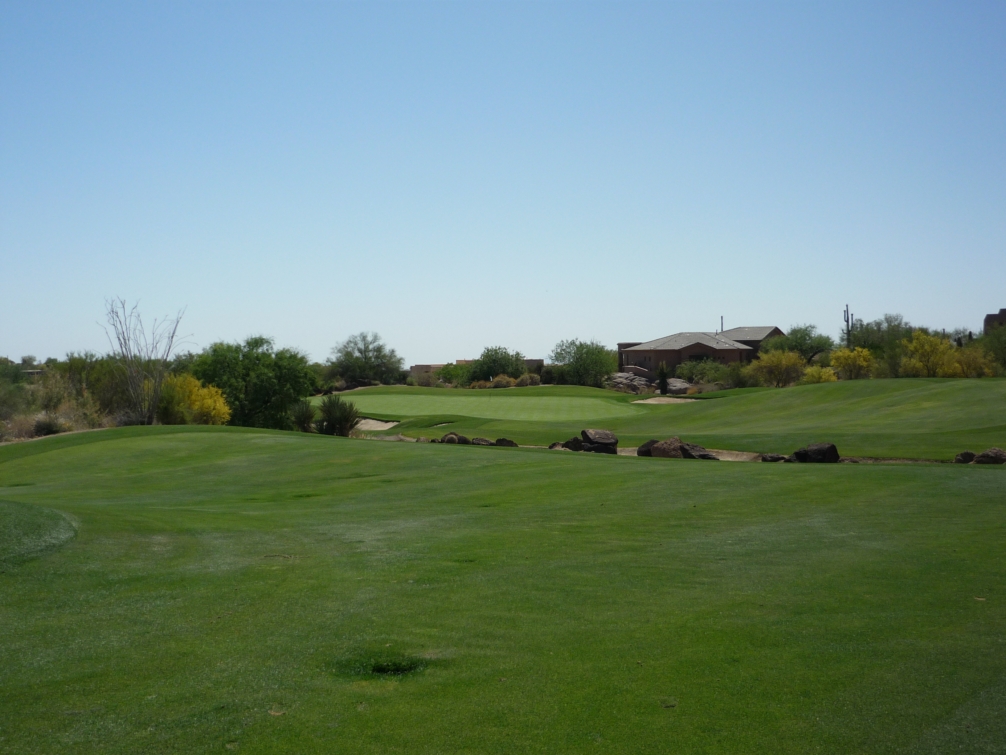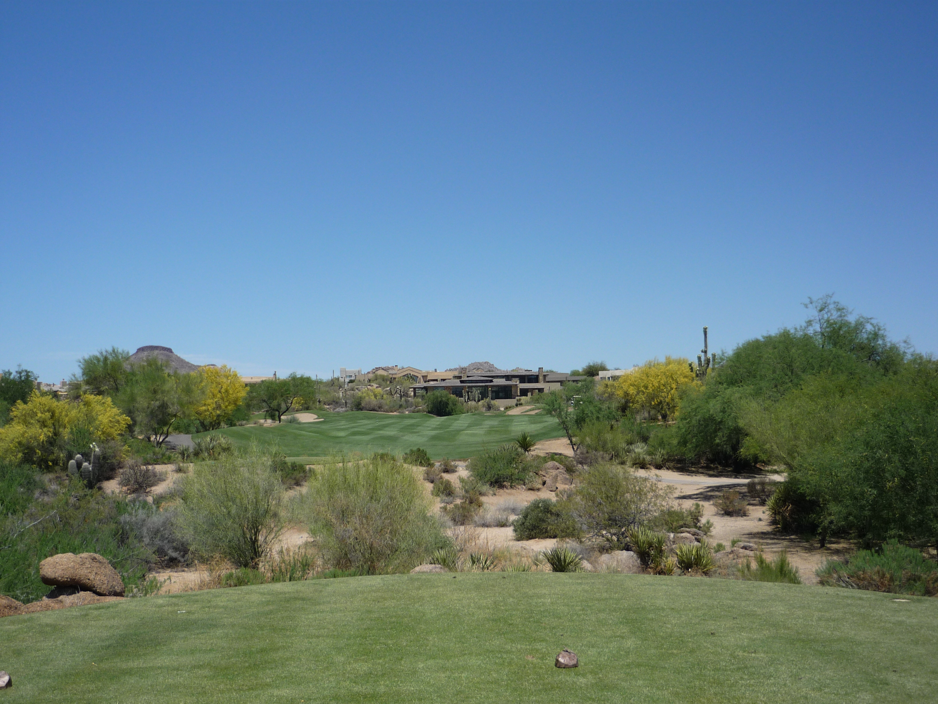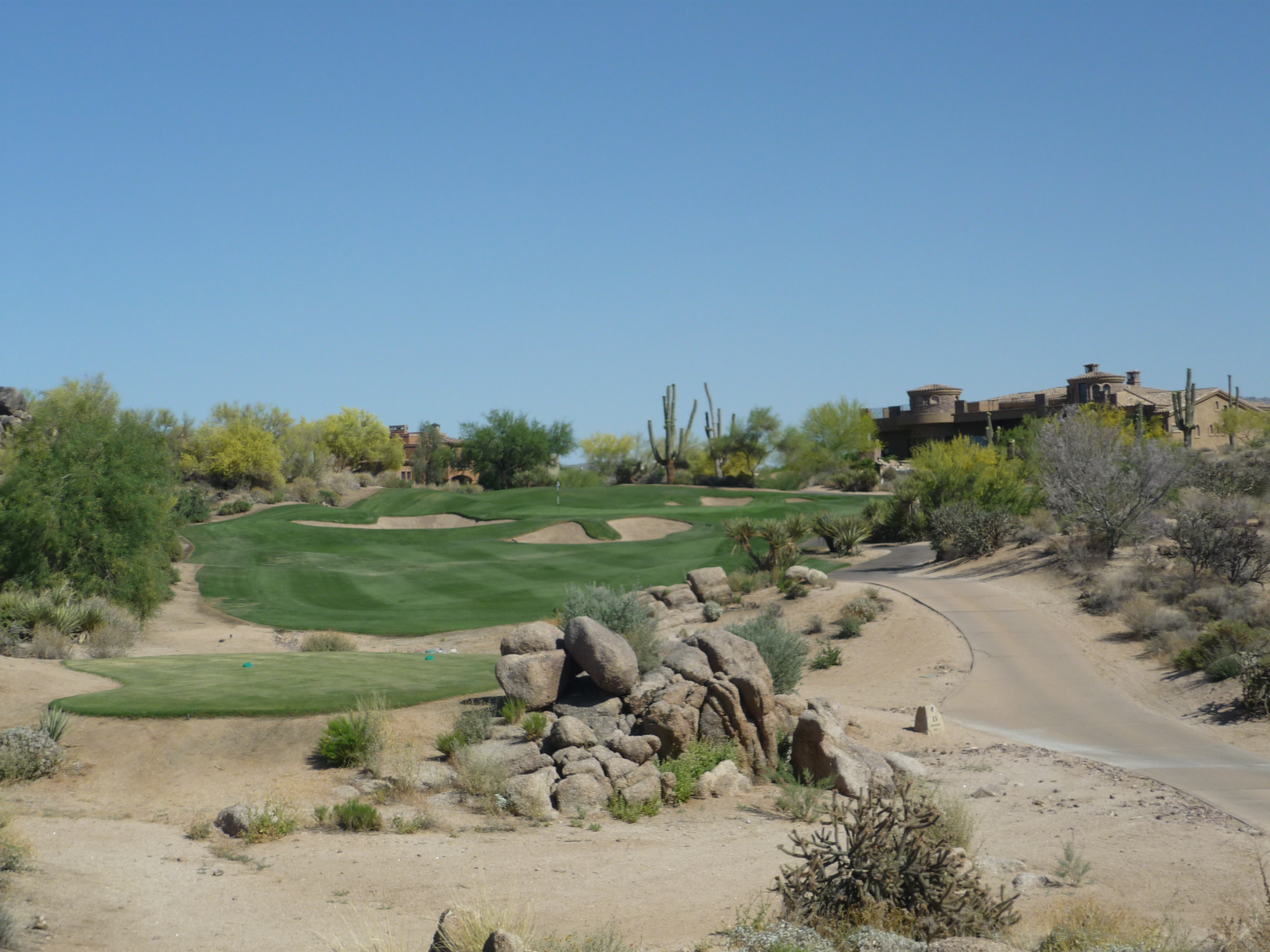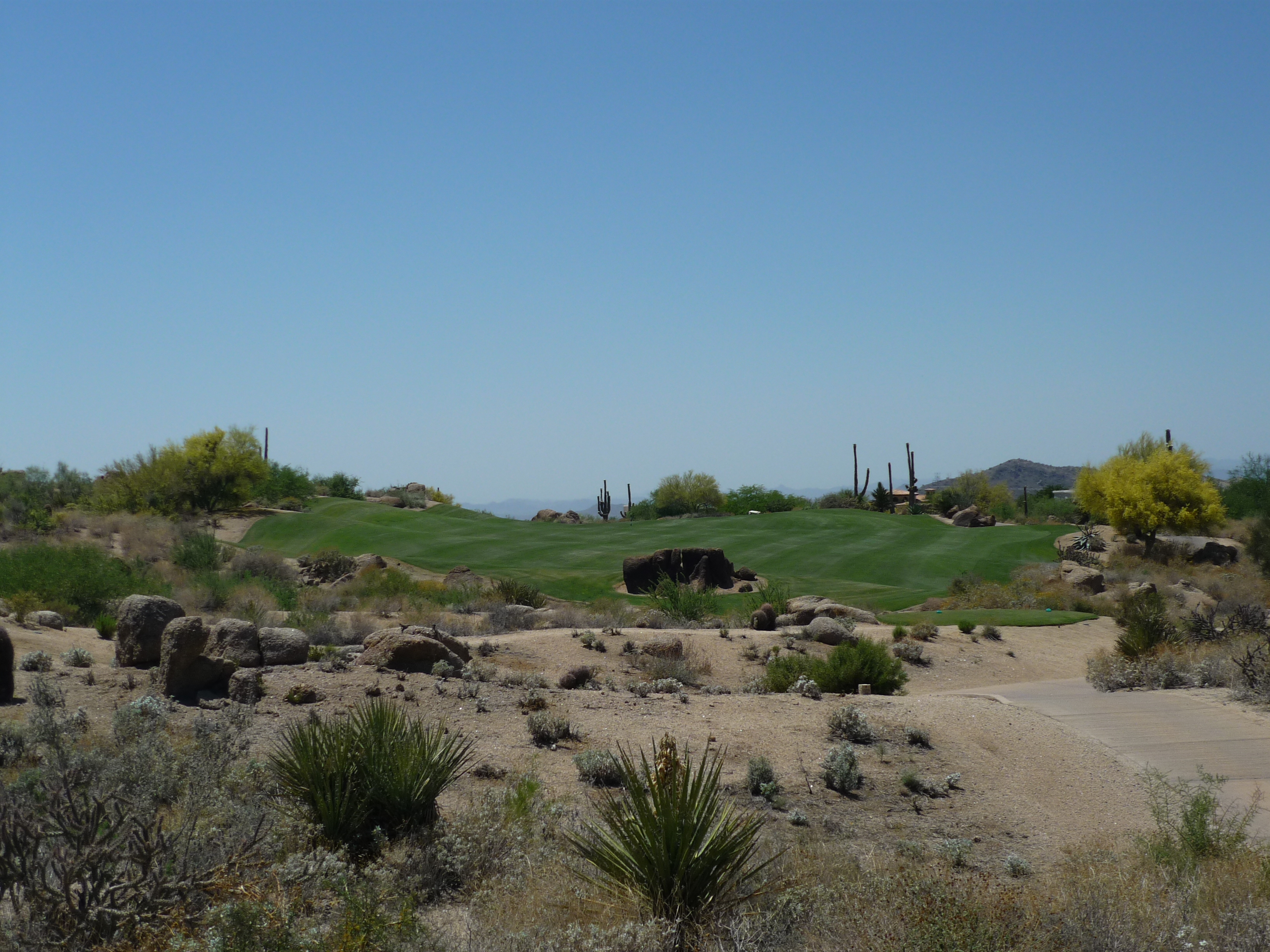 As you turn the corner the desert runs across the fairway and makes you think on a layup. Once past that area there isn’t much trouble around the green.