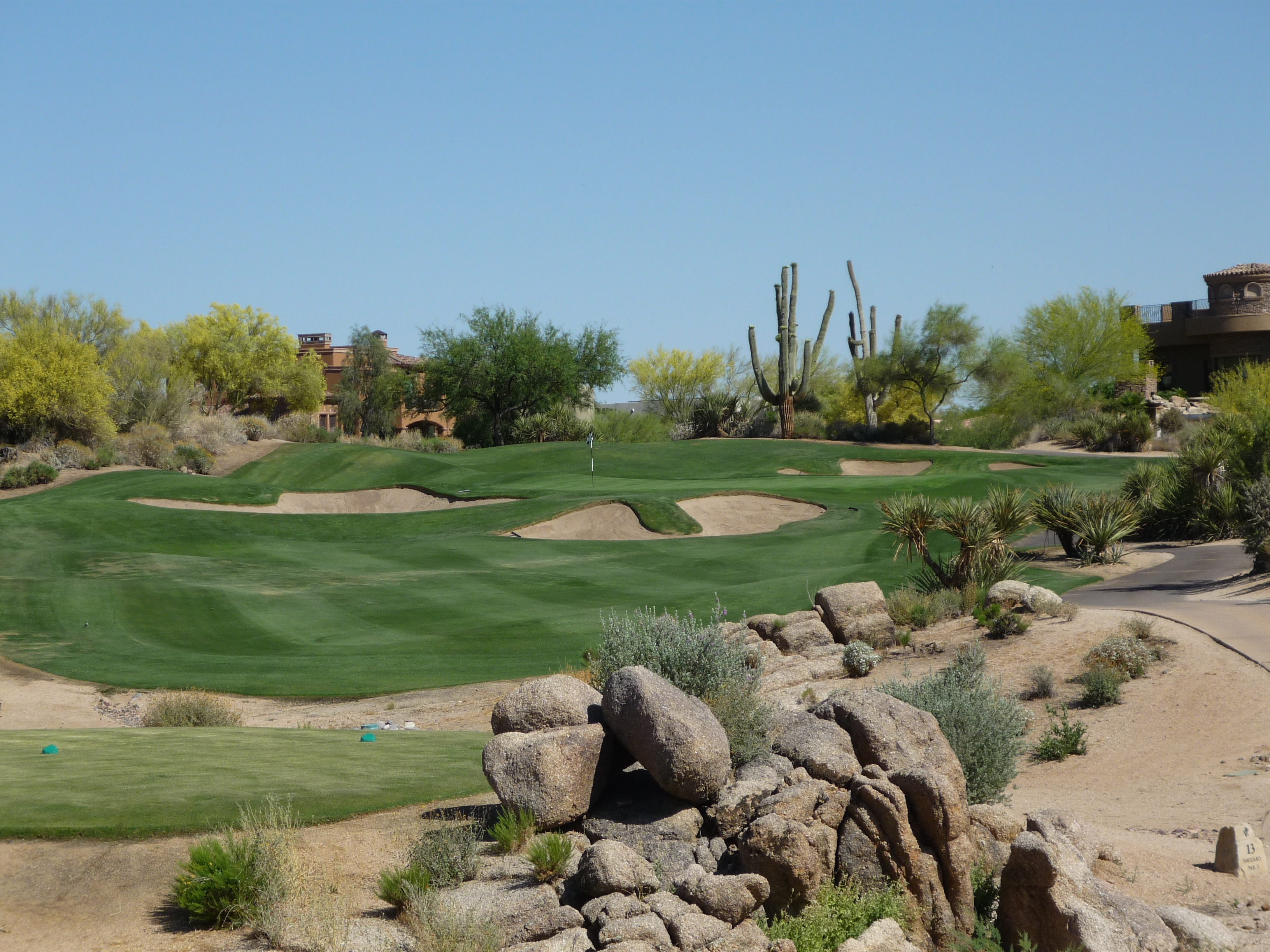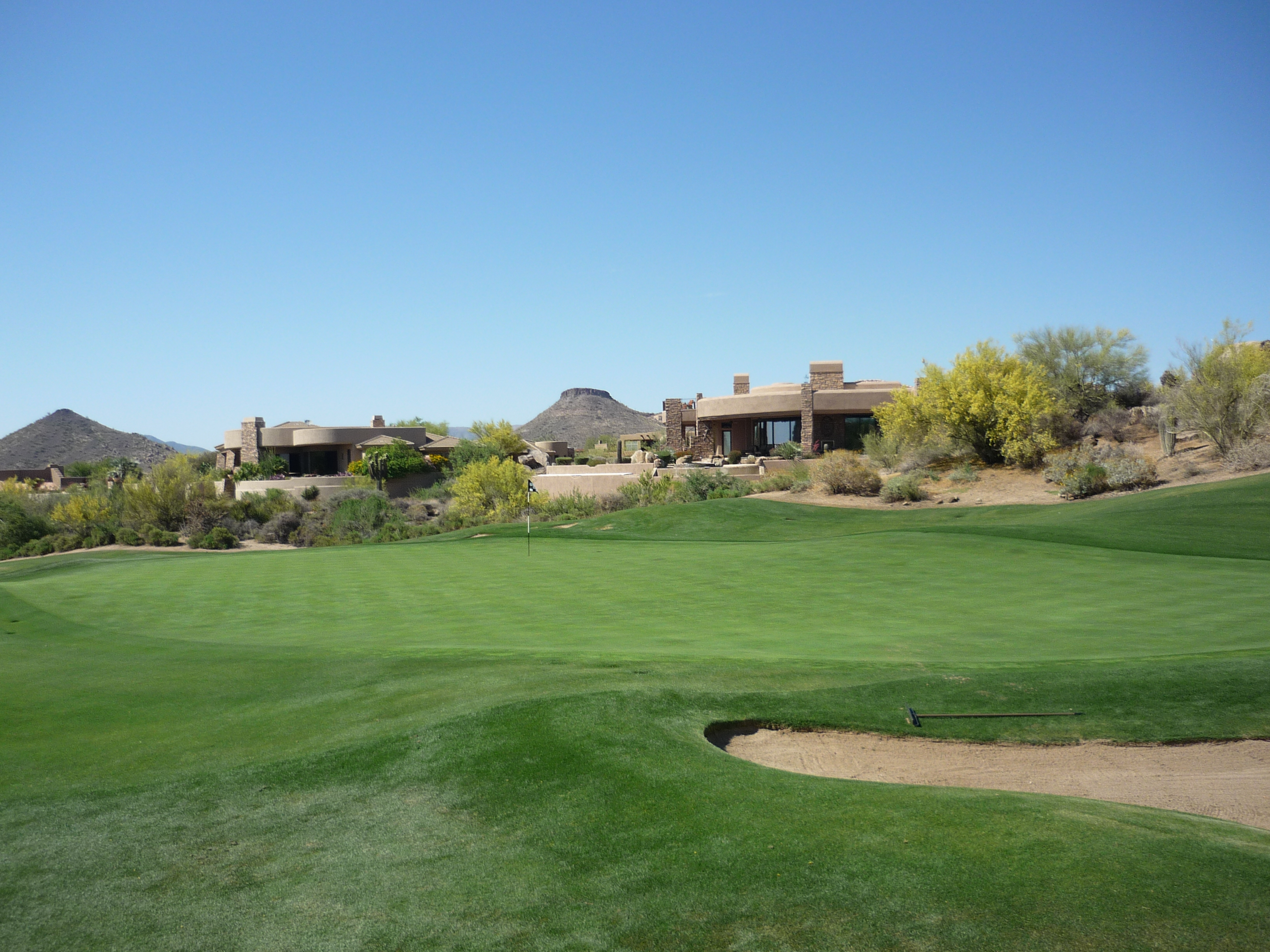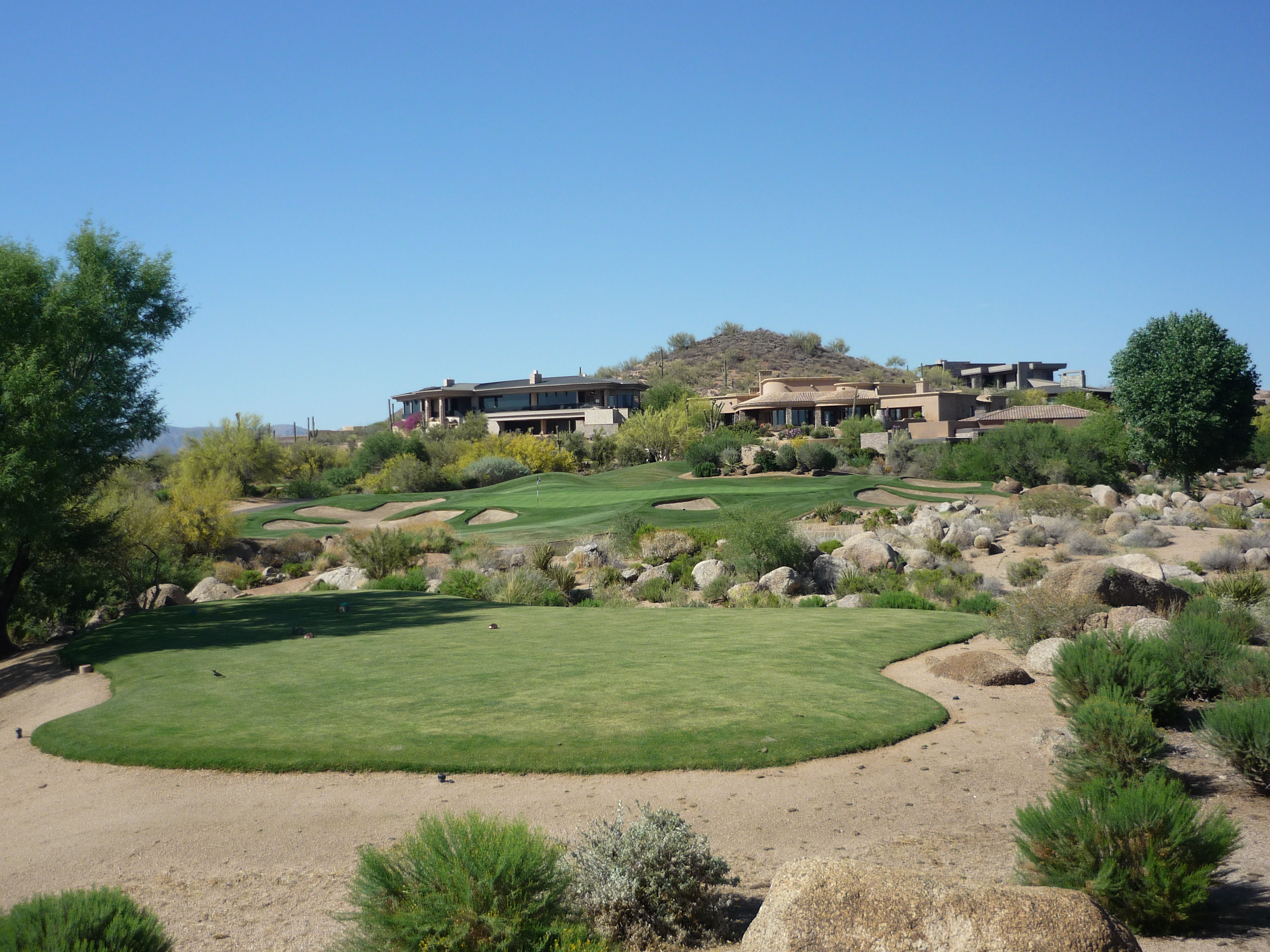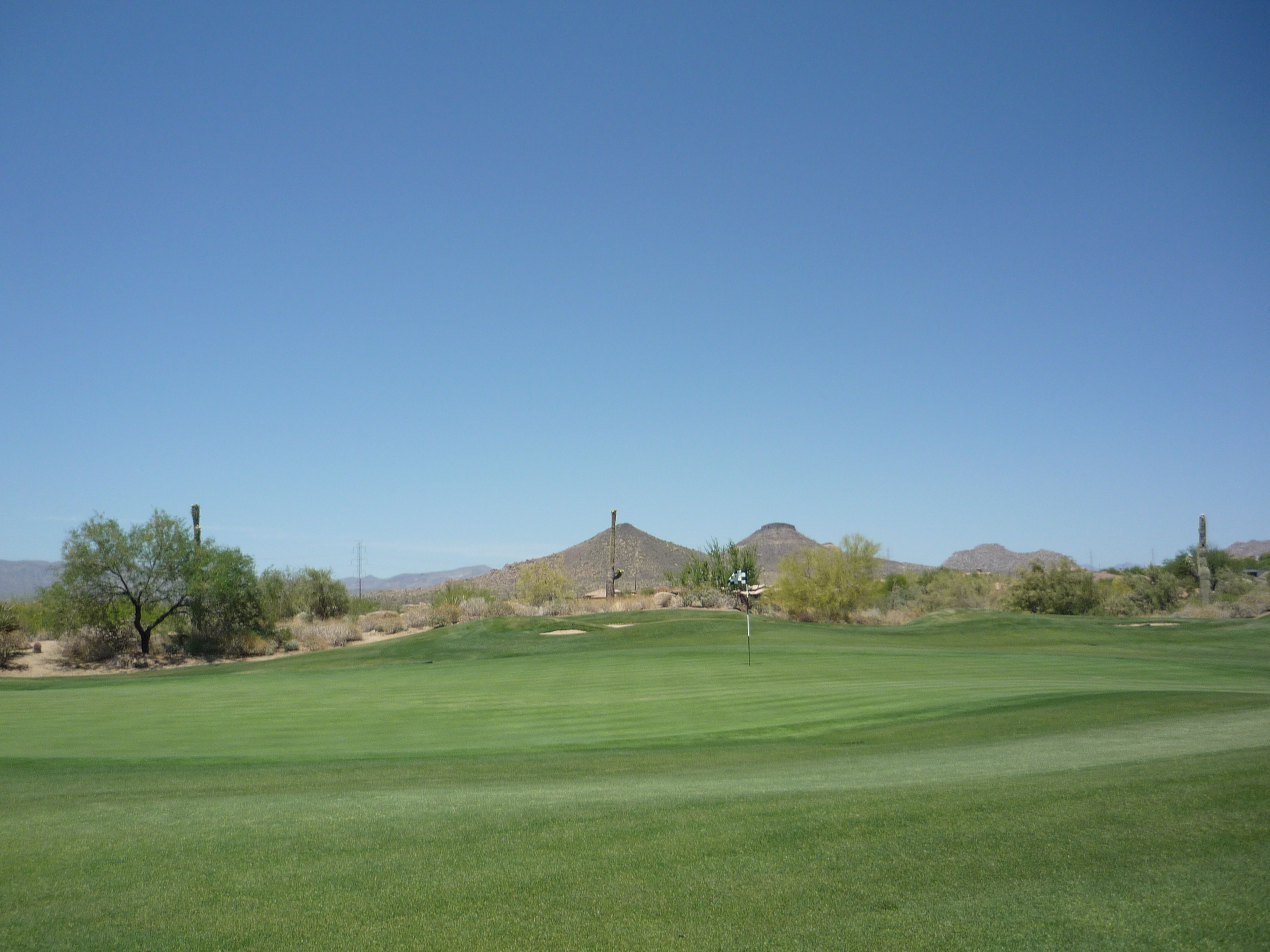 As you turn the corner the desert runs across the fairway and makes you think on a layup. Once past that area there isn’t much trouble around the green.