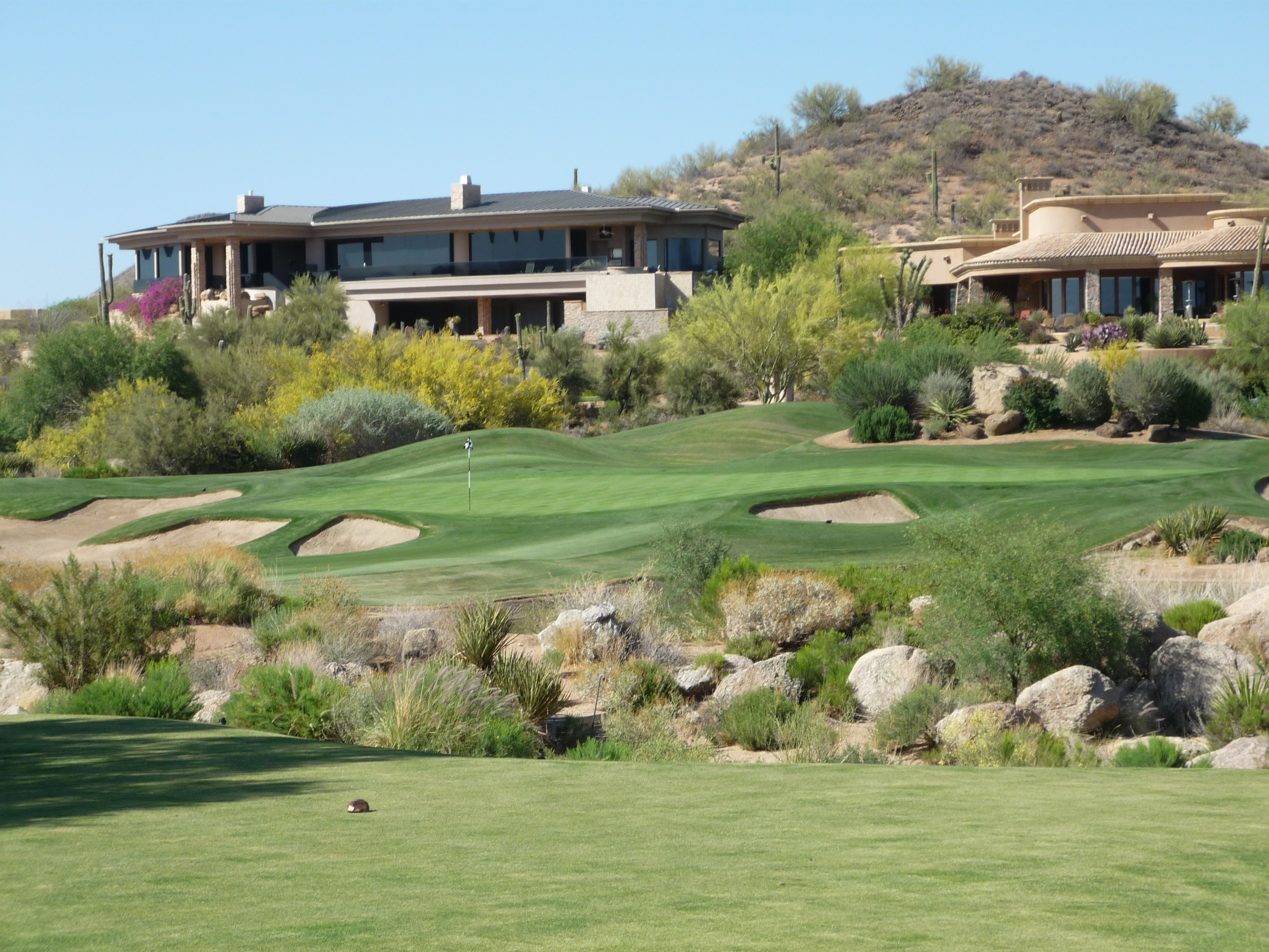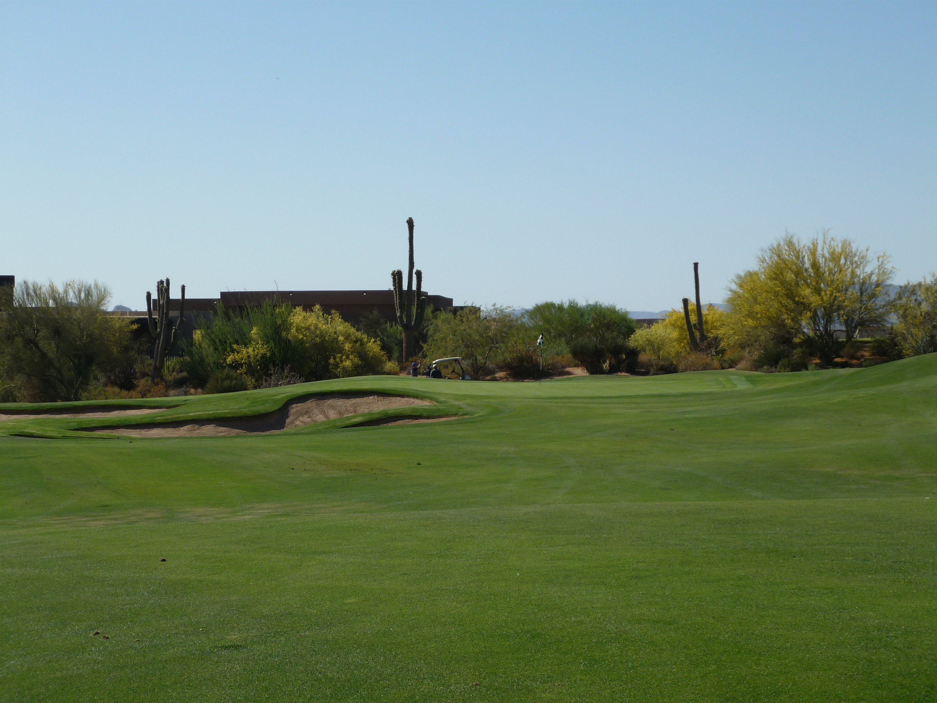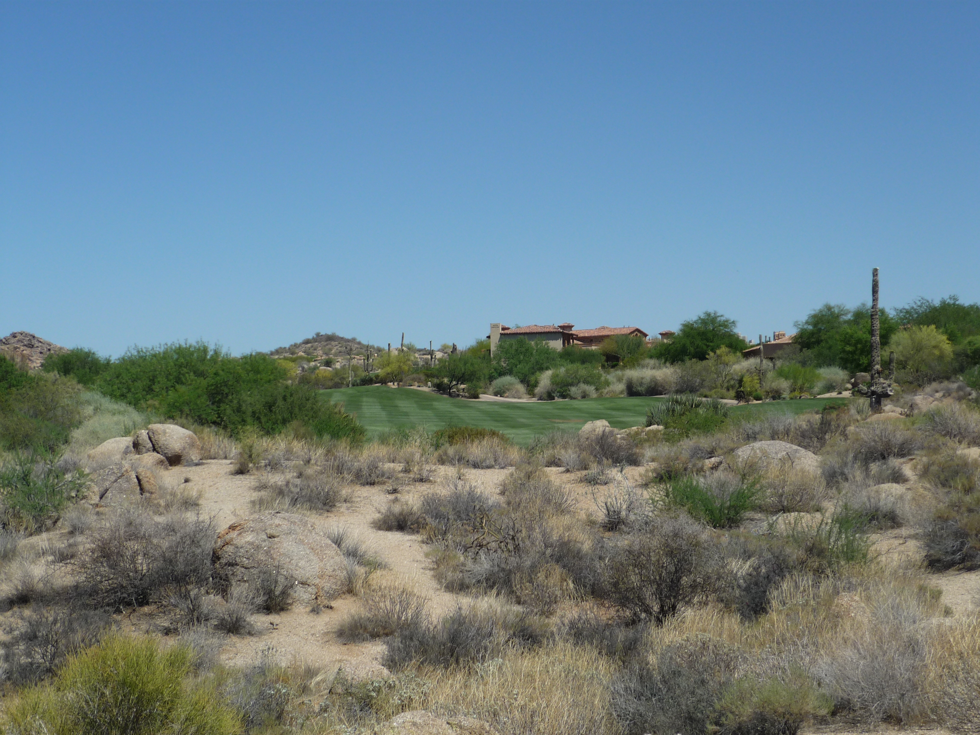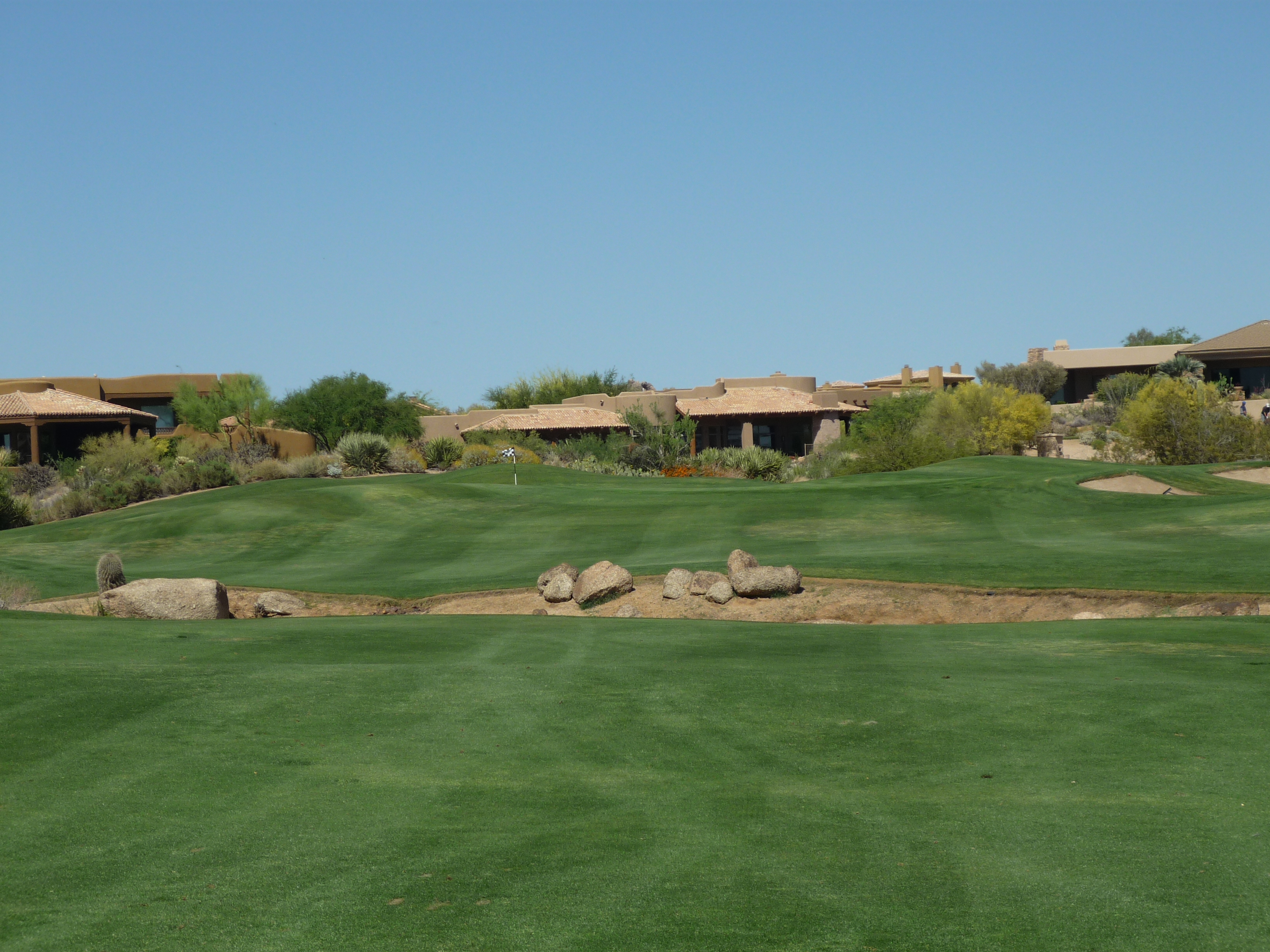 As you turn the corner the desert runs across the fairway and makes you think on a layup. Once past that area there isn’t much trouble around the green.