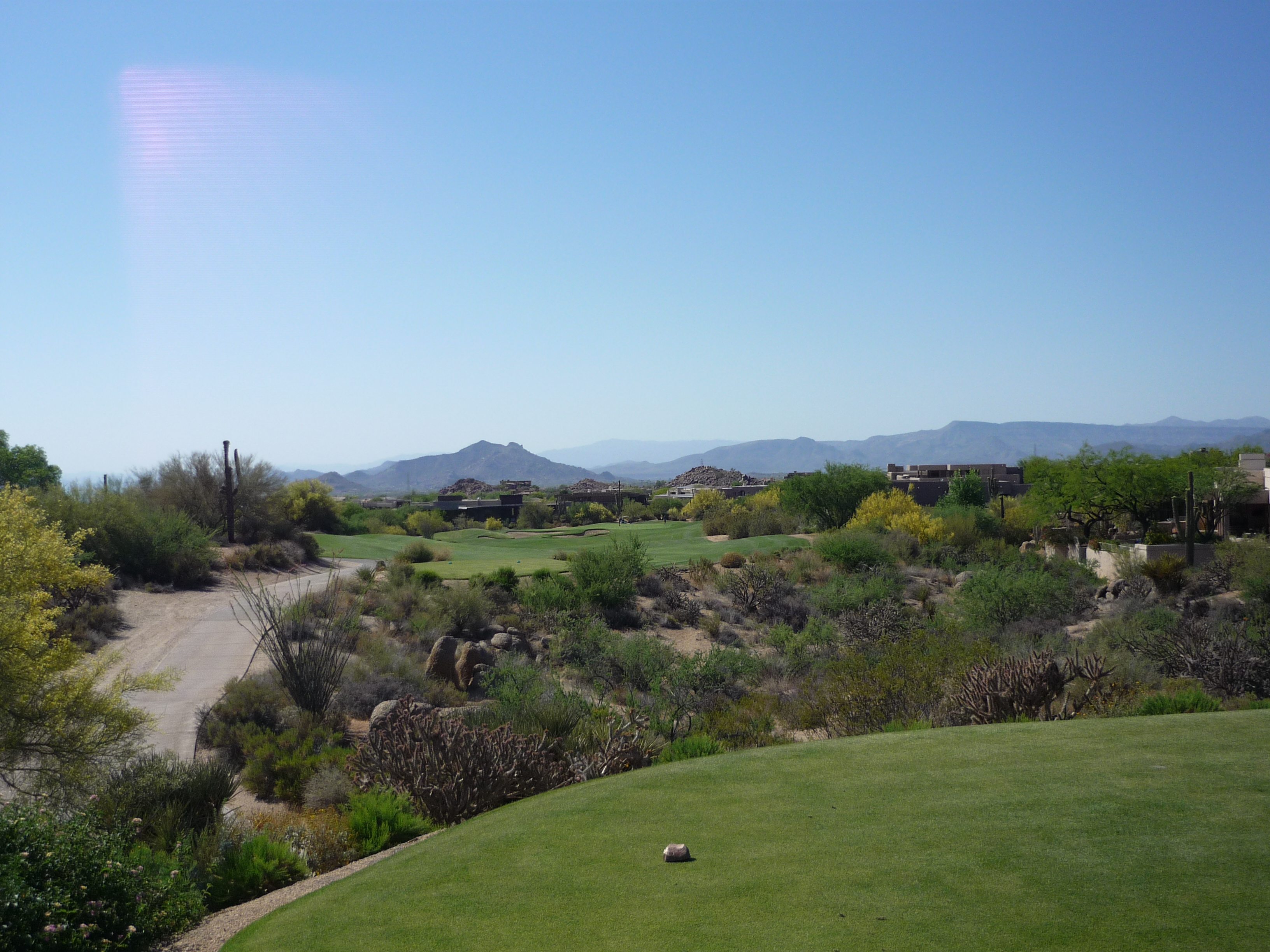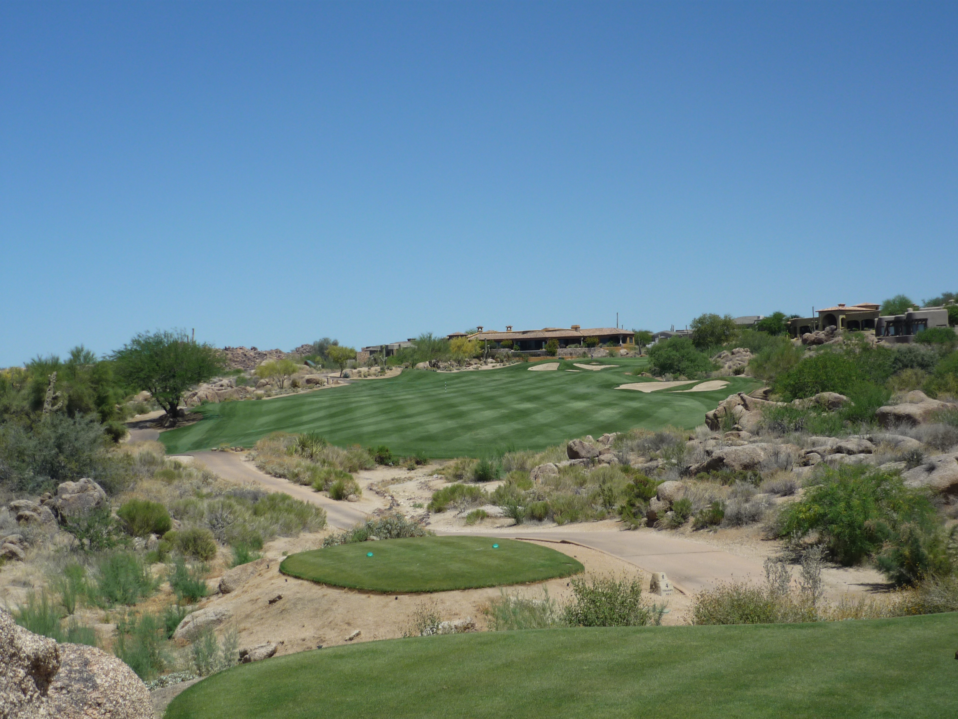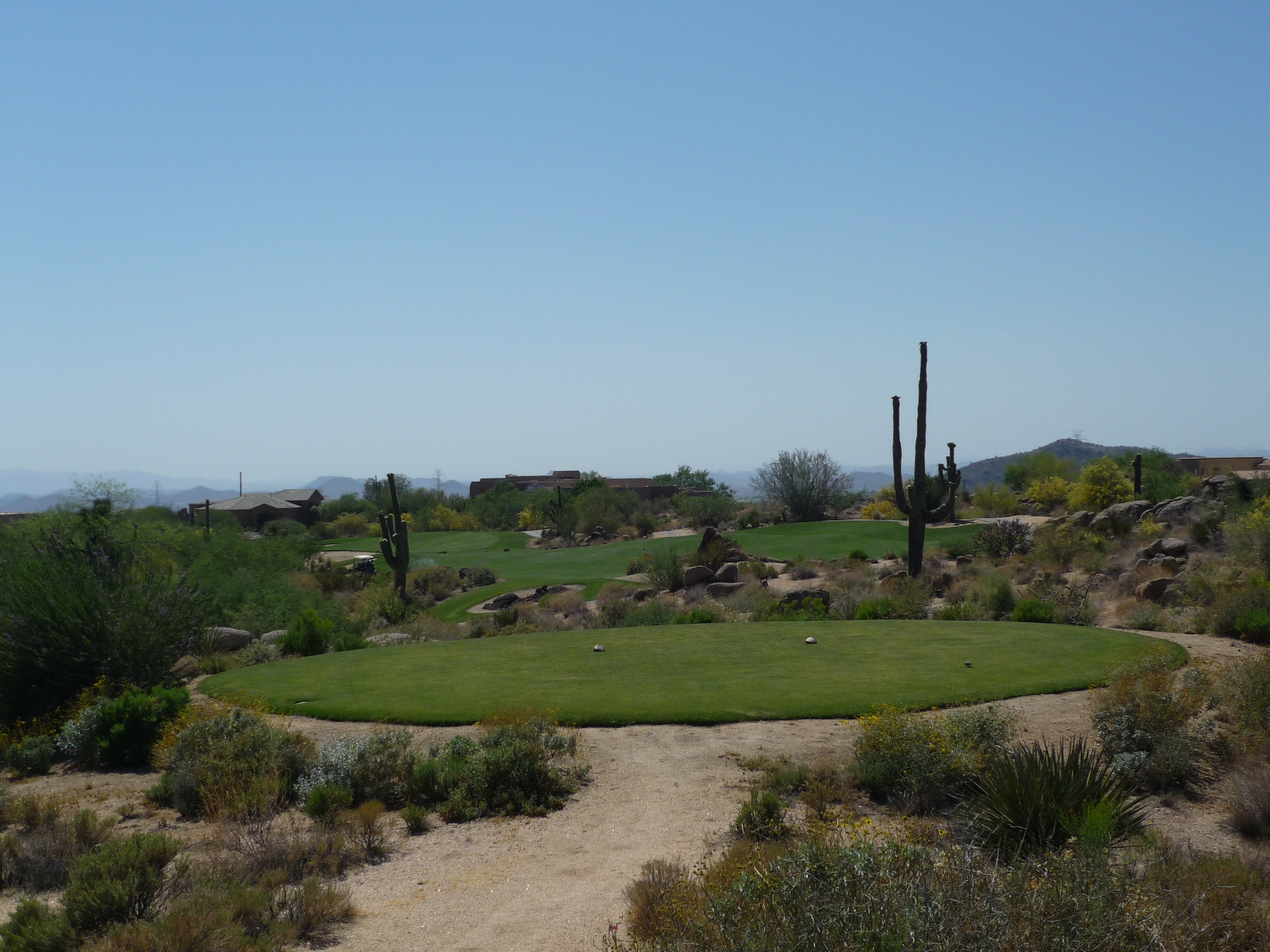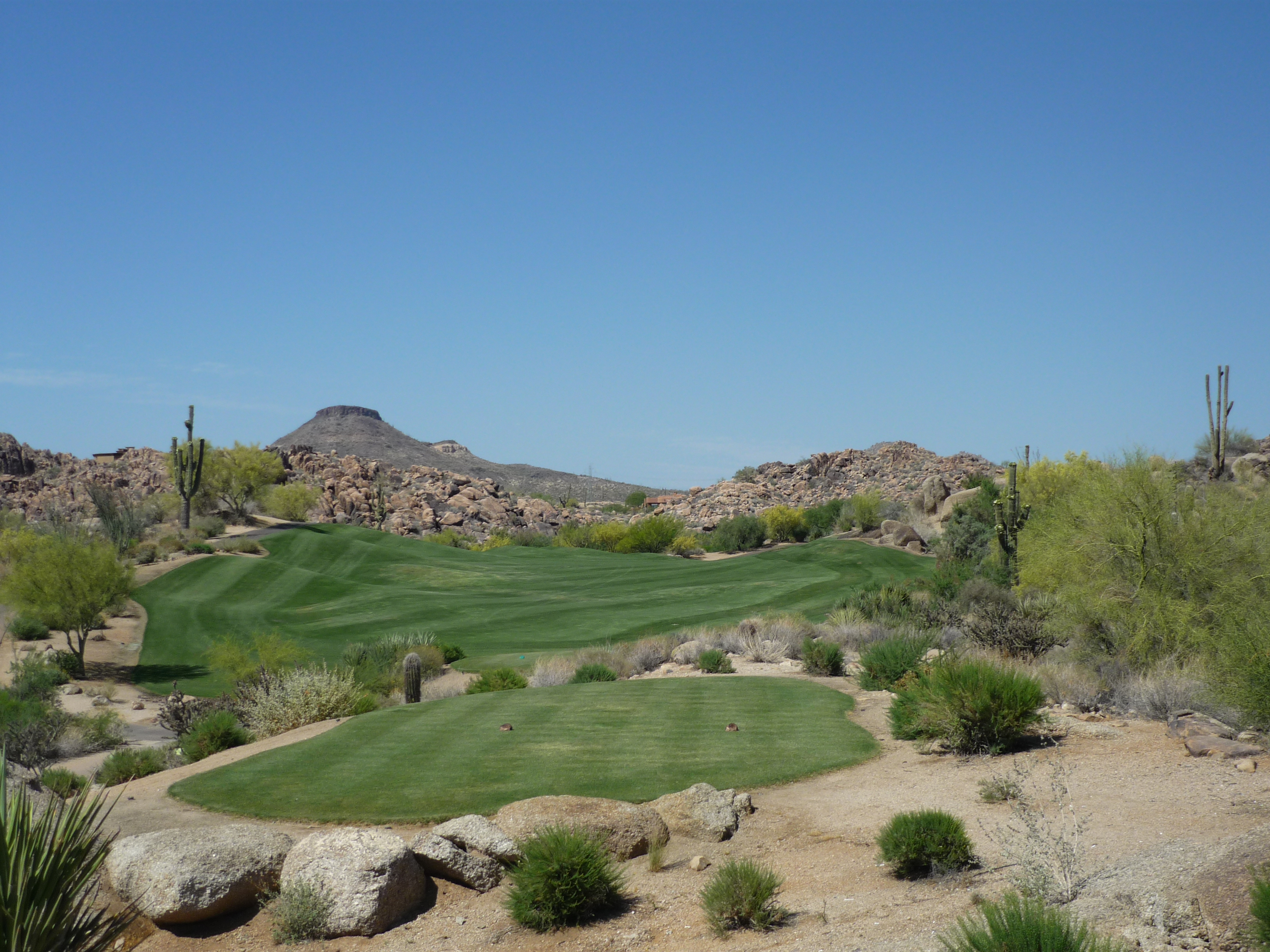 The mountain views here are worth taking a moment to savor. The desert is really vast and impressive. The tee shot is tough with the downhill slope and rocks all along the edges.
