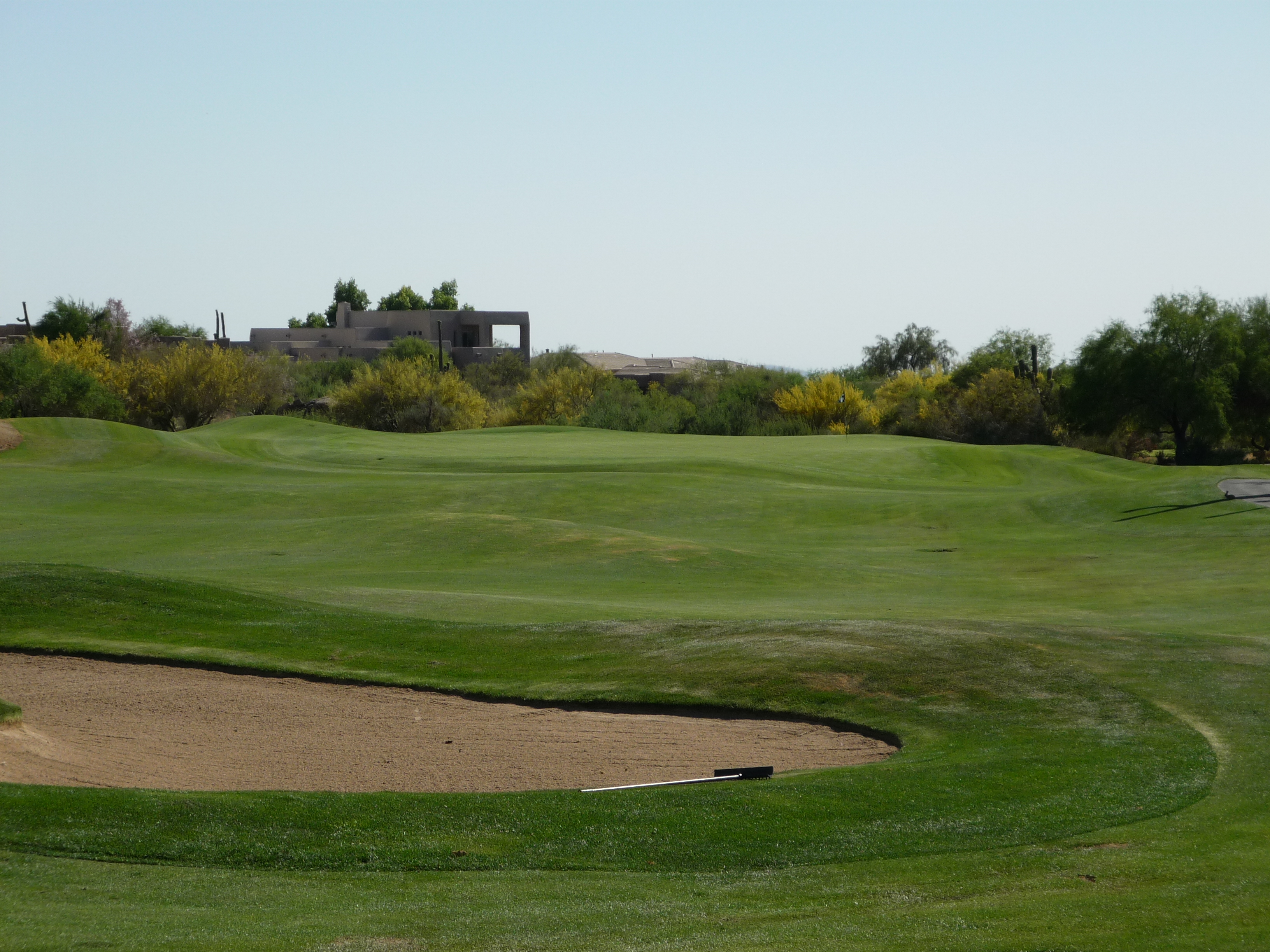 A pretty simple hole here unless you hit it 300+. Another sandy area bisects the fairway short of the green. For normal hitters, this is just a 200 yard shot from the tee. The green is guarded by a bunker on the right but is otherwise open.