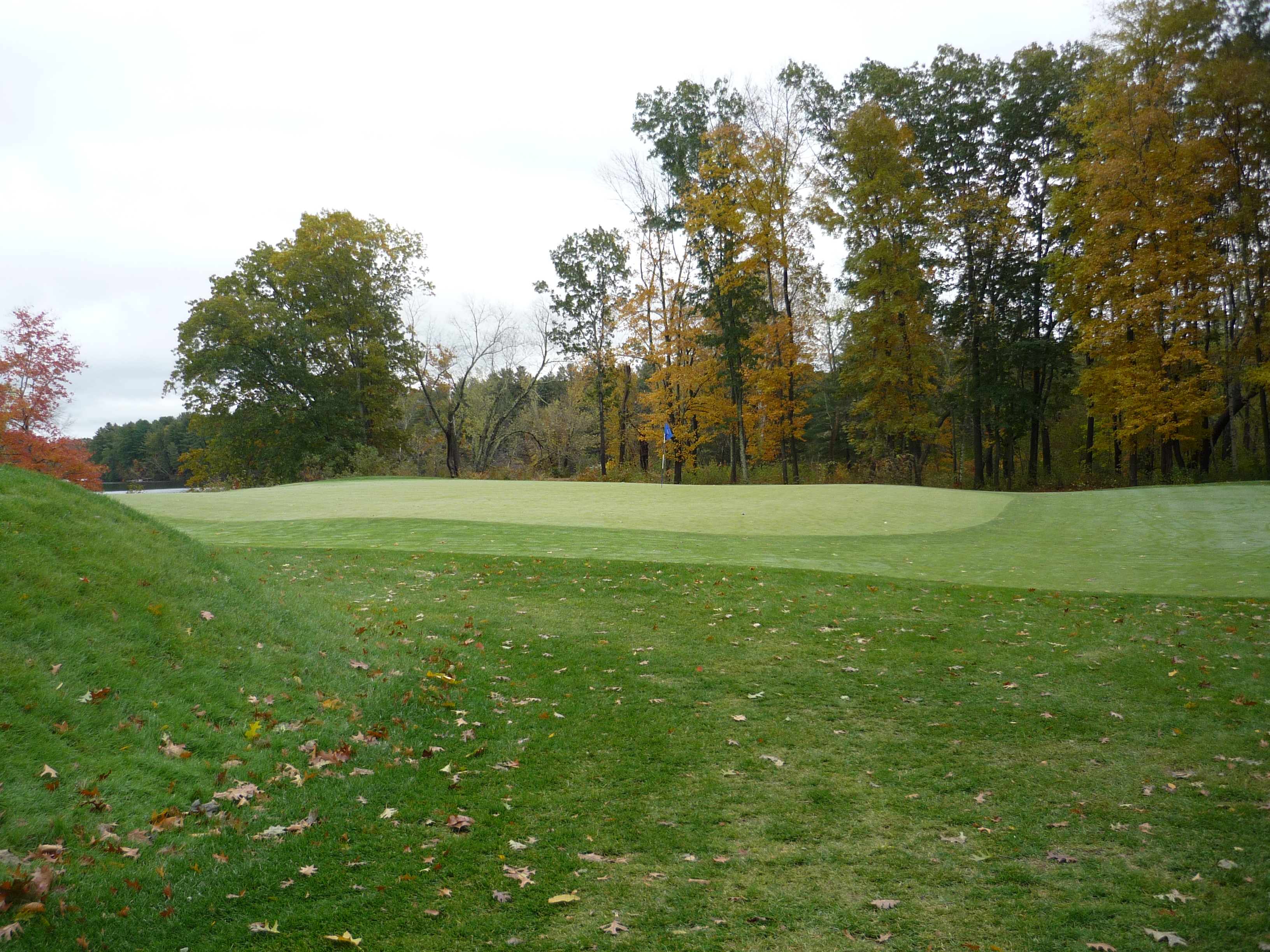 This short one-shotter plays over a portion of the river. The water is only in play if you duff one. The green is large with a a depression in the middle that continues to the higher back tier.