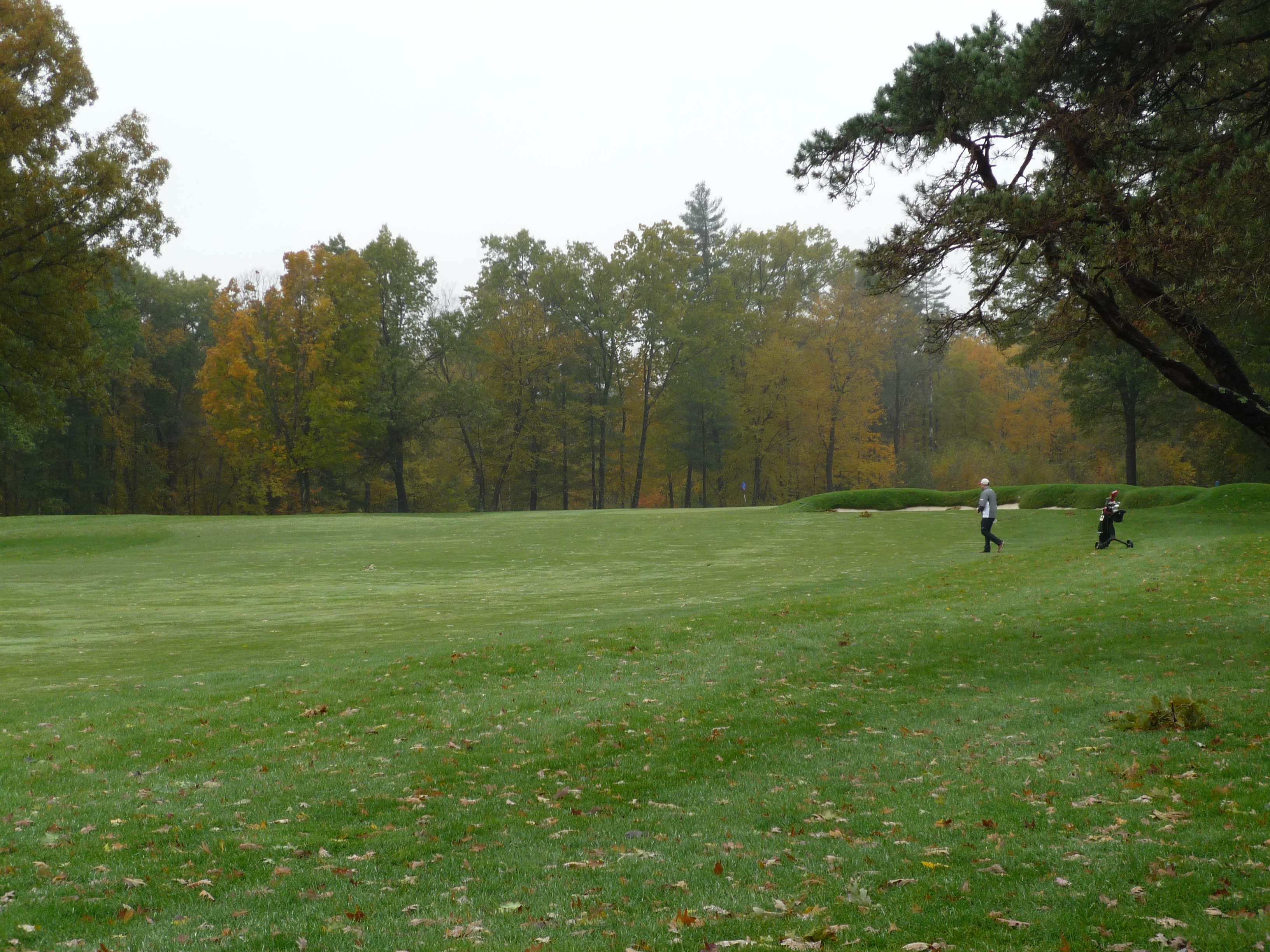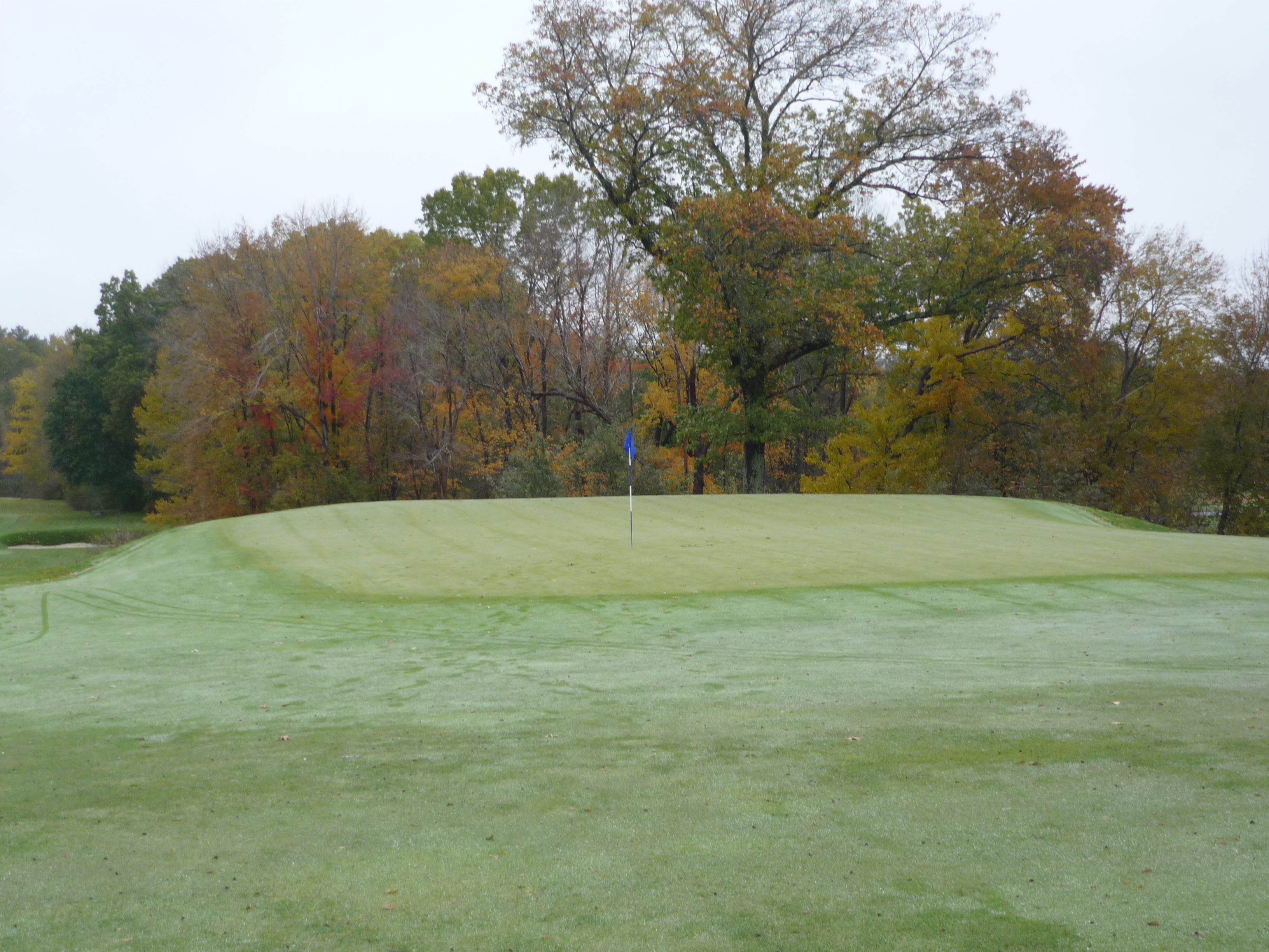 Number nine is a beast, especially on a cool day. The green is a big target but the hill in front will repel anything short. We had a bit of a sucker pin near the left bunker.