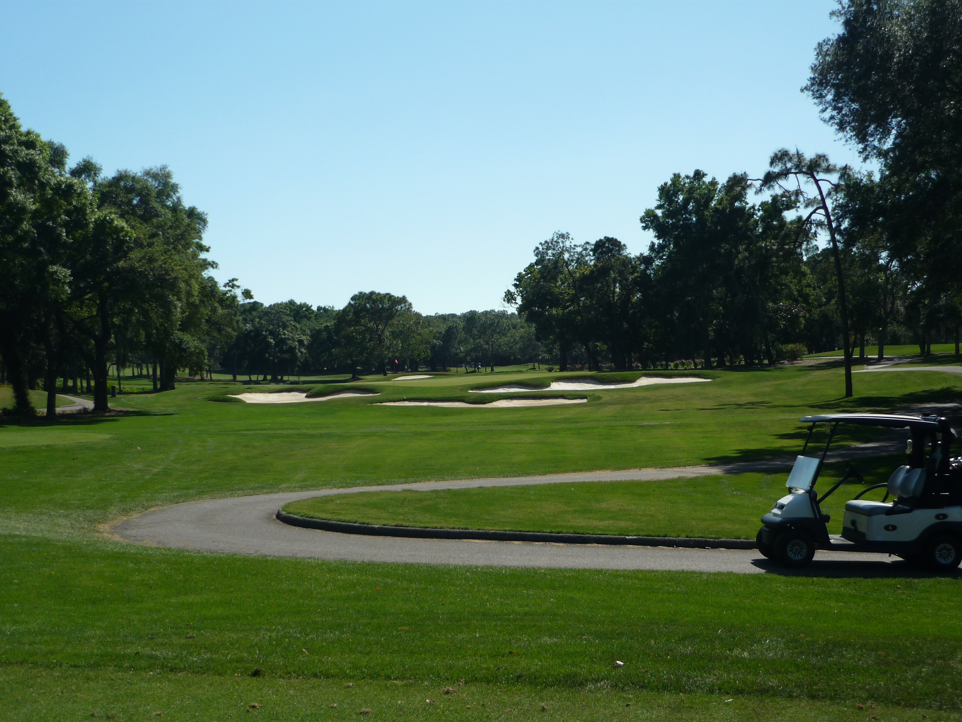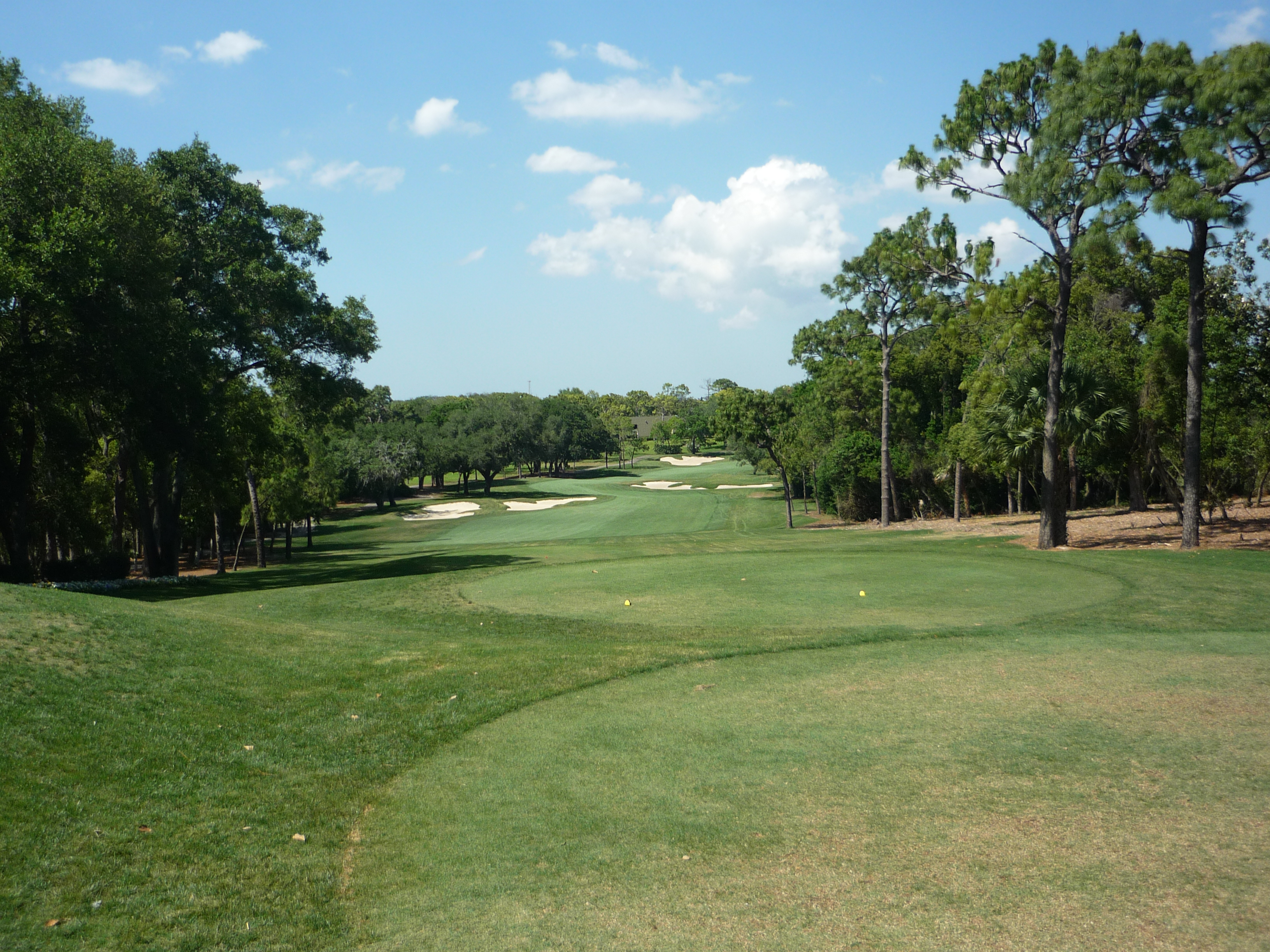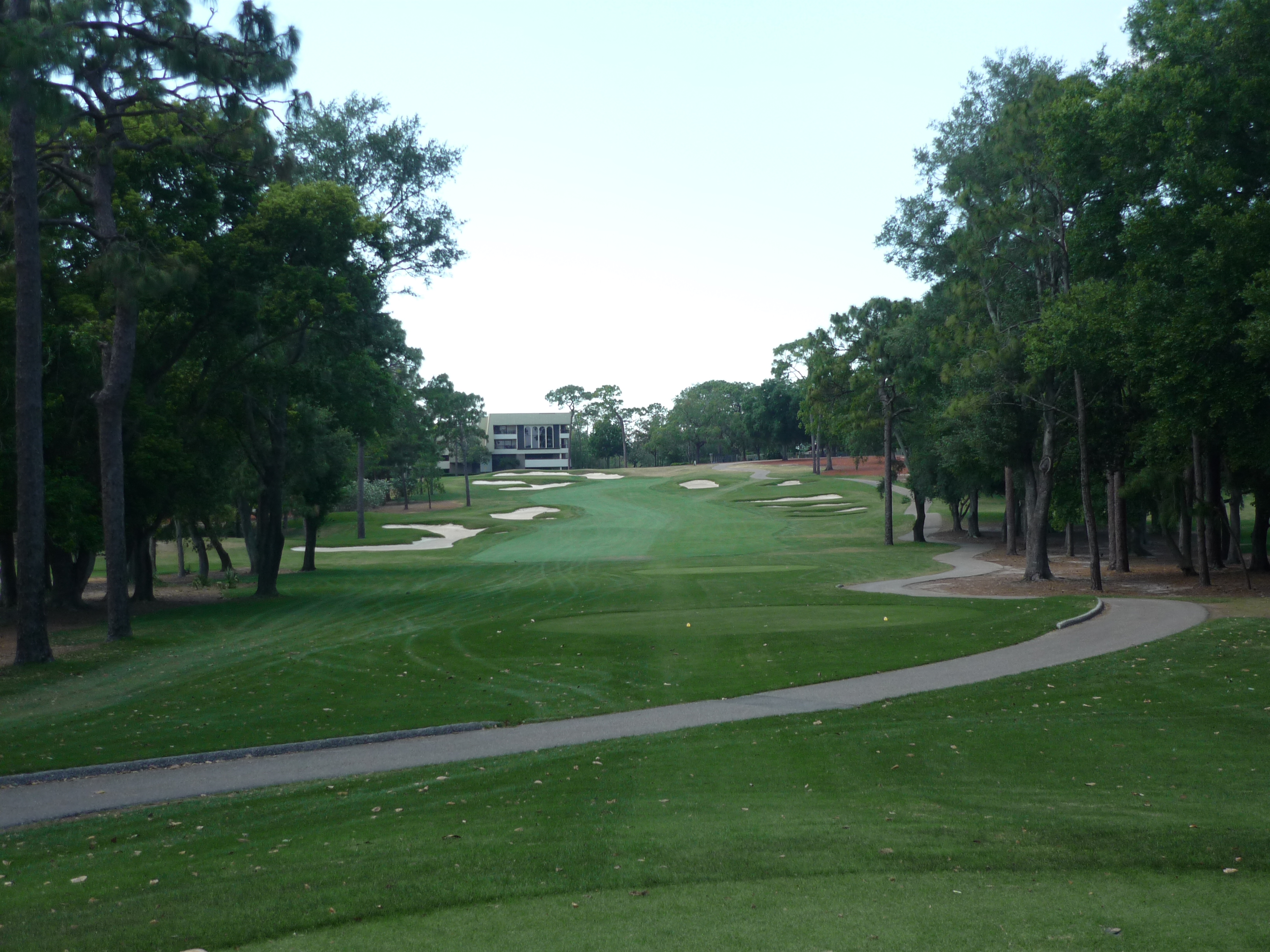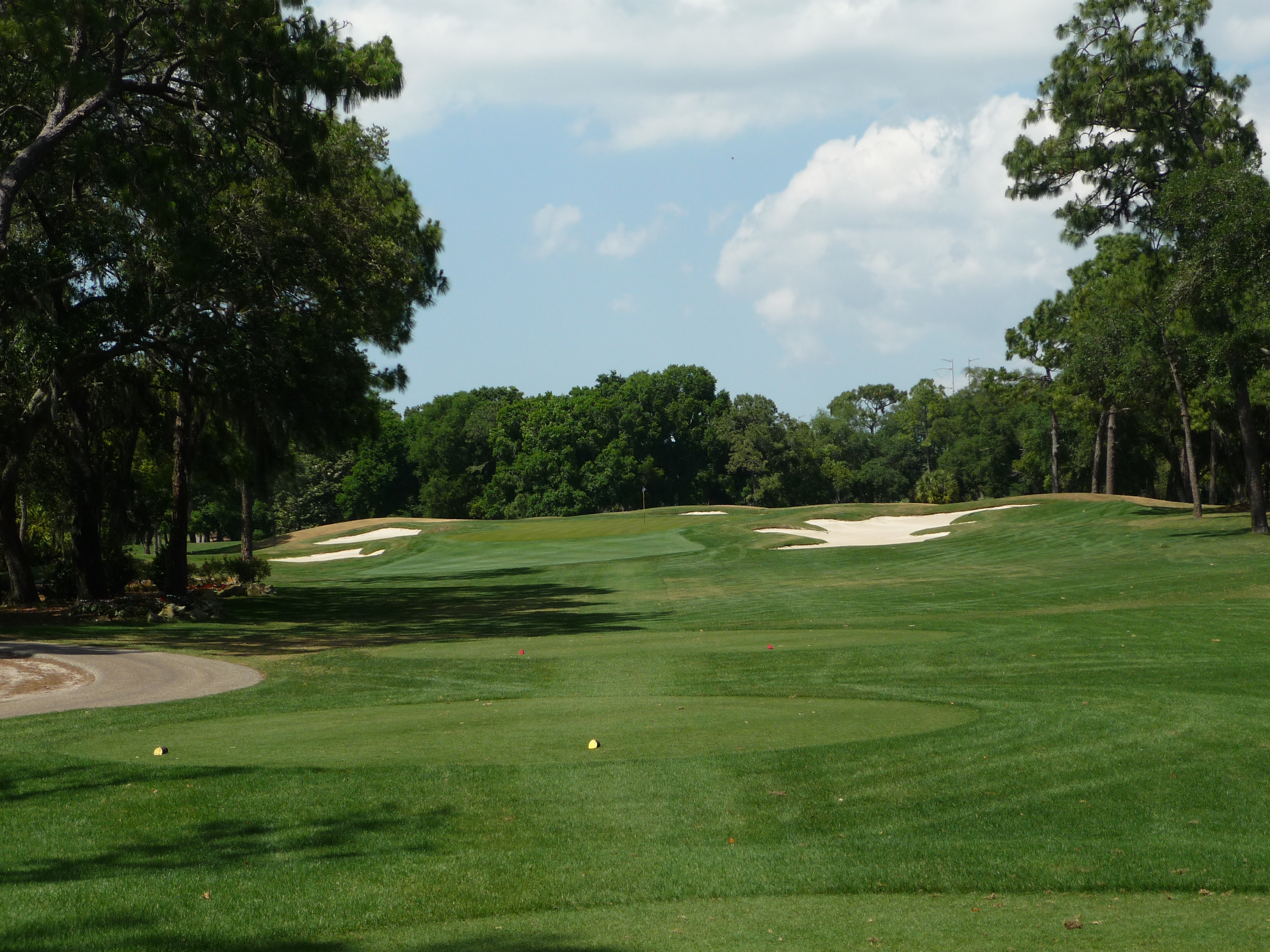 From our tees the hole is more tame but all of the bunkers are in play. Consequently, I made it into the left one but only had a wedge into the green. Finding the fairway is more important than distance.