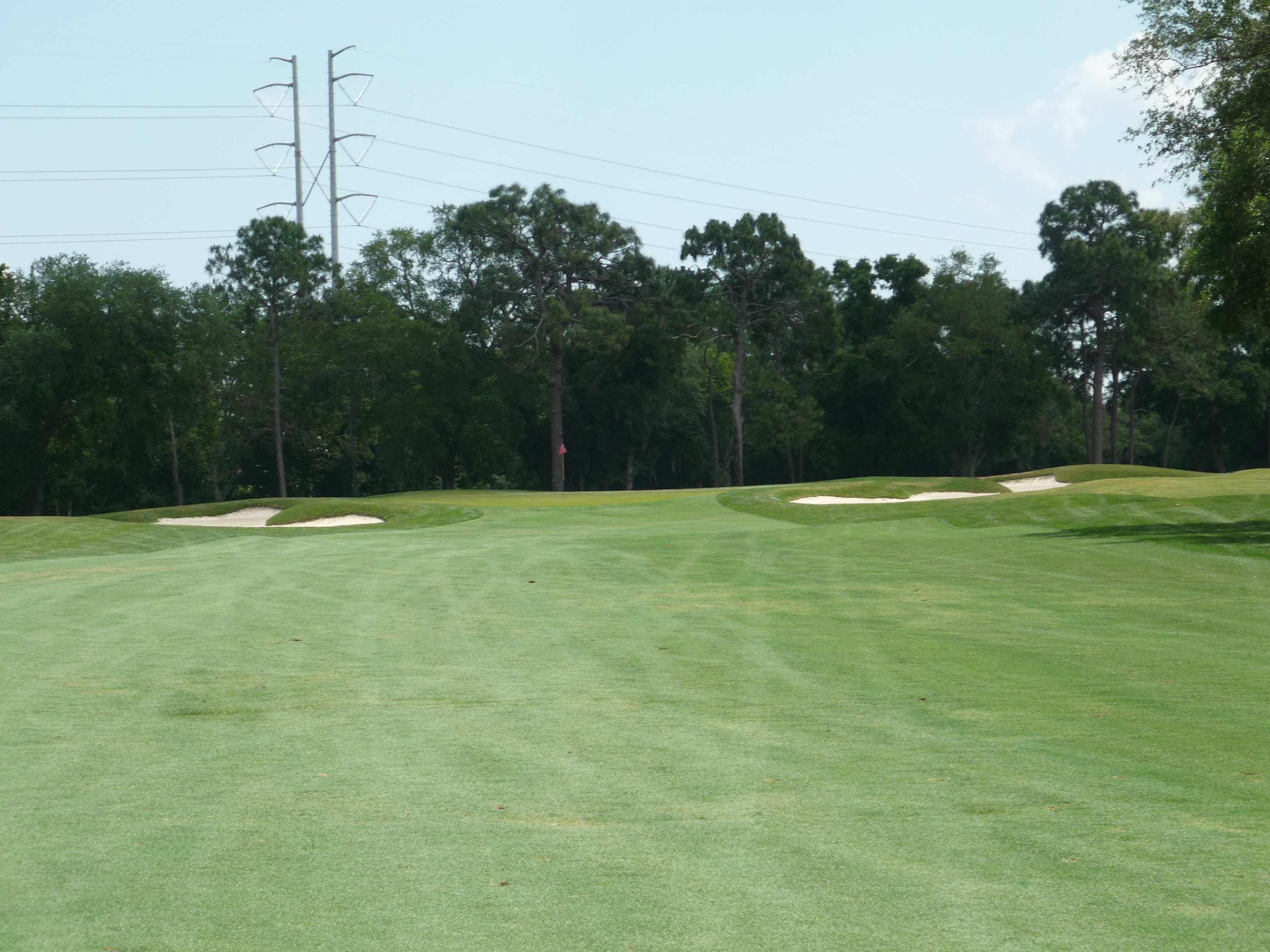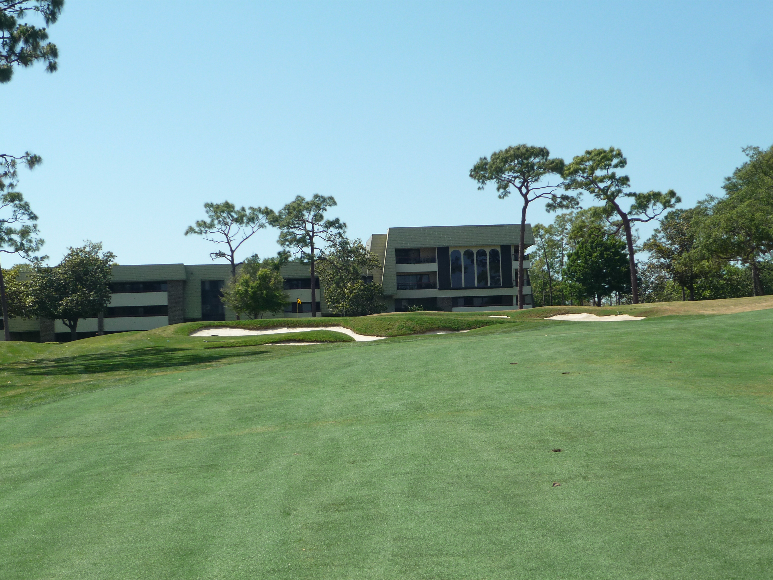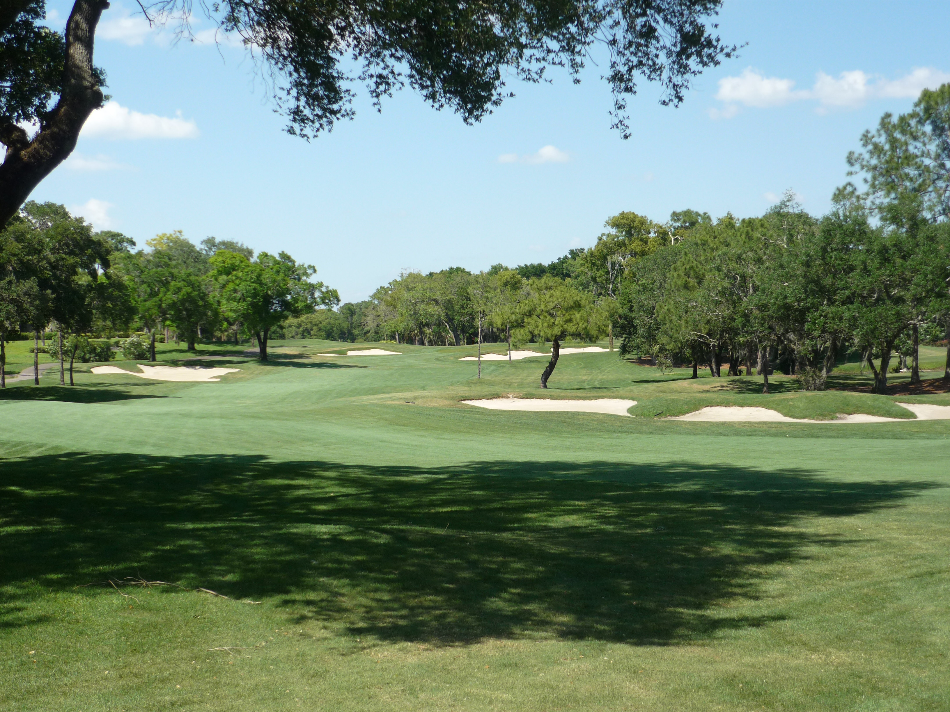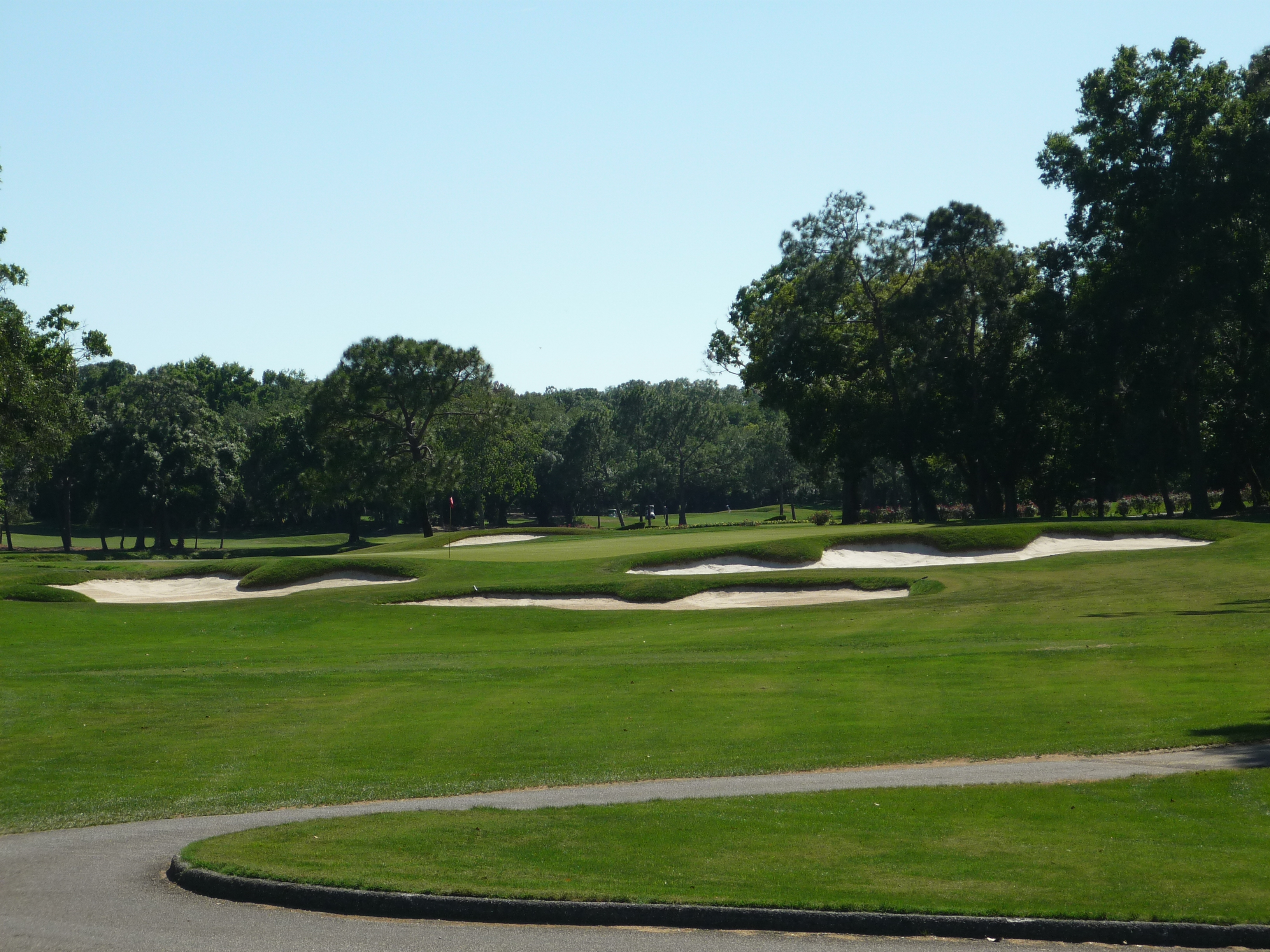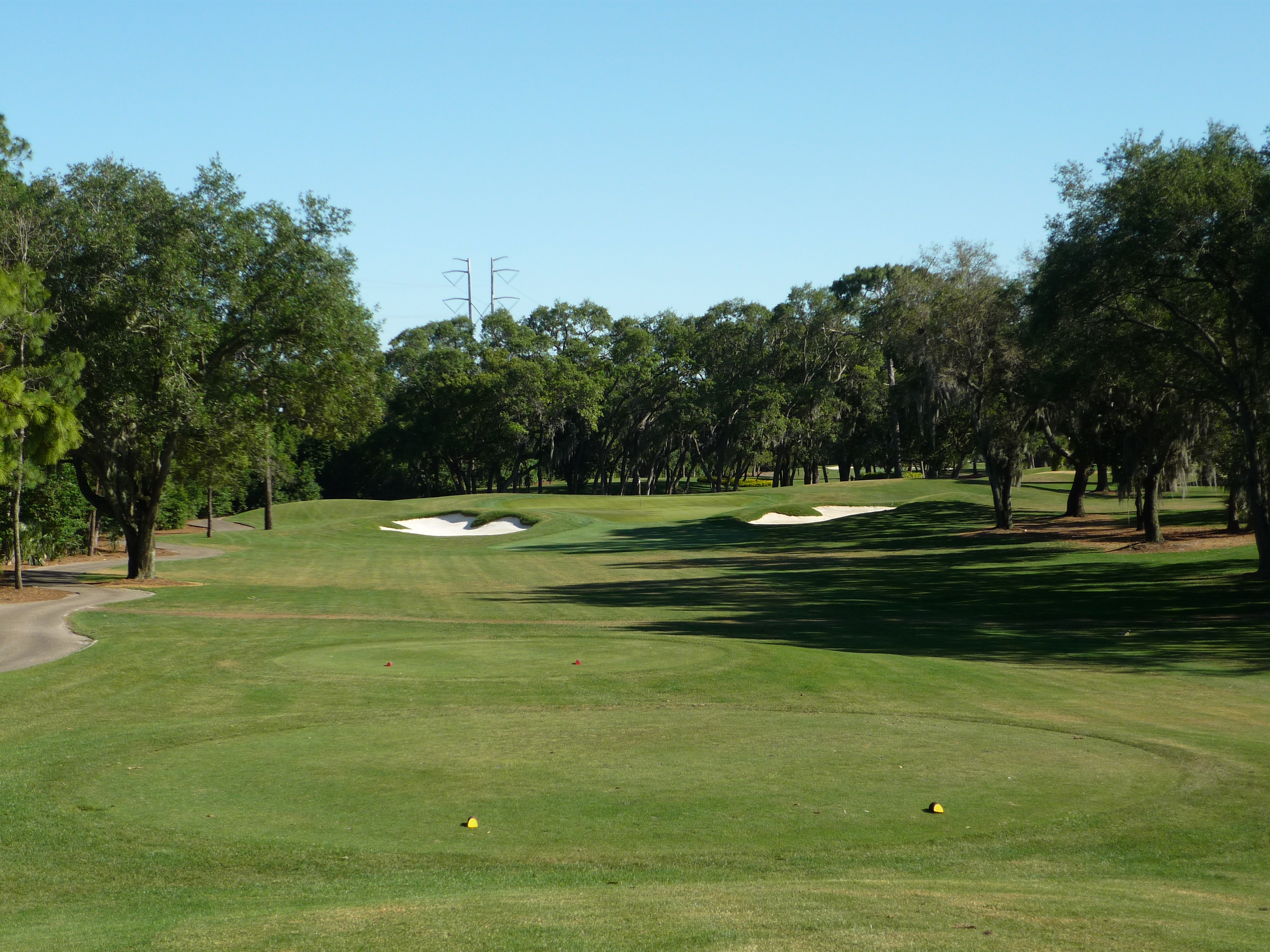 From our tees the hole is more tame but all of the bunkers are in play. Consequently, I made it into the left one but only had a wedge into the green. Finding the fairway is more important than distance.