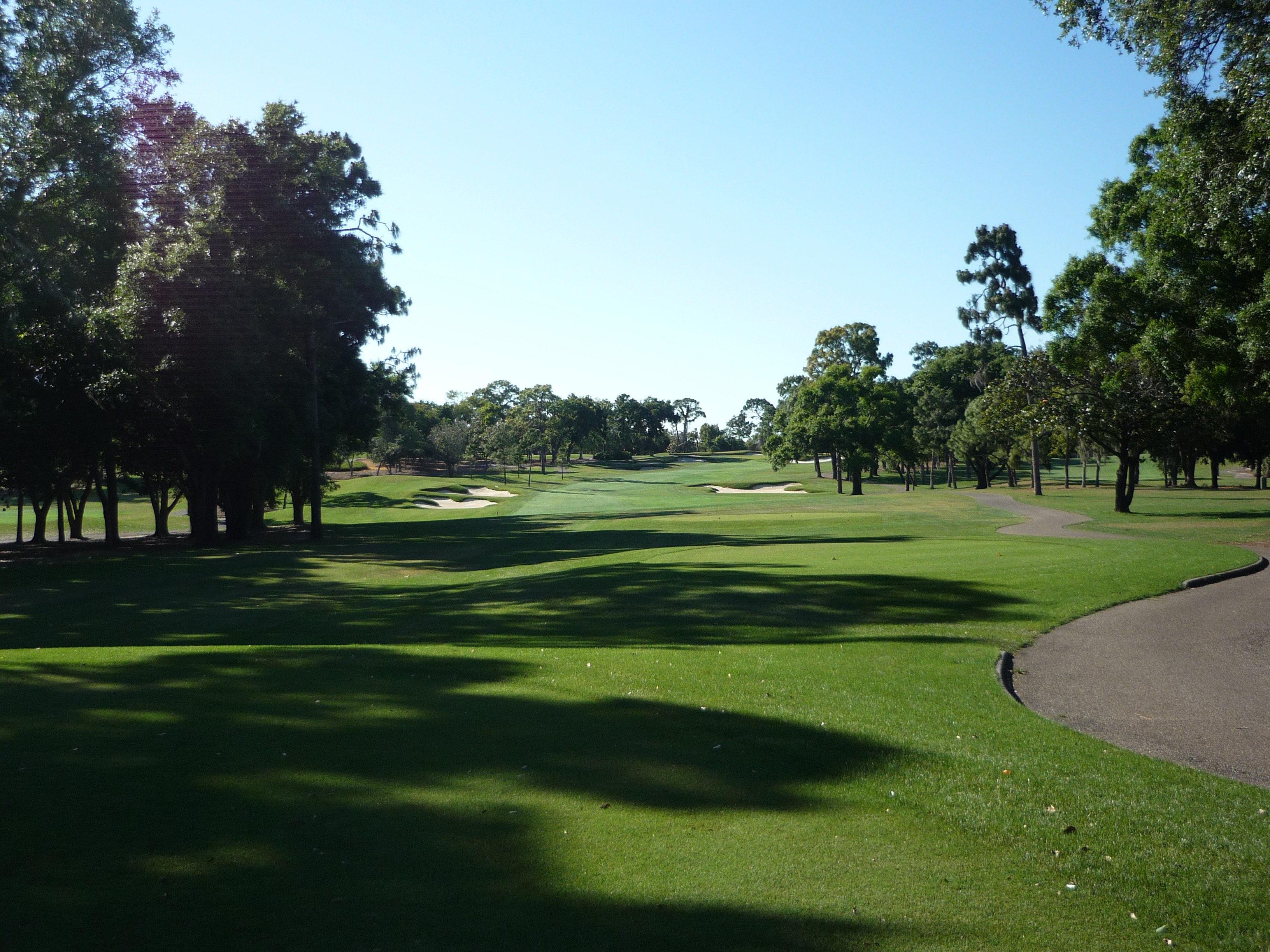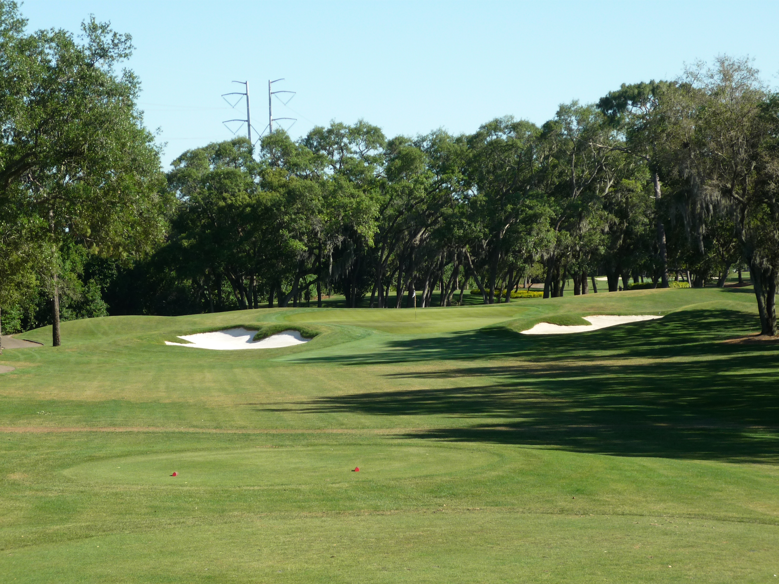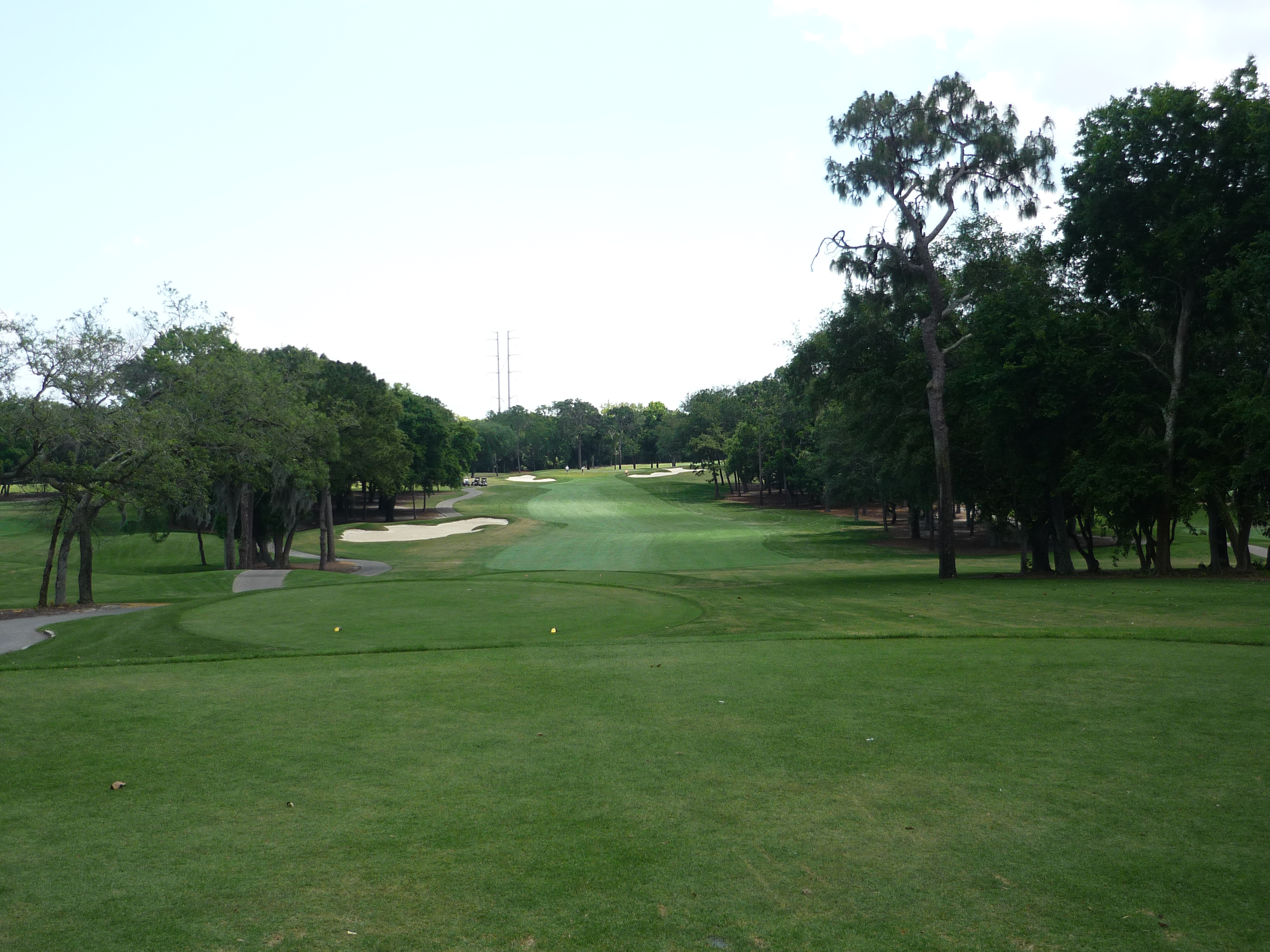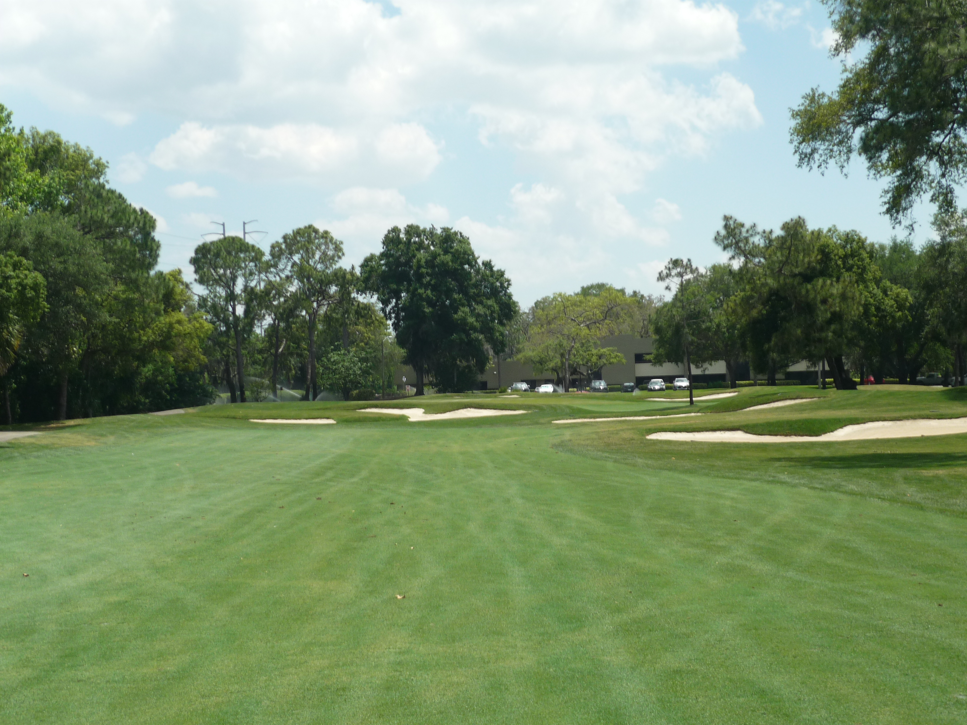 From our tees the hole is more tame but all of the bunkers are in play. Consequently, I made it into the left one but only had a wedge into the green. Finding the fairway is more important than distance.