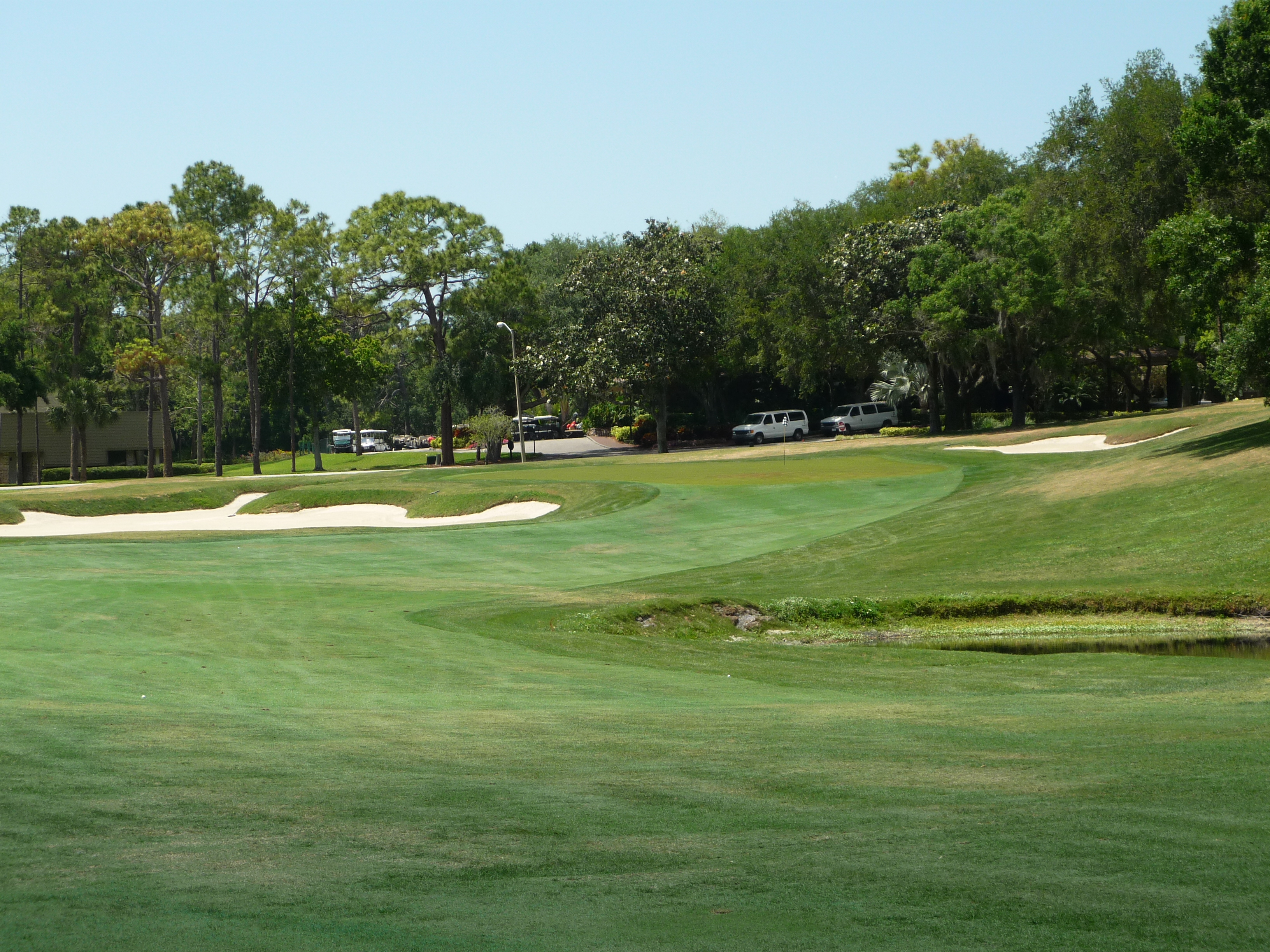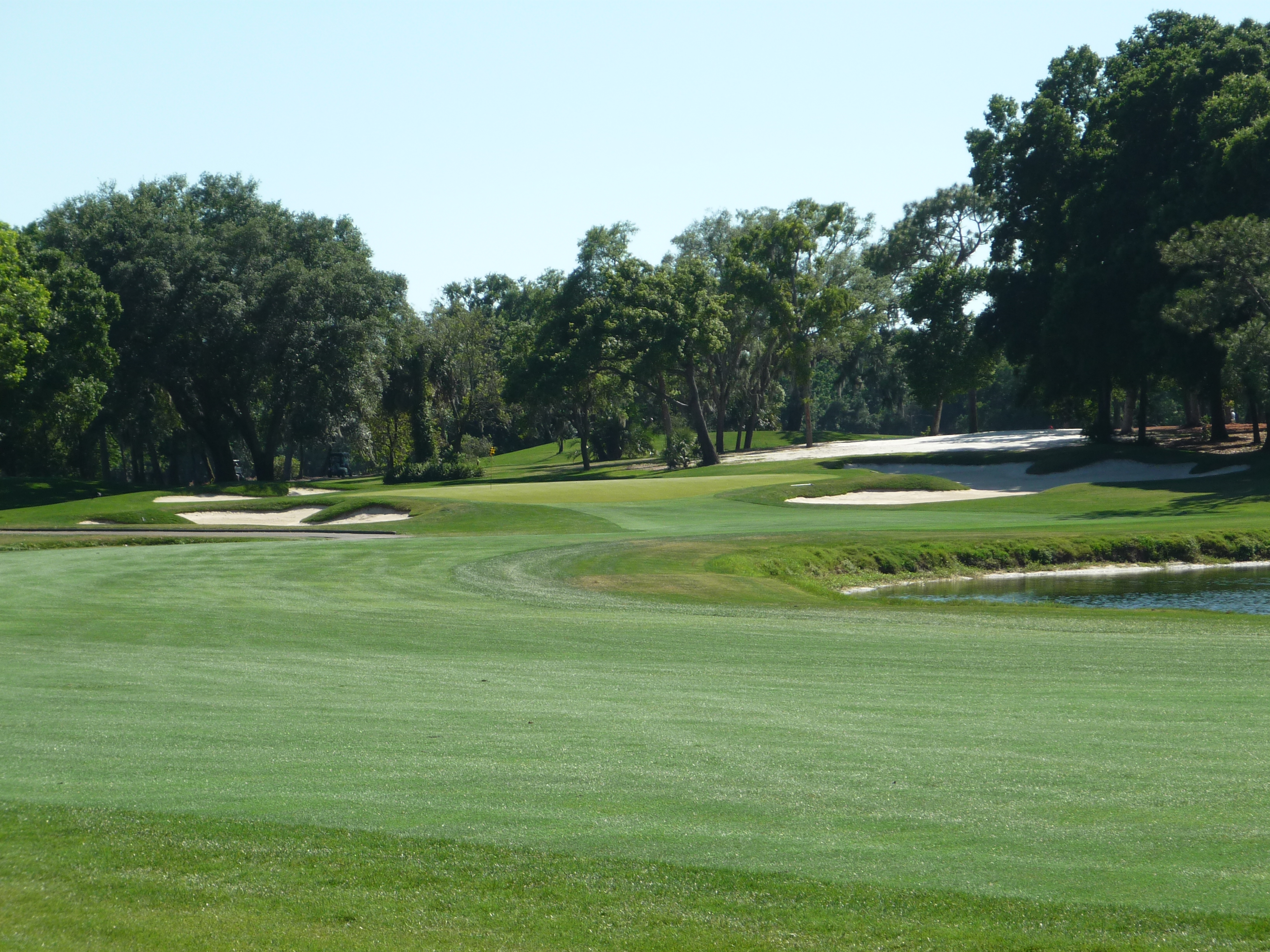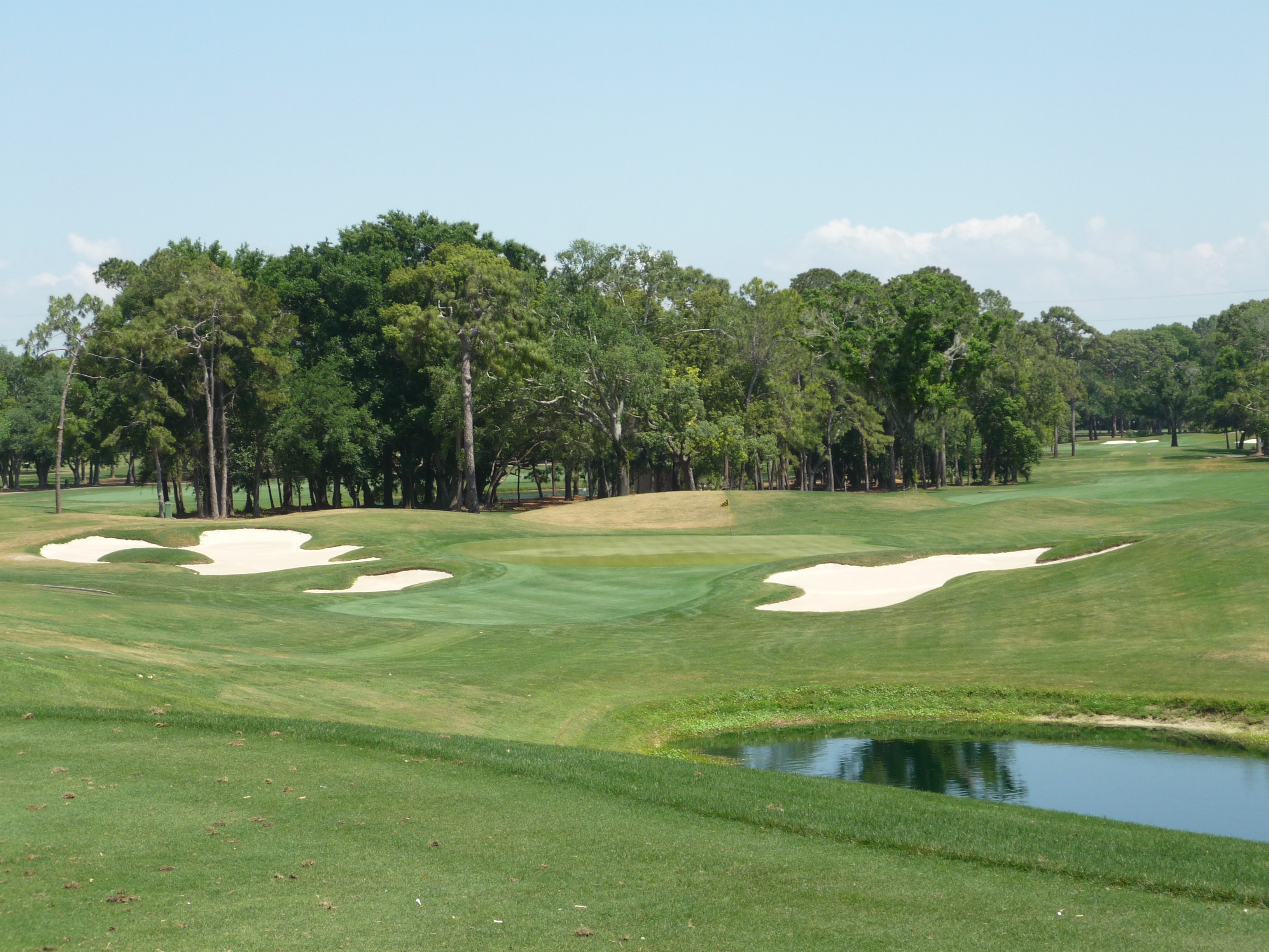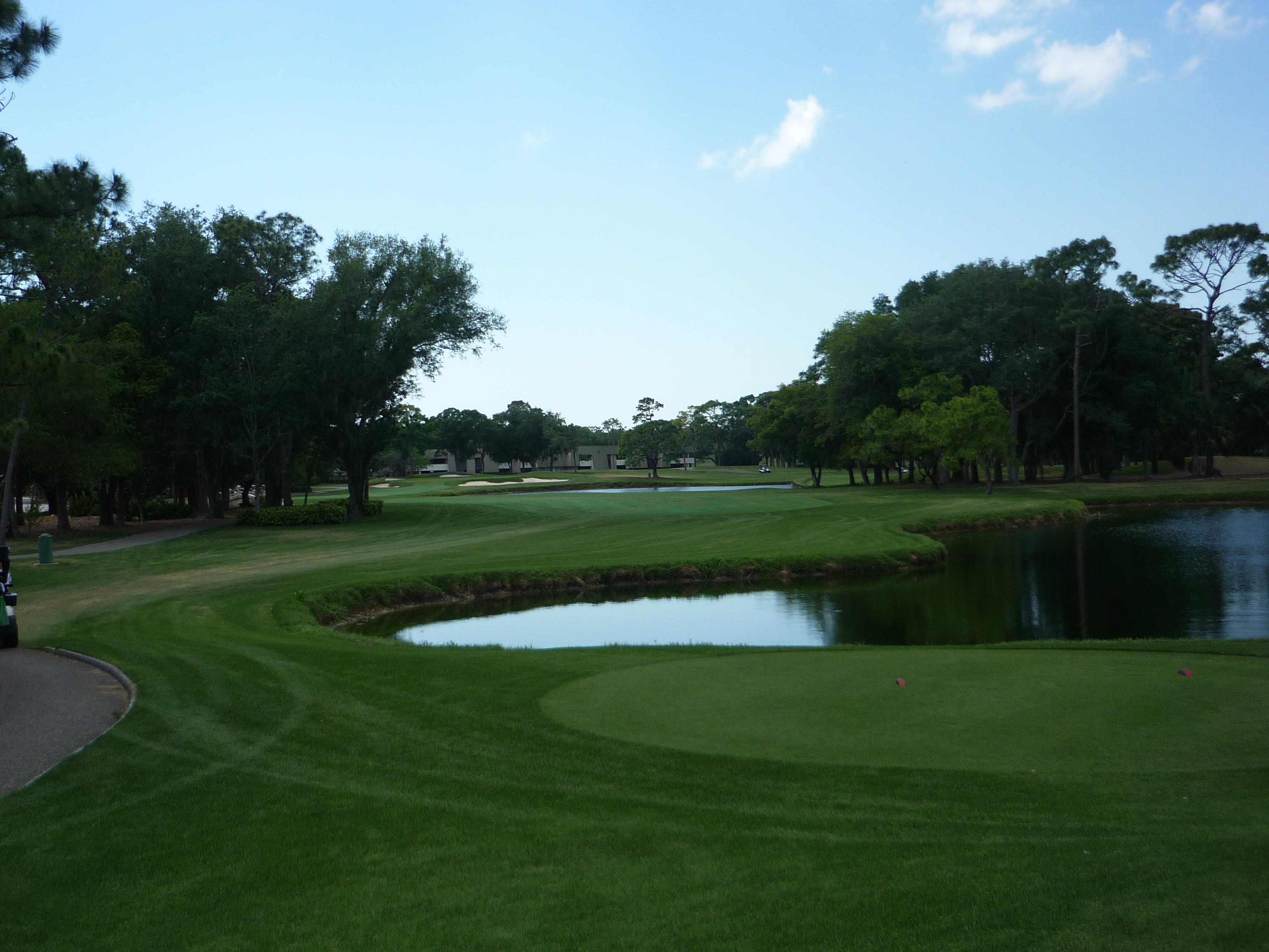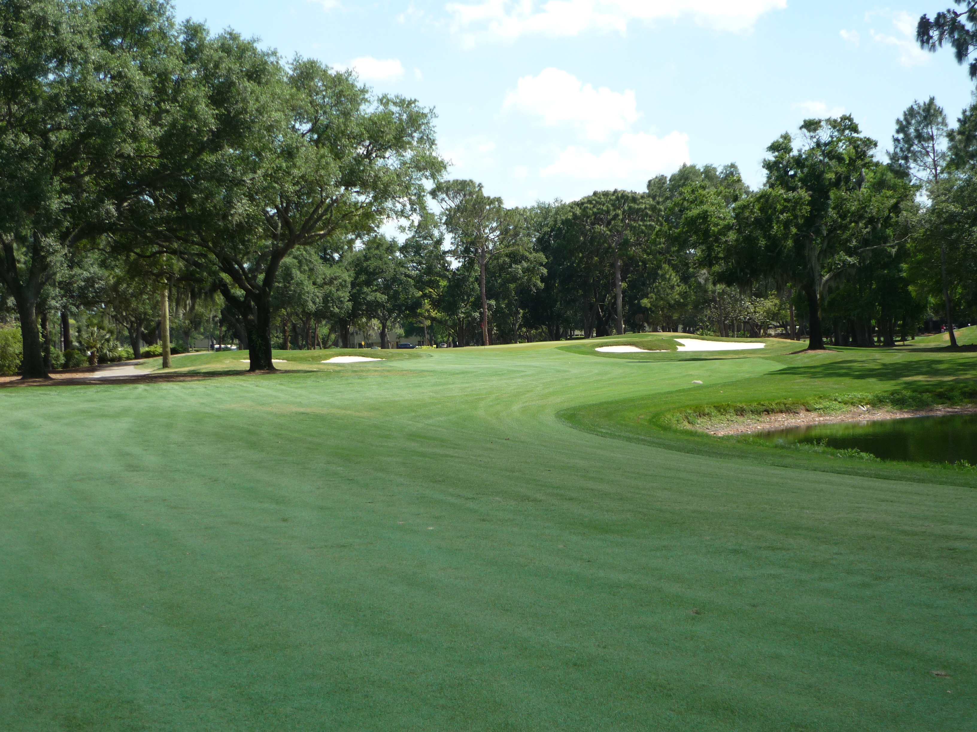 You bend left from the tee and then back right to reveal the green and water hazard. There is a good bit of slope from back to front on the right side of the green.