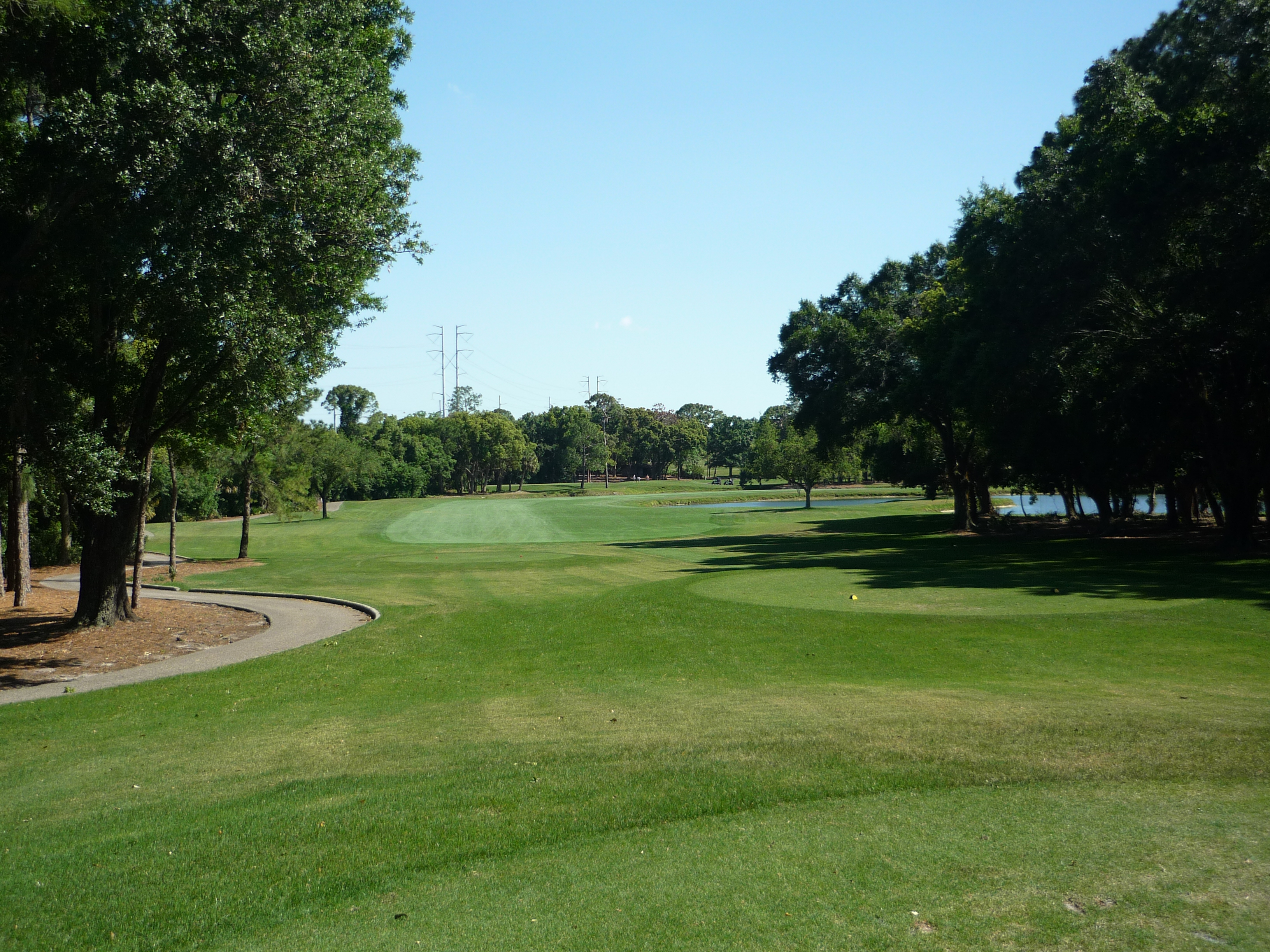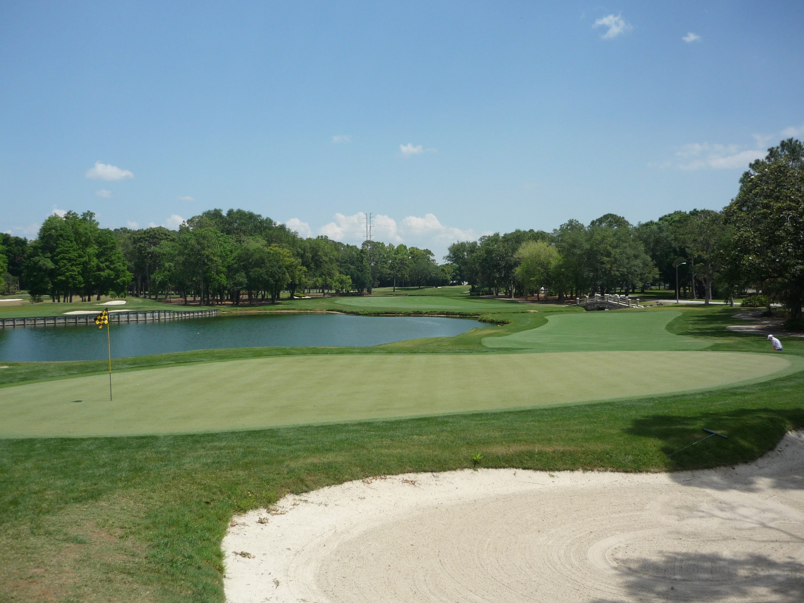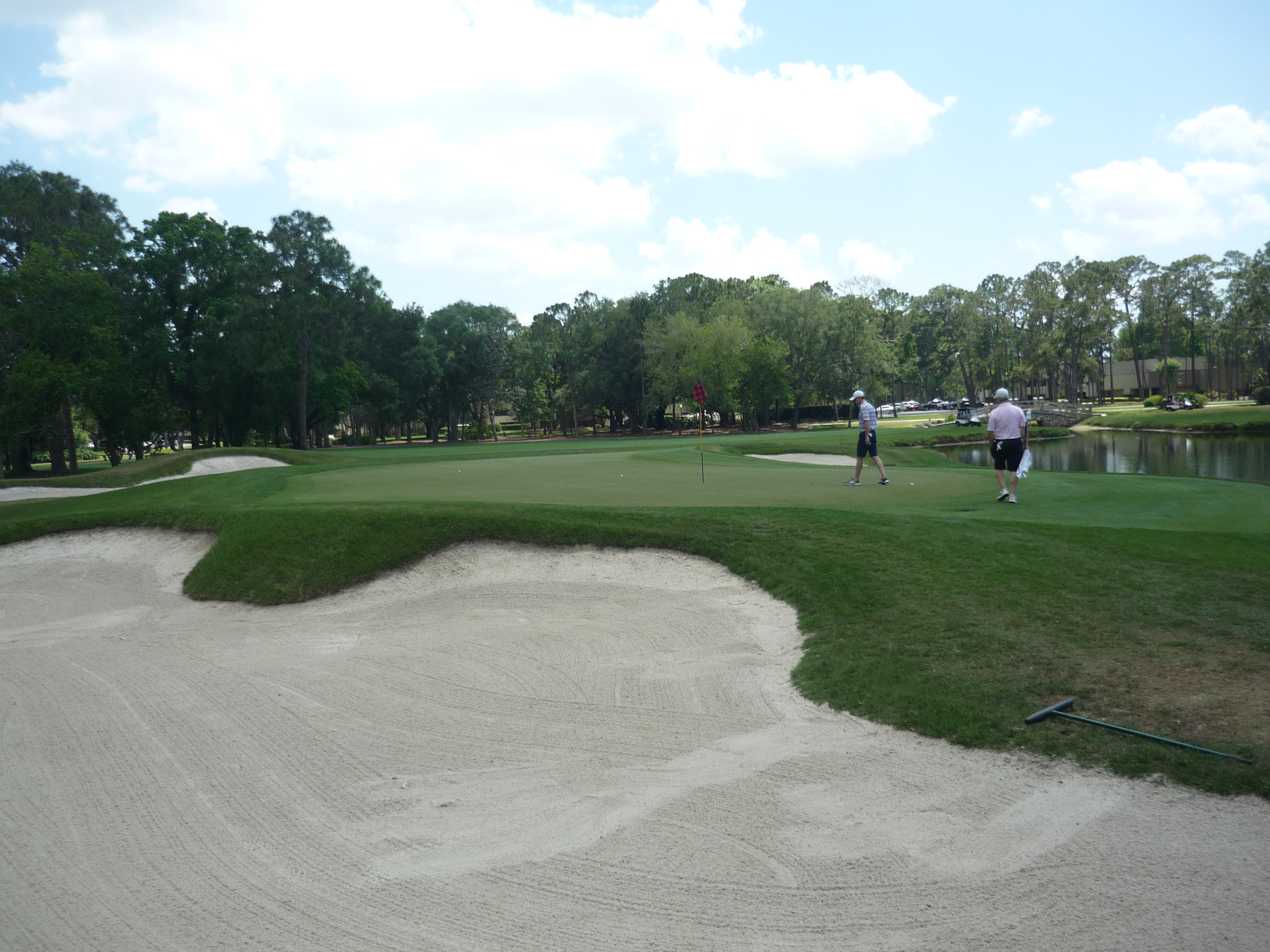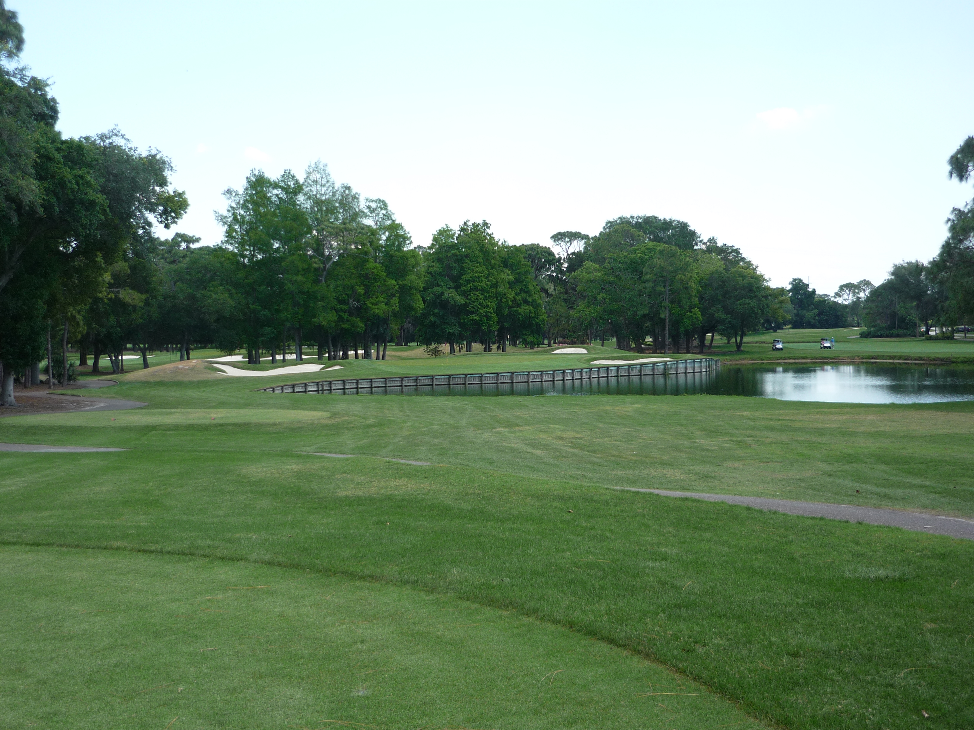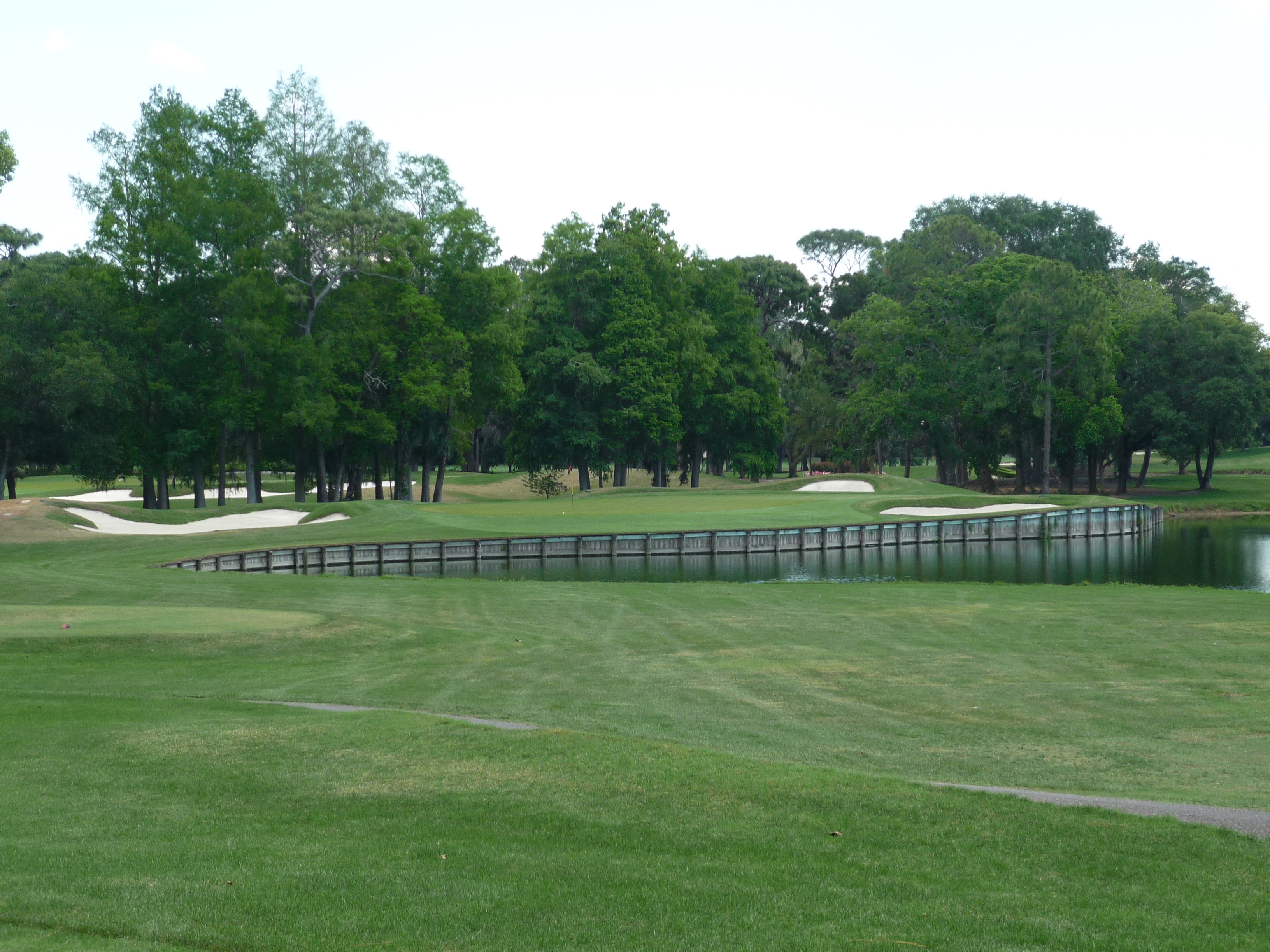 You bend left from the tee and then back right to reveal the green and water hazard. There is a good bit of slope from back to front on the right side of the green.