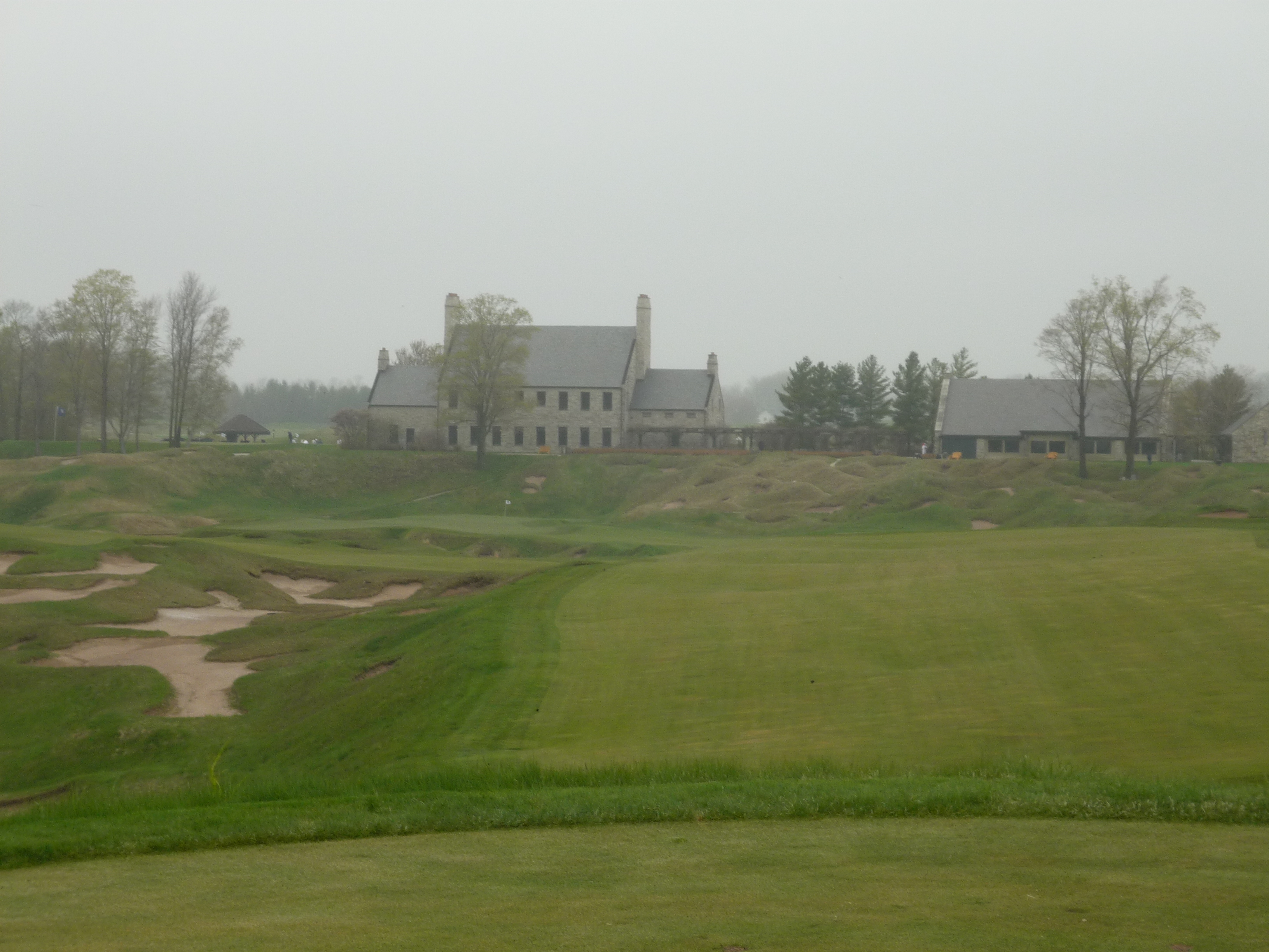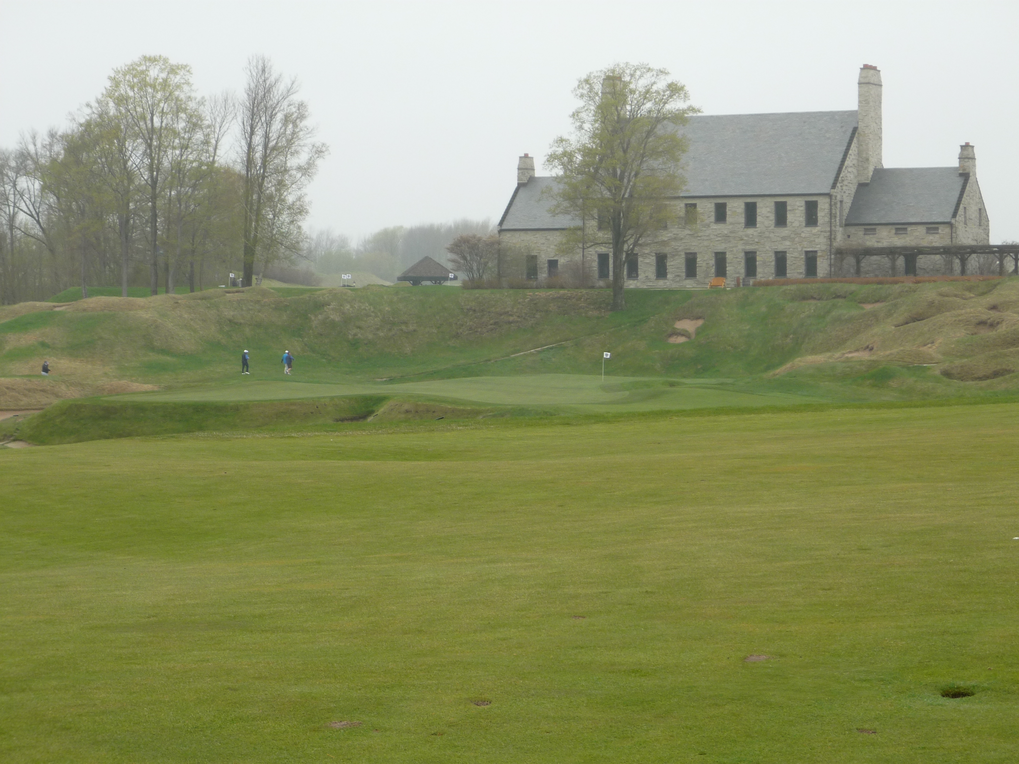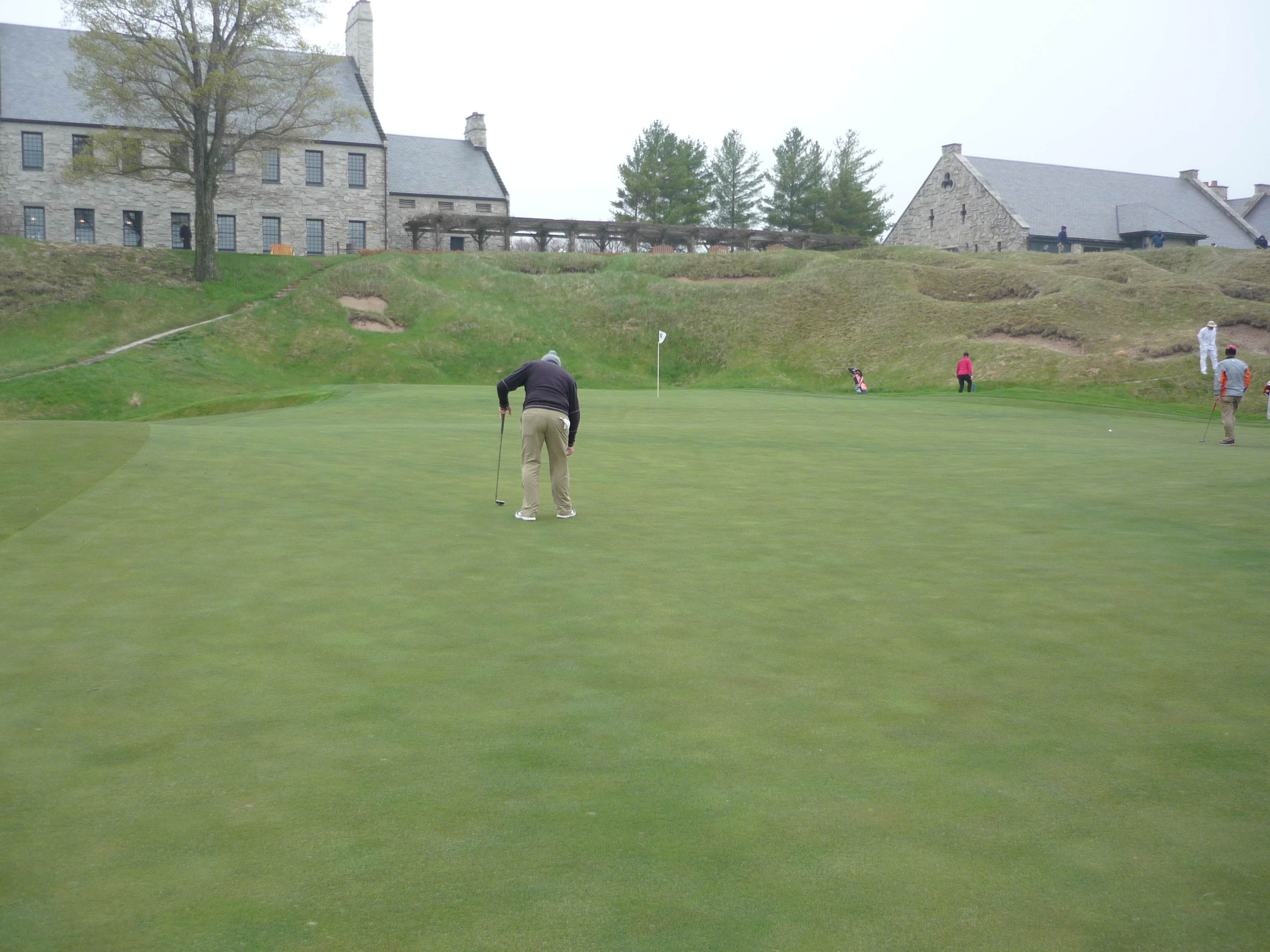 The setting here is pretty cool with the clubhouse and other buildings watching over the green. You can see 18 green in the background.