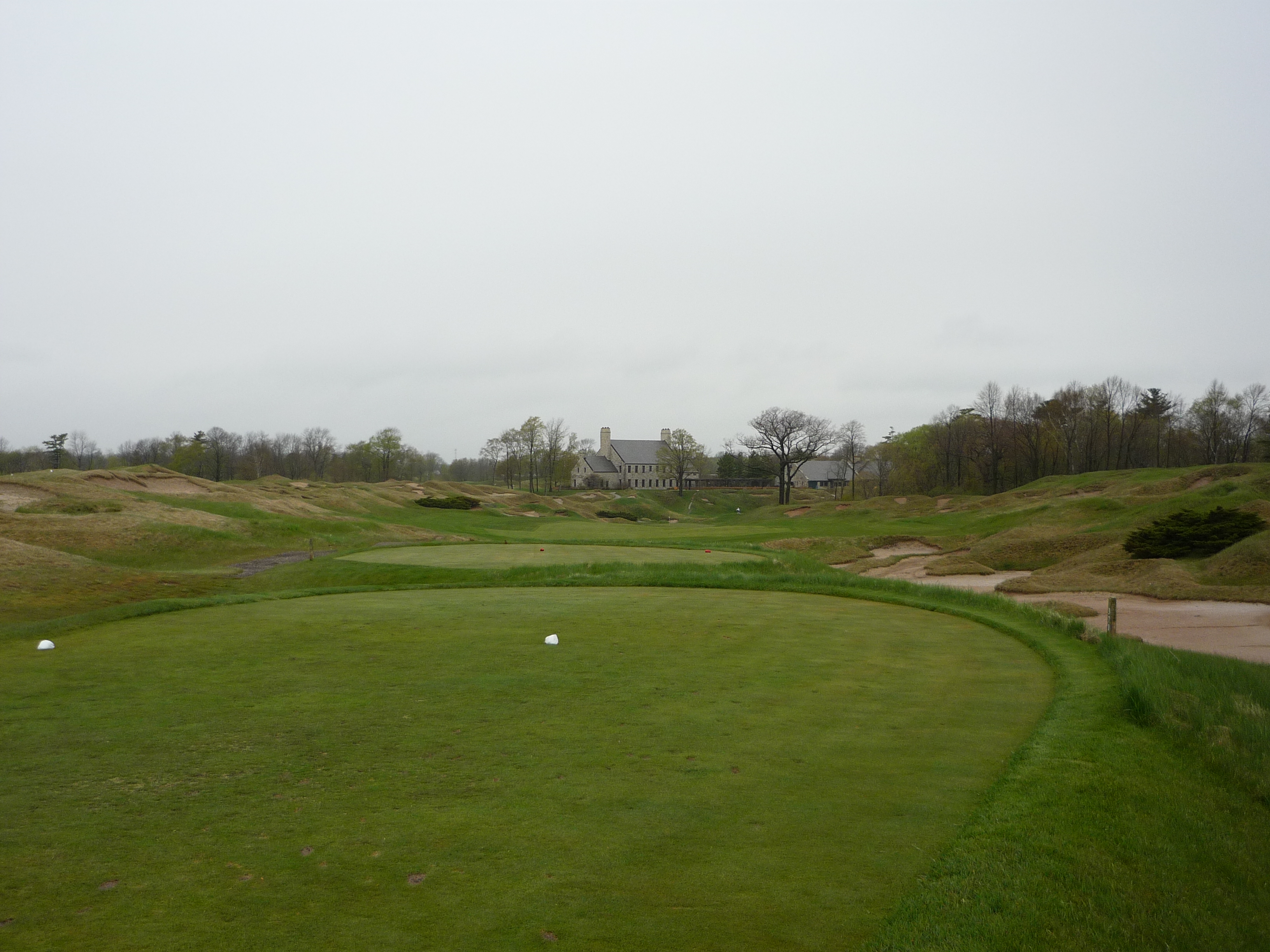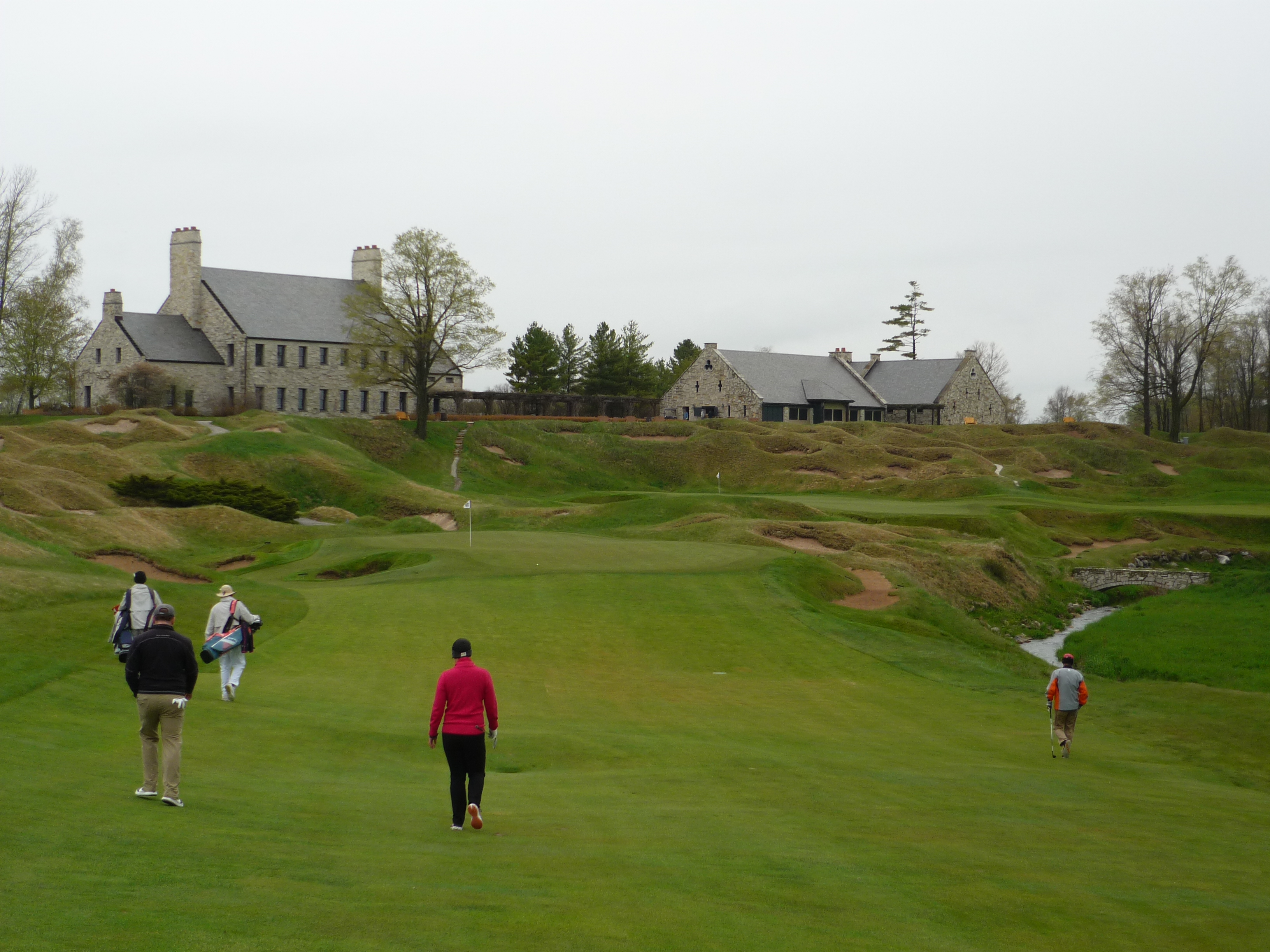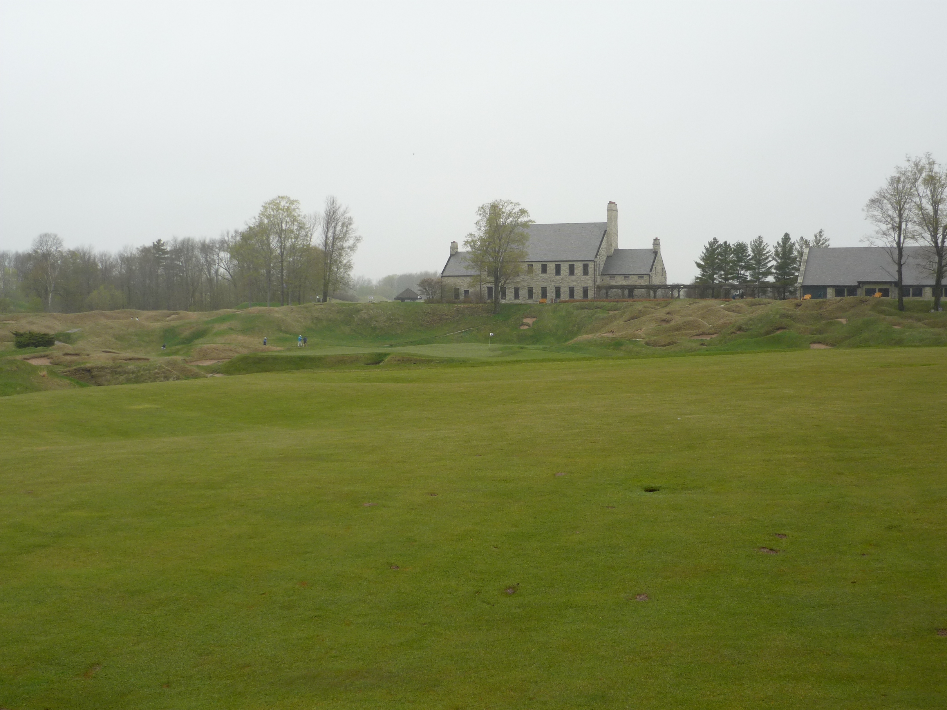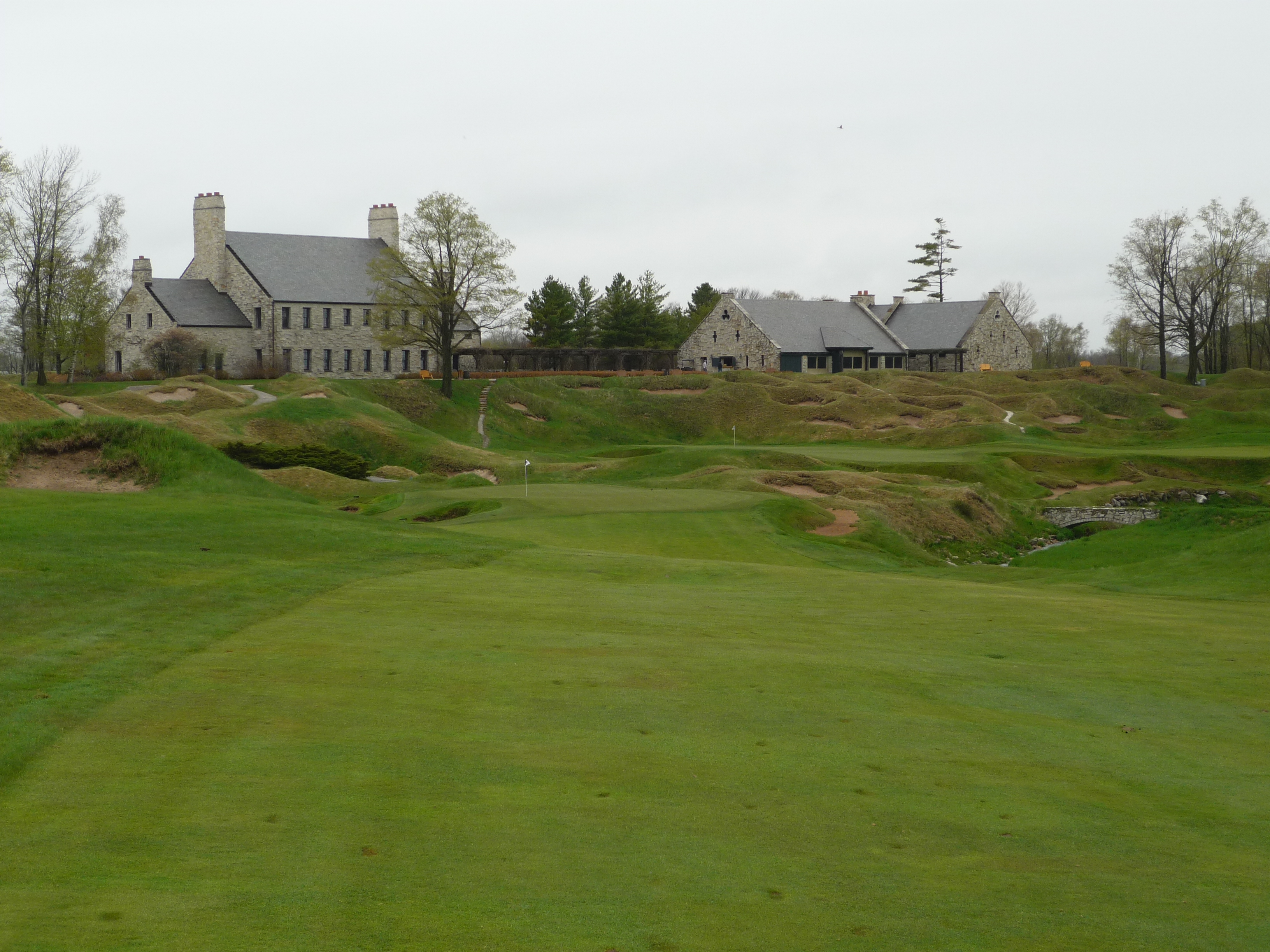 The setting here is pretty cool with the clubhouse and other buildings watching over the green. You can see 18 green in the background.