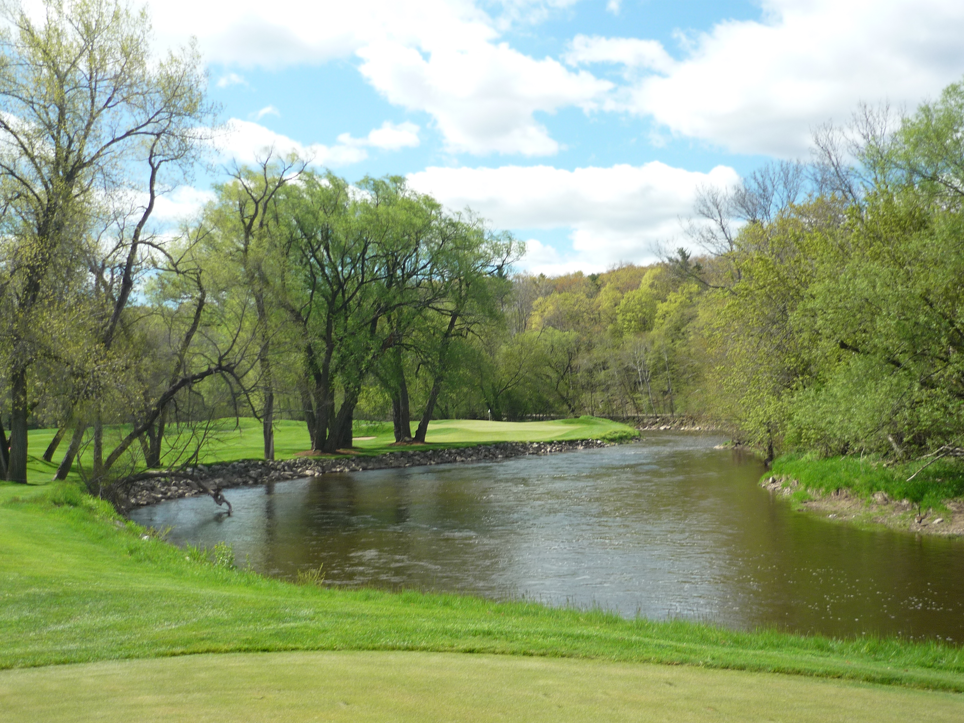 No slices on this hole! The river runs along the entire right side and comes into play on all shots. You must calculate your layup precisely to carry the water.
