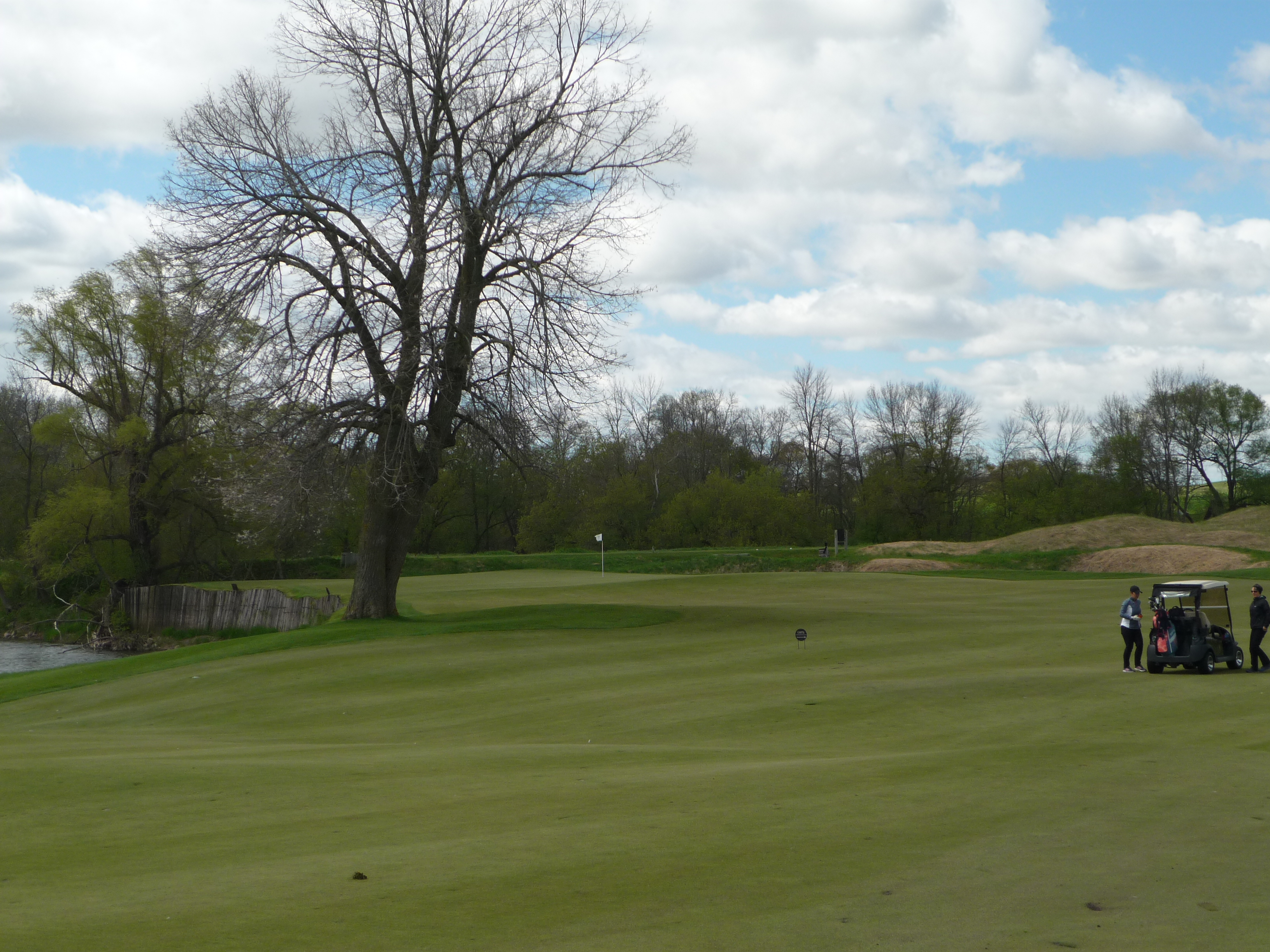 This hole has plenty of protection. You start with the enormous bunker you see below, then the river comes into play, and finally, a tree guards the green.