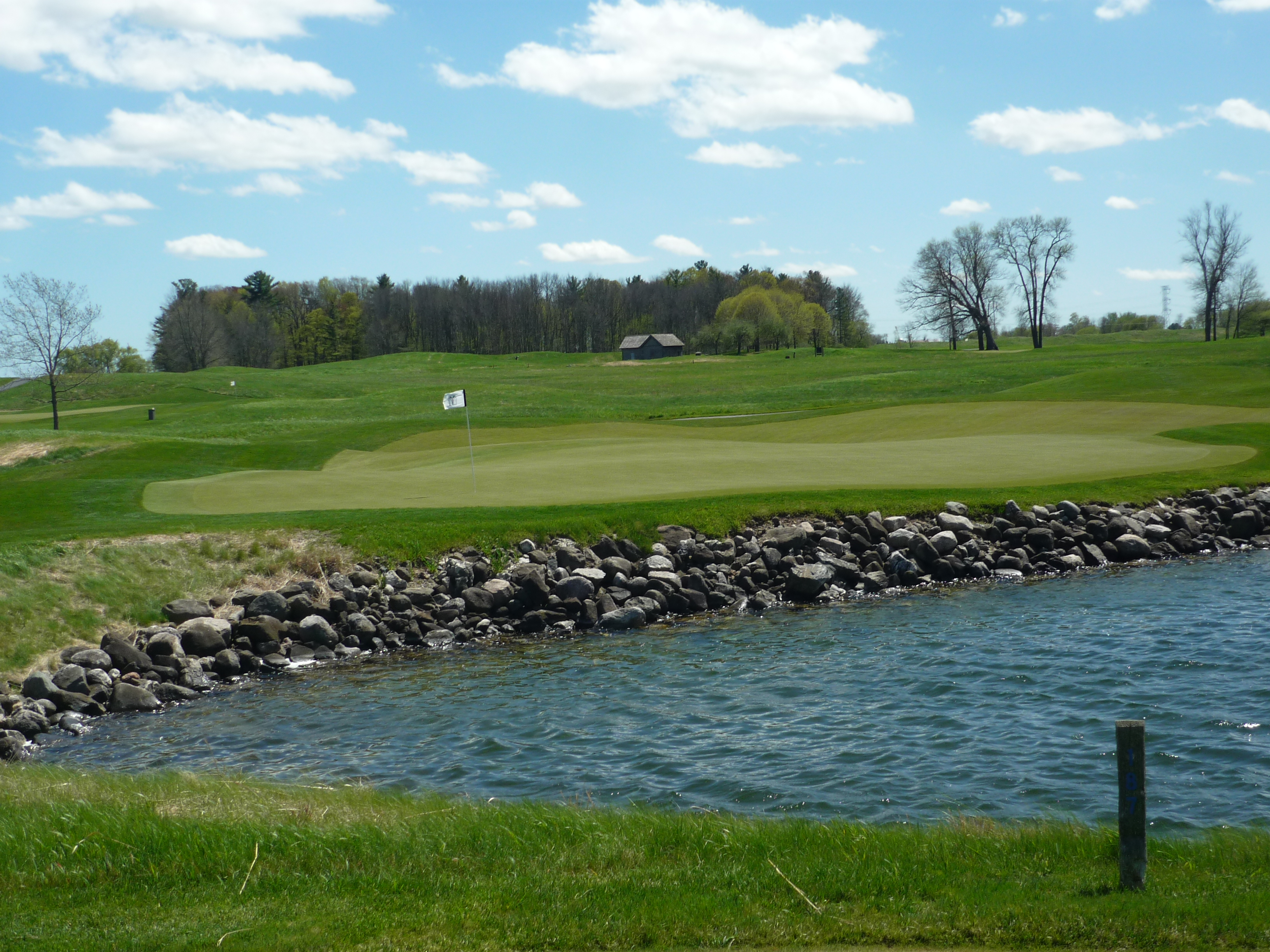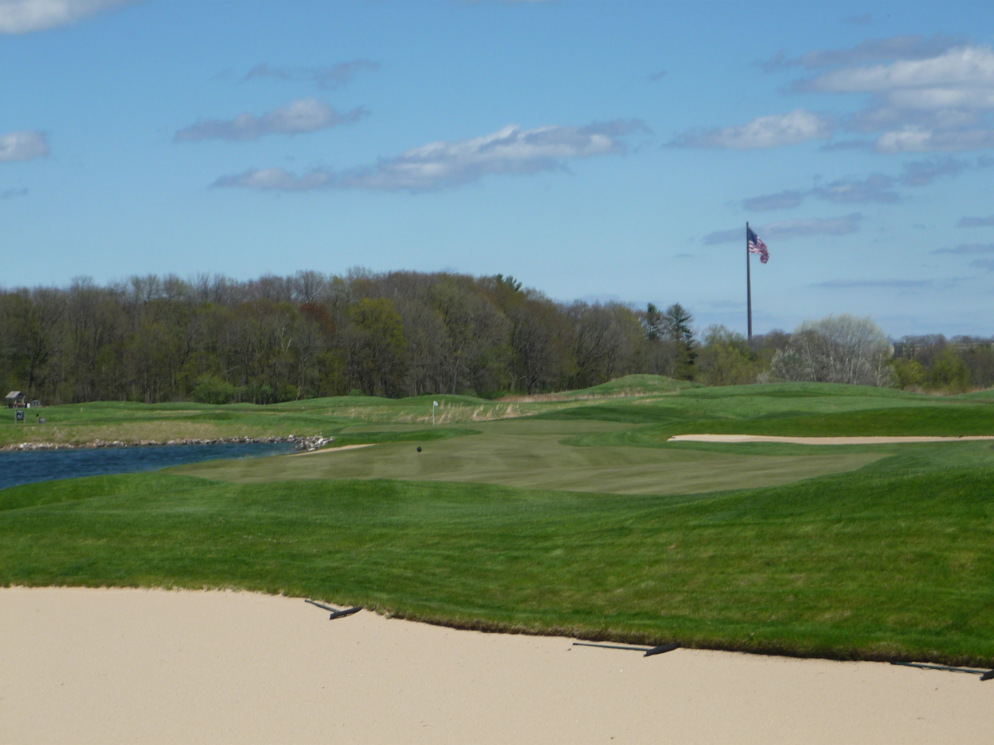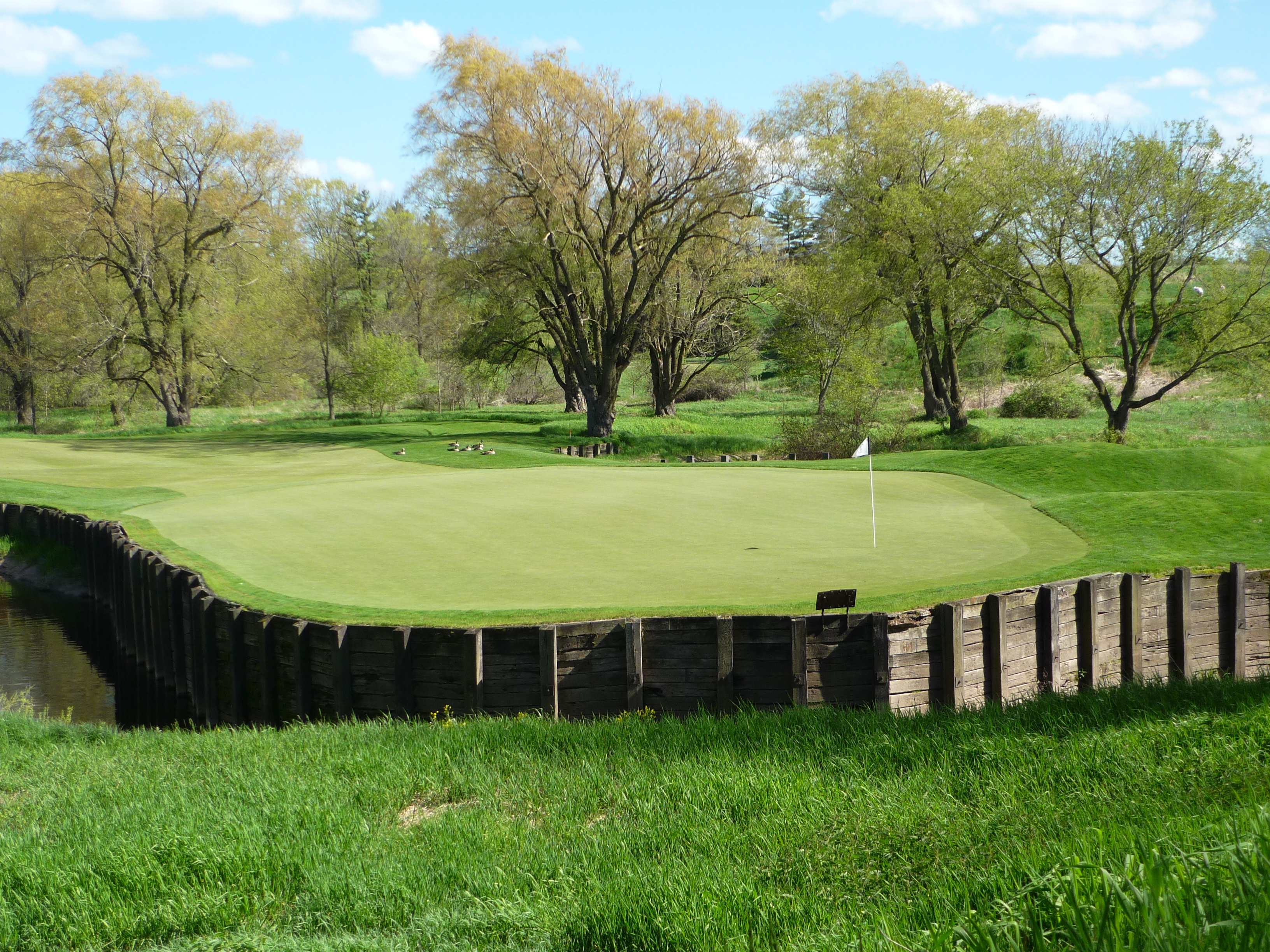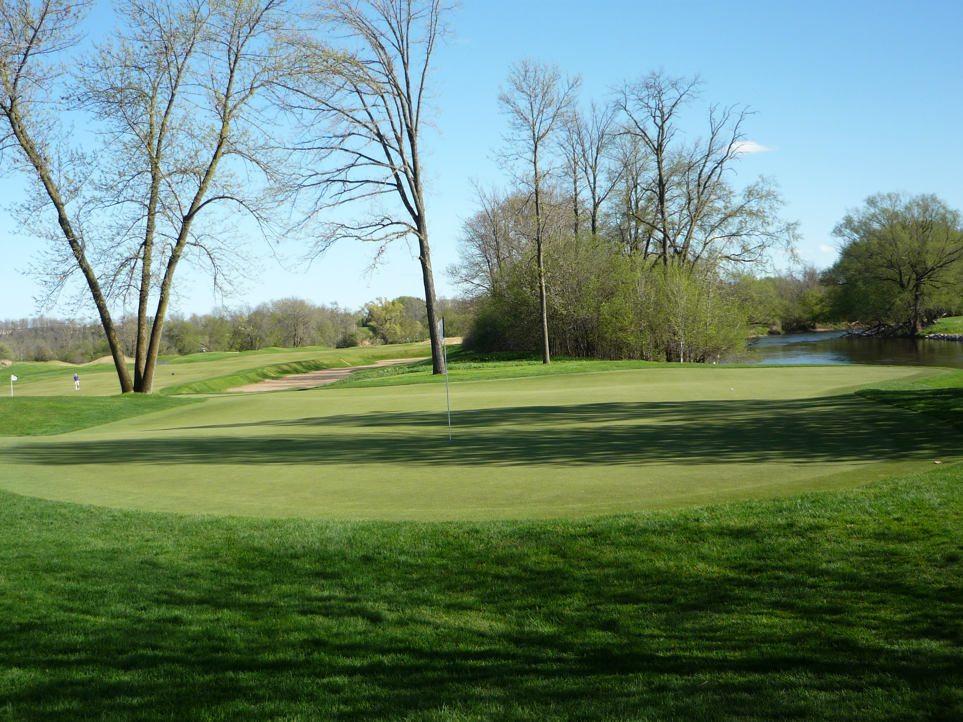 This hole actually has two greens. One for the red tees (not pictured) and the one below for all the others. This one shares the large double green with the 18th on the River.