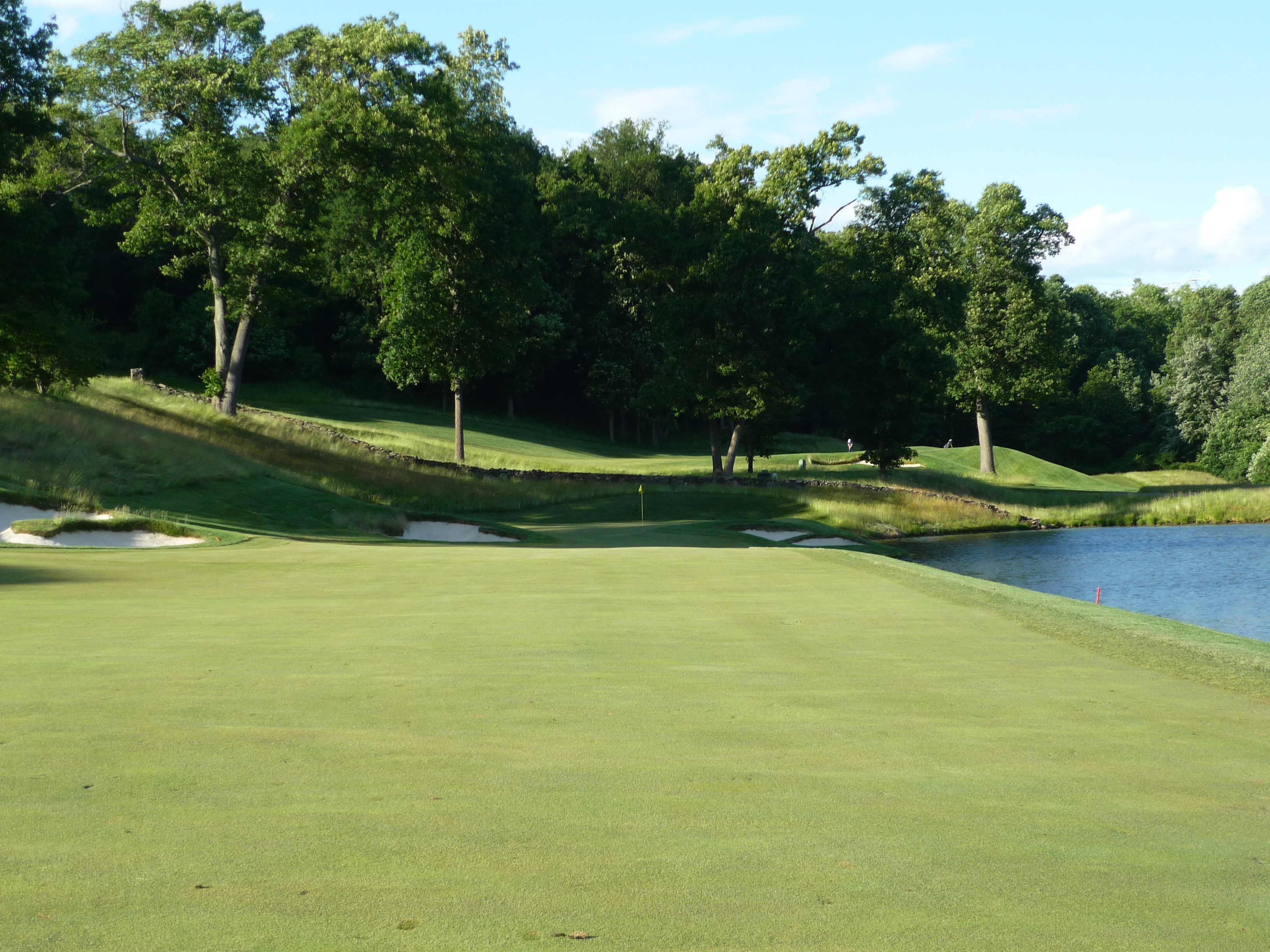 The fourteenth is one of my favorite holes at Hudson National Golf Club. It bends to the right, hugging a pond for the last third of the hole. Going for the green in two will be hair raising as it should be.