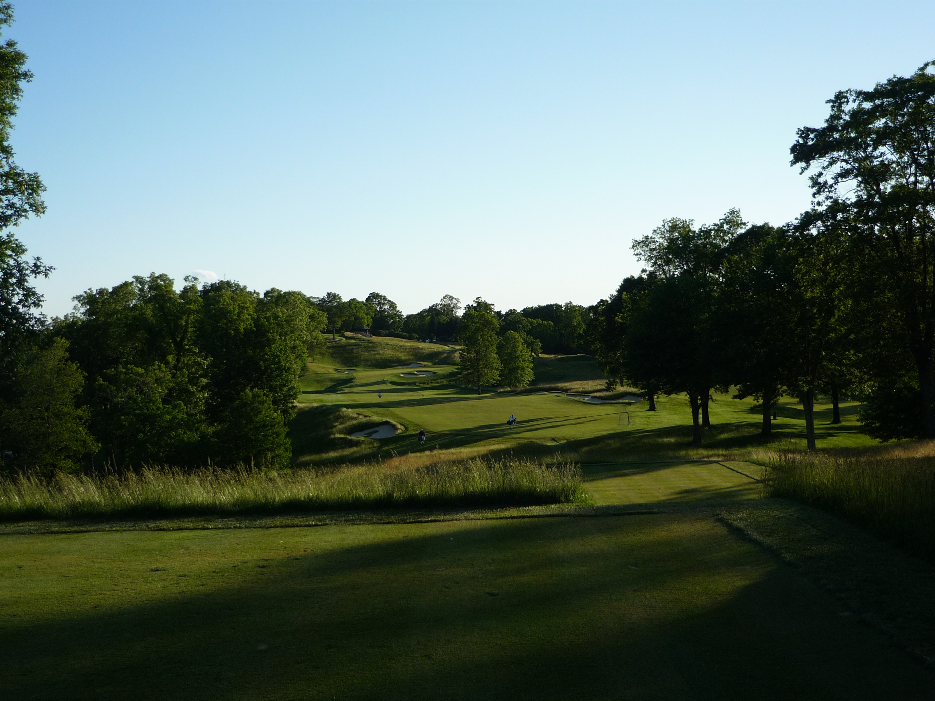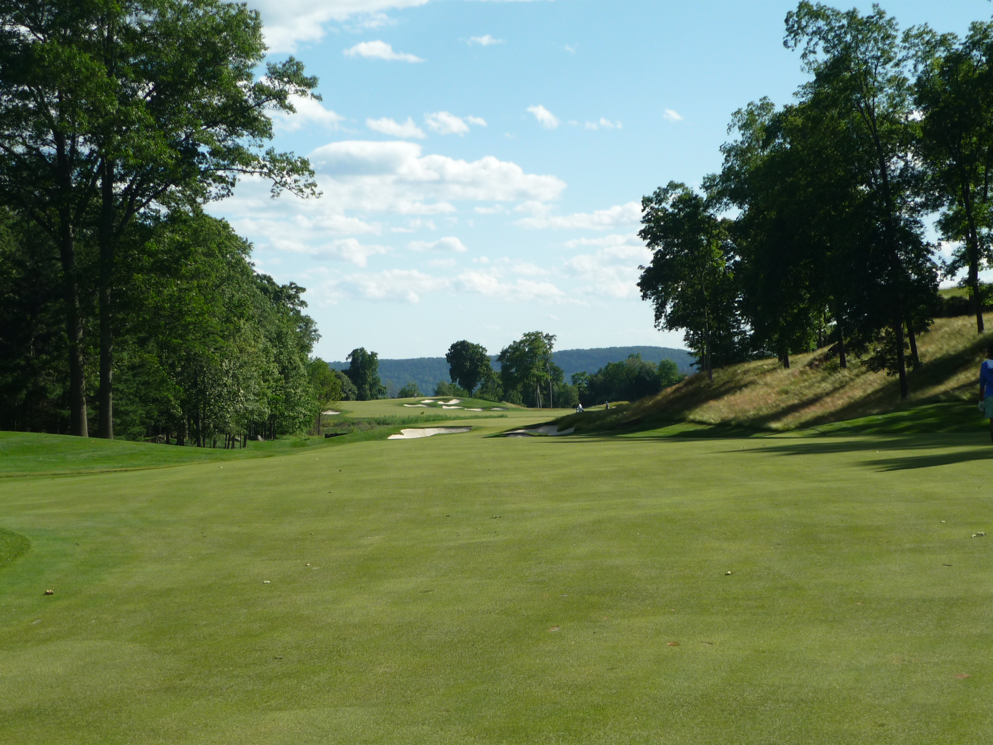 This hole is a bit tricky and constricting. You need a precise tee shot because the hole narrows and drops severely downhill and to the right. Good drives should leave a short second shot due to the downhill slope.