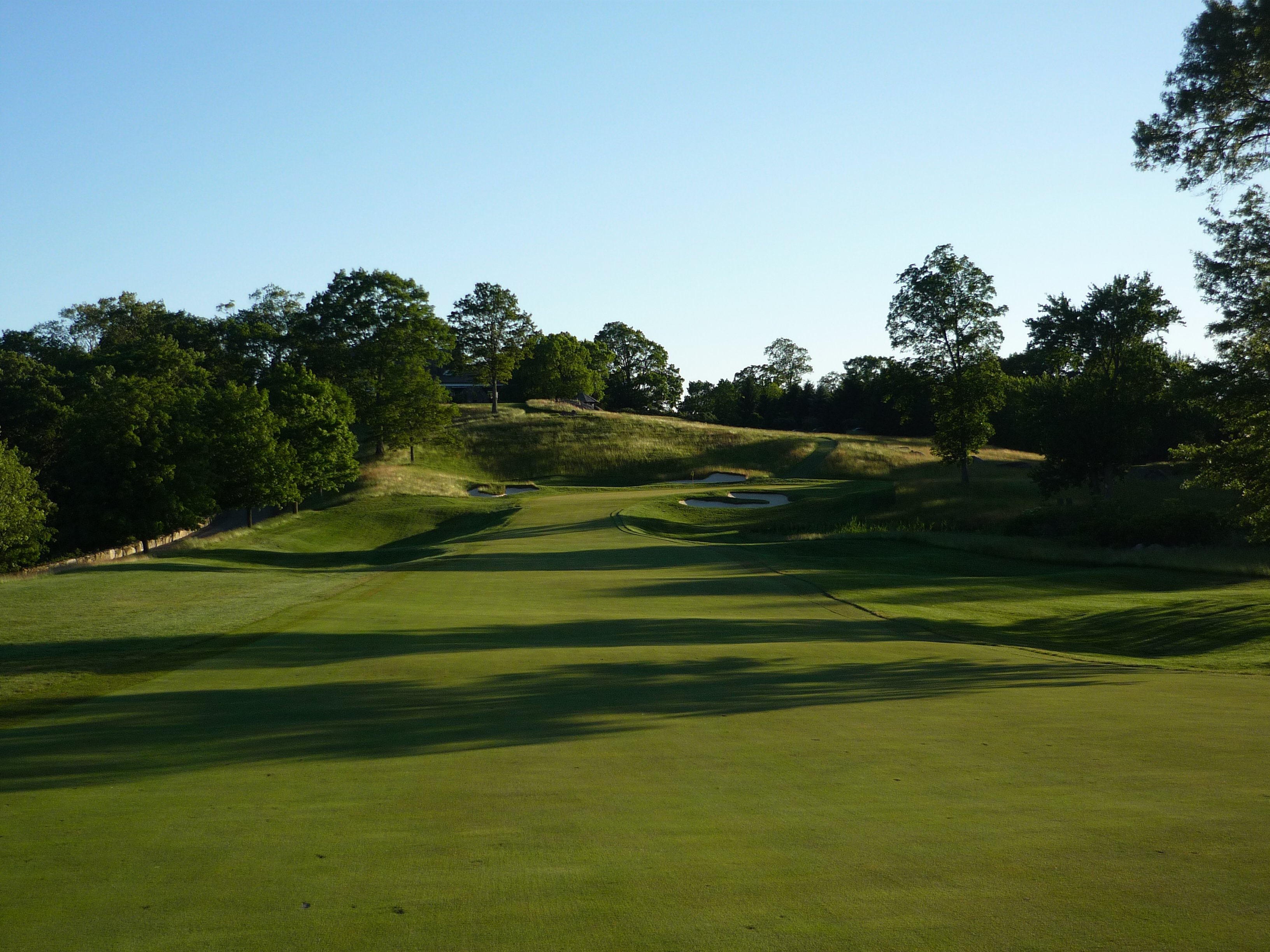 The hole is uphill all the way. The fairway is tightly mowed in front of the green so shots with too much spin won’t hold.