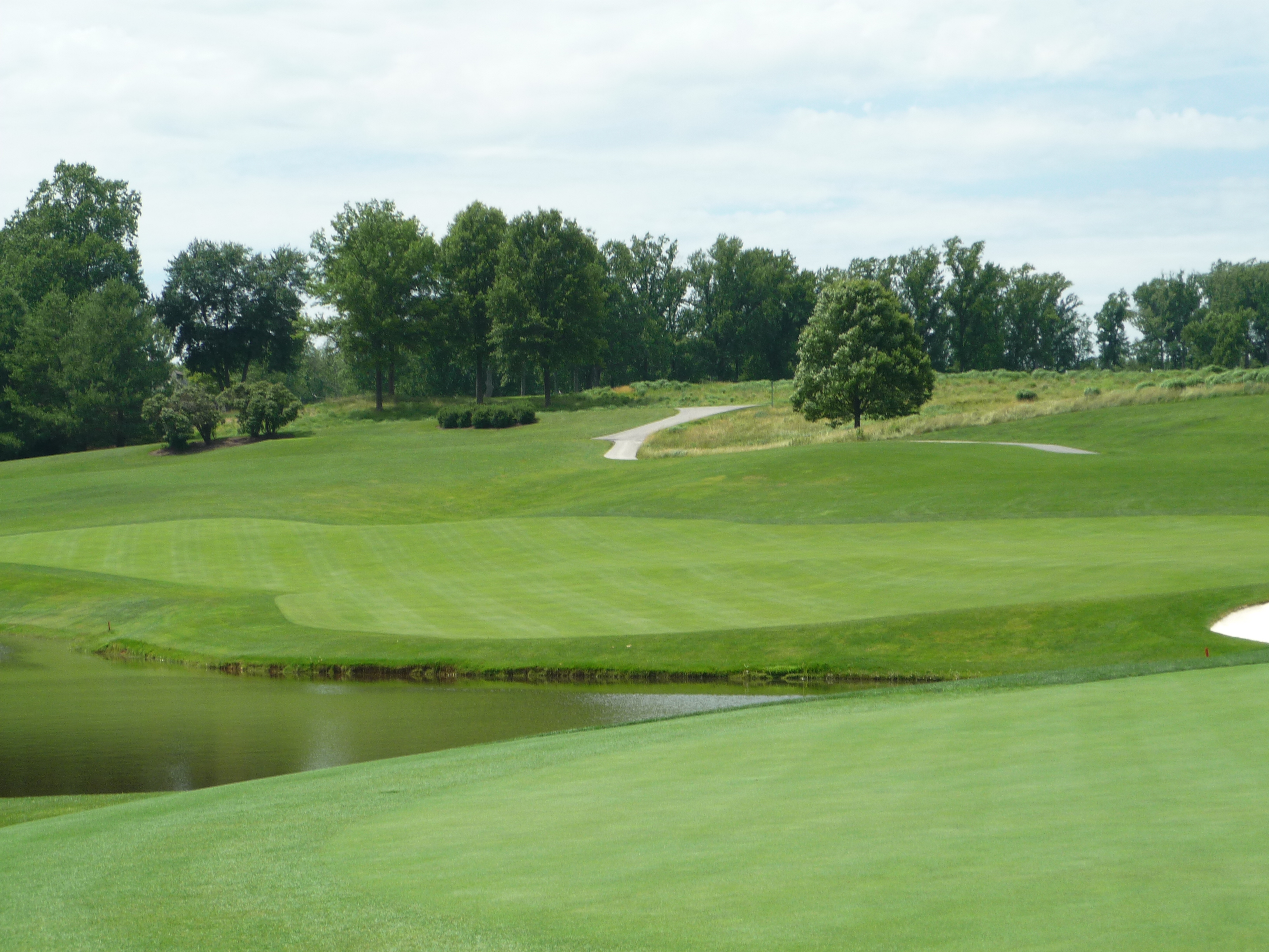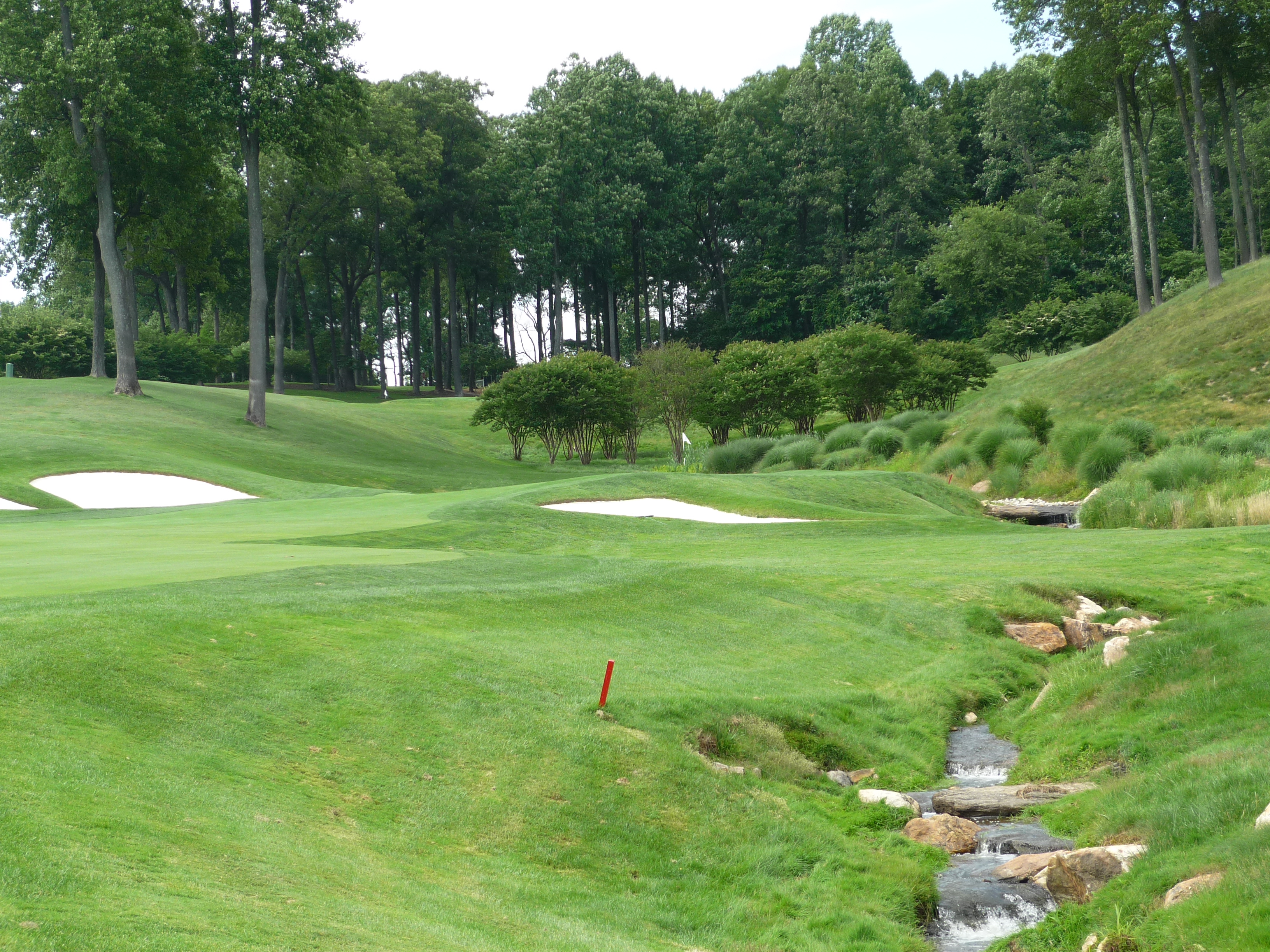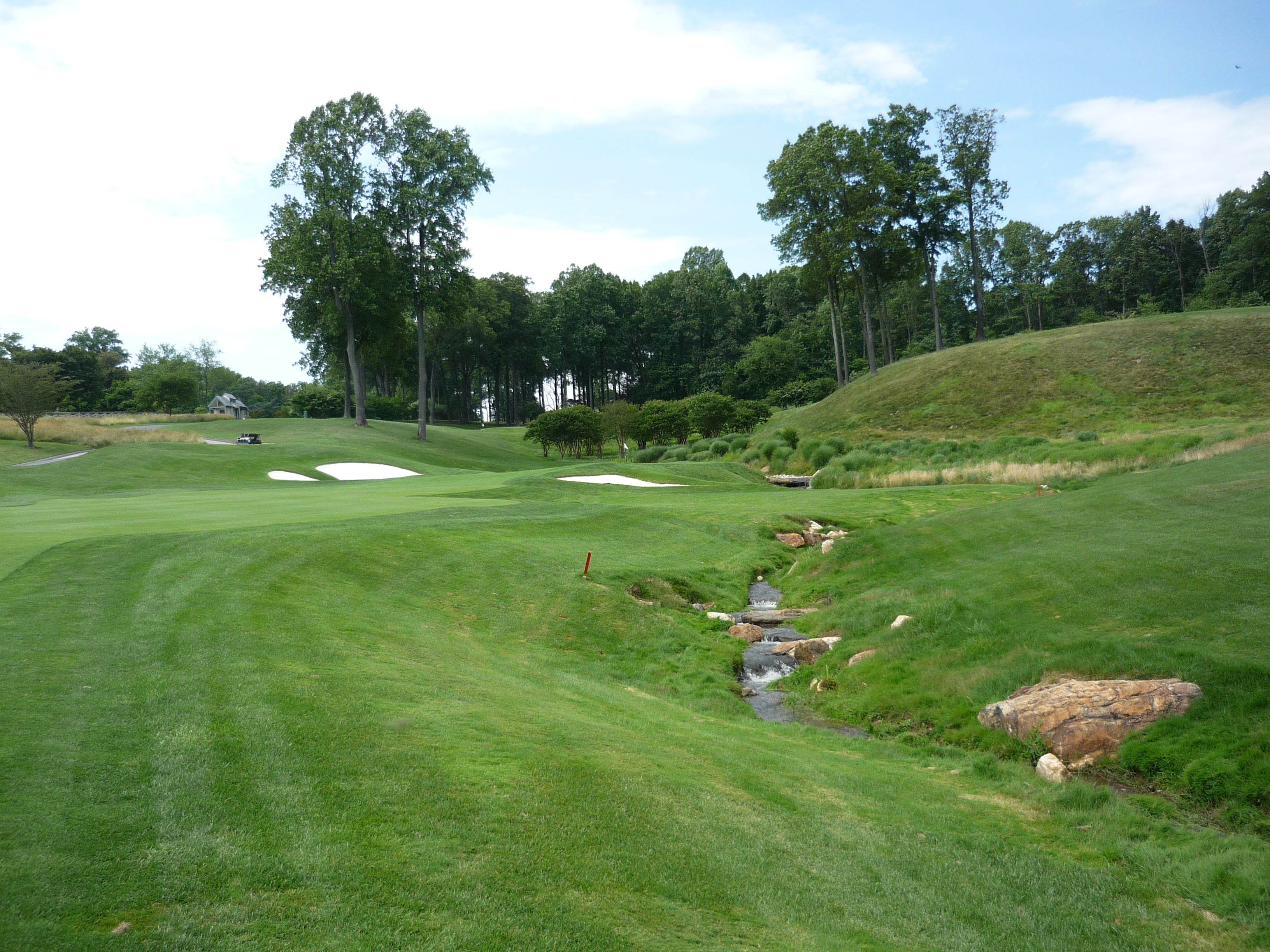 I liked the creek on this hole a little less once I heard it was totally artificial. The building on the left behind the trees keeps if flowing.