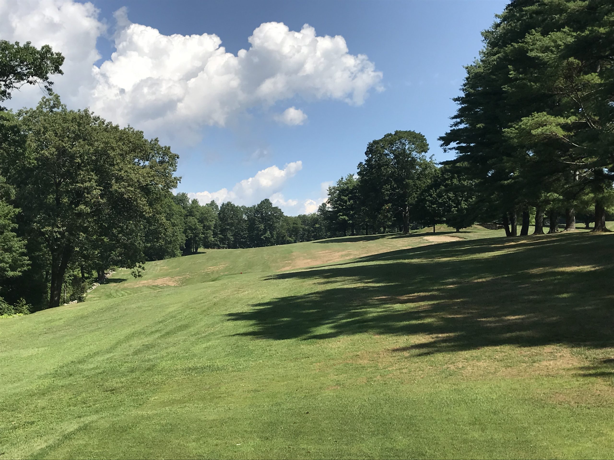 The old road runs the length of this hole on the left, which puts some fear into this tee shot. The landing area is blind but is pretty wide.