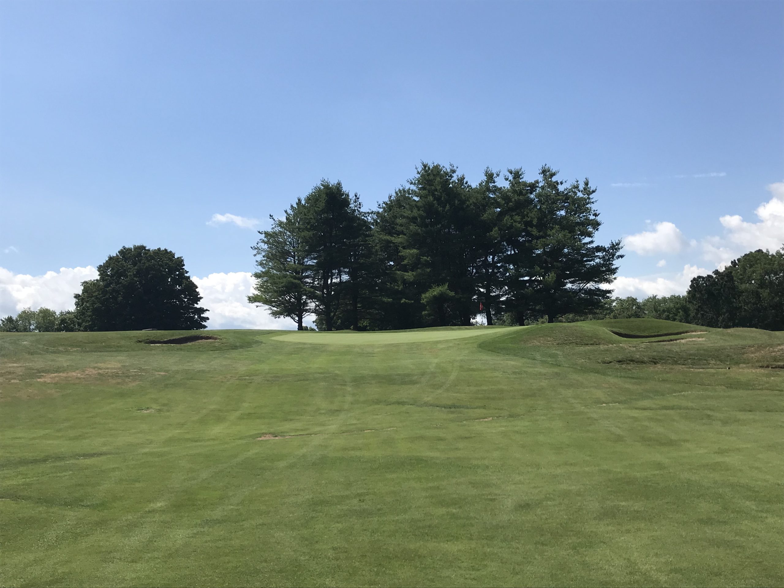 The fairway dives down before rising back up to the green. The putting surface is a large target but flatter compared to the others we’ve seen so far.