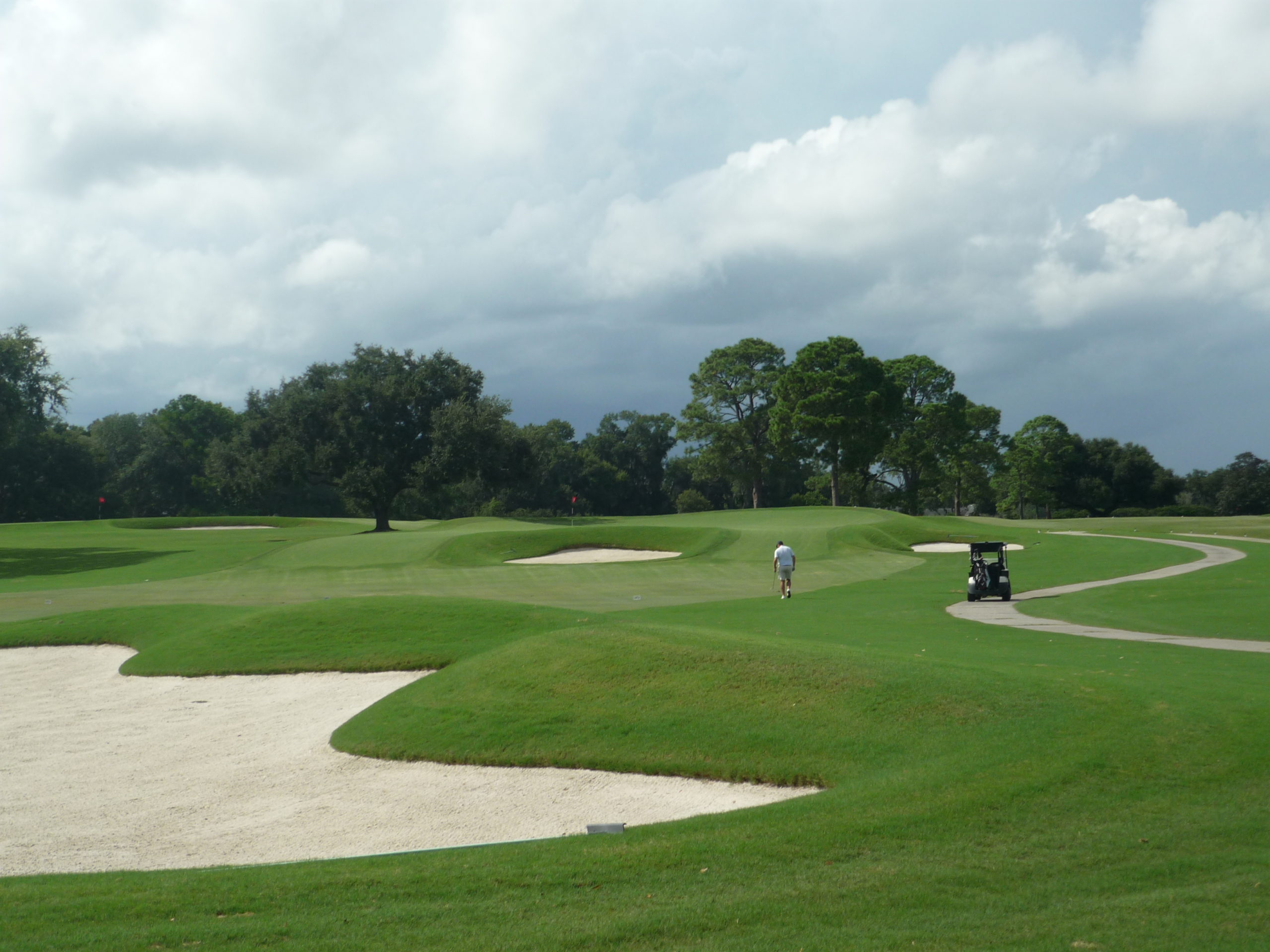After a thunderstorm delay we got back out to the tenth hole. While it’s named Alps, this dogleg left doesn’t feature the blind second shot the template is known for. It does play over the traditional cross bunkers though.