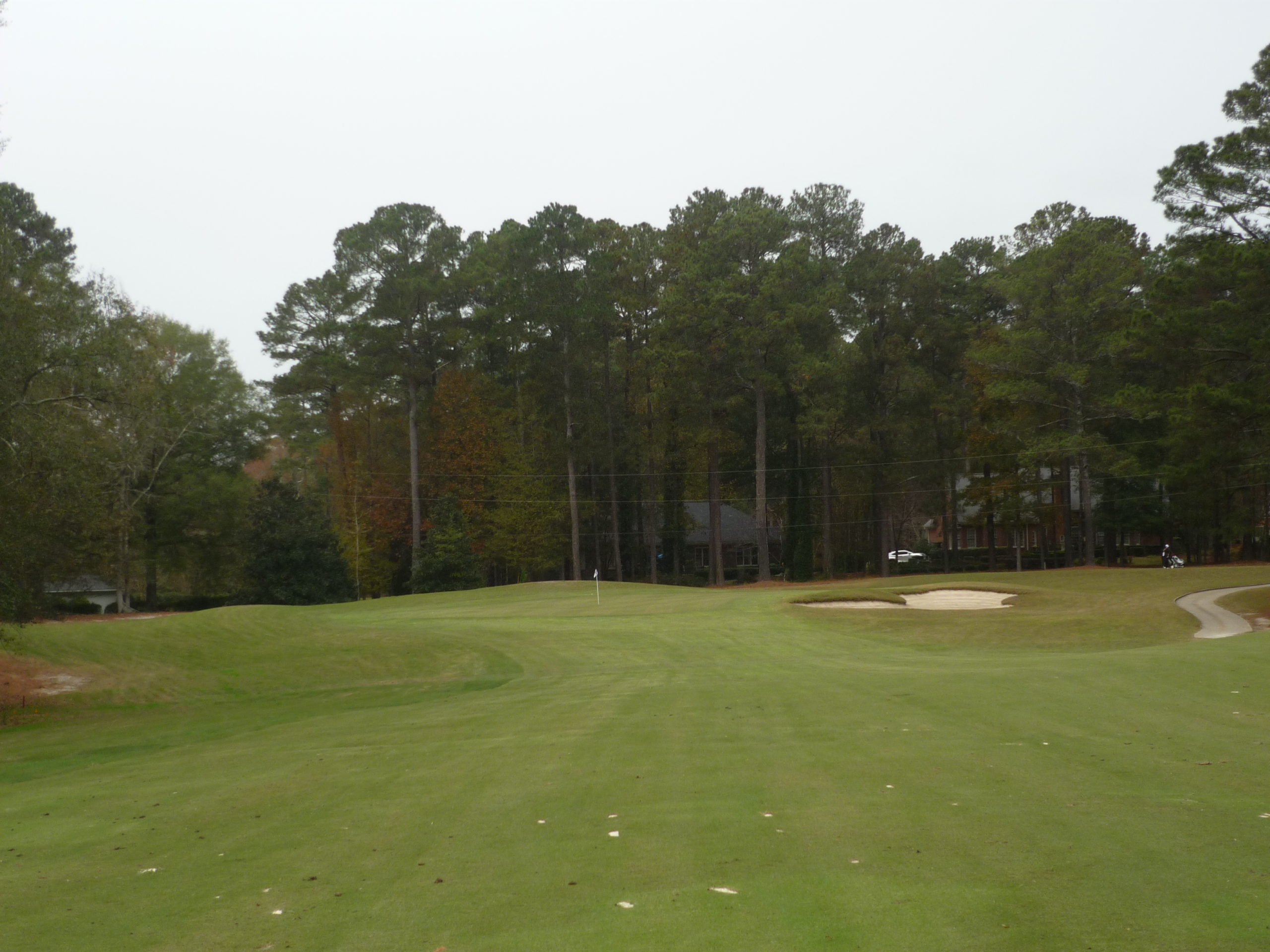 Long hitters can take a line over the short trees on the left to significantly shorten this dogleg left.. For the rest of us the play is to the left of the bunker.