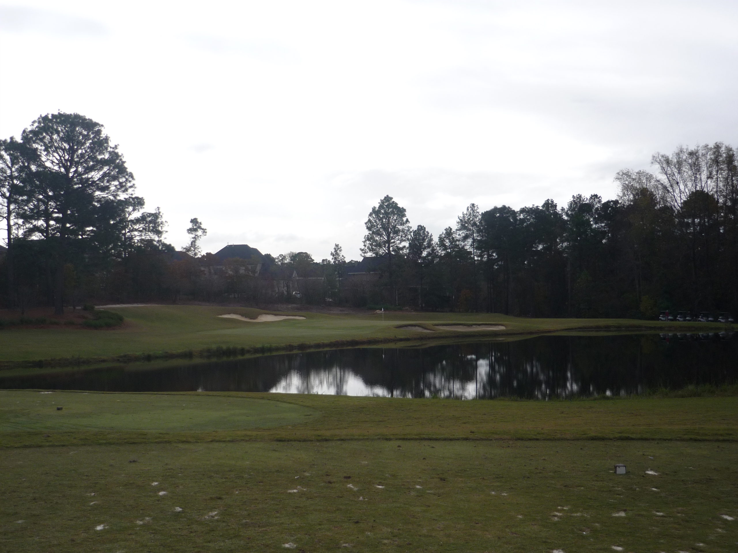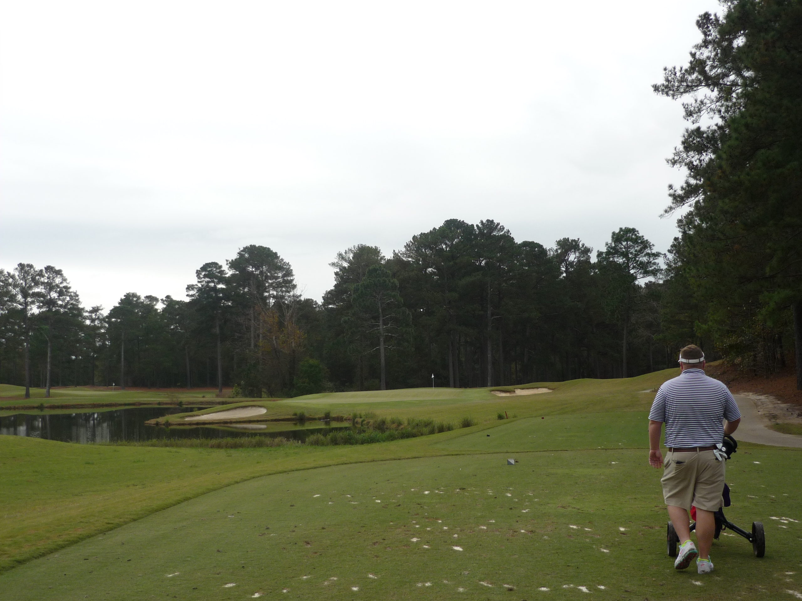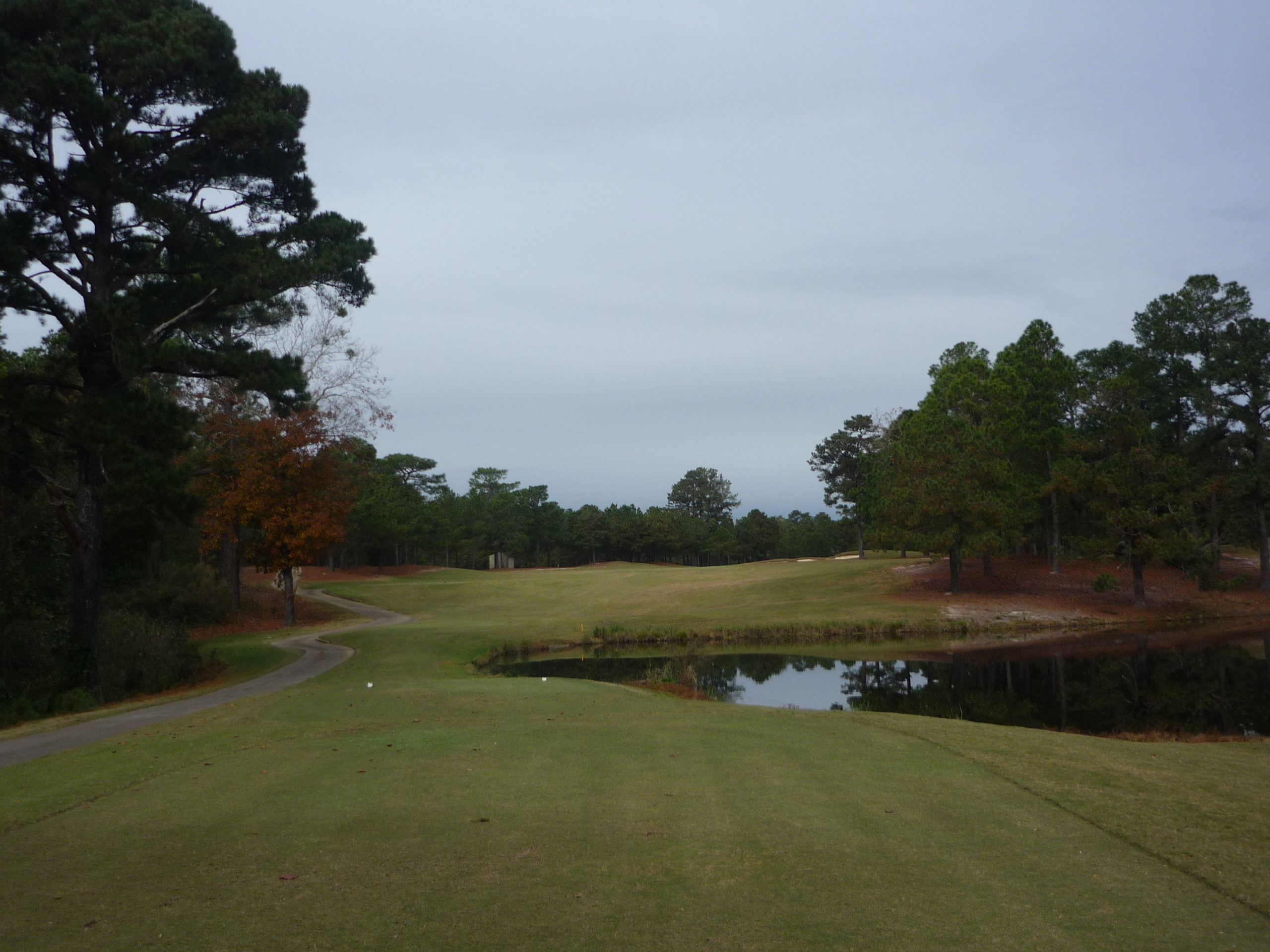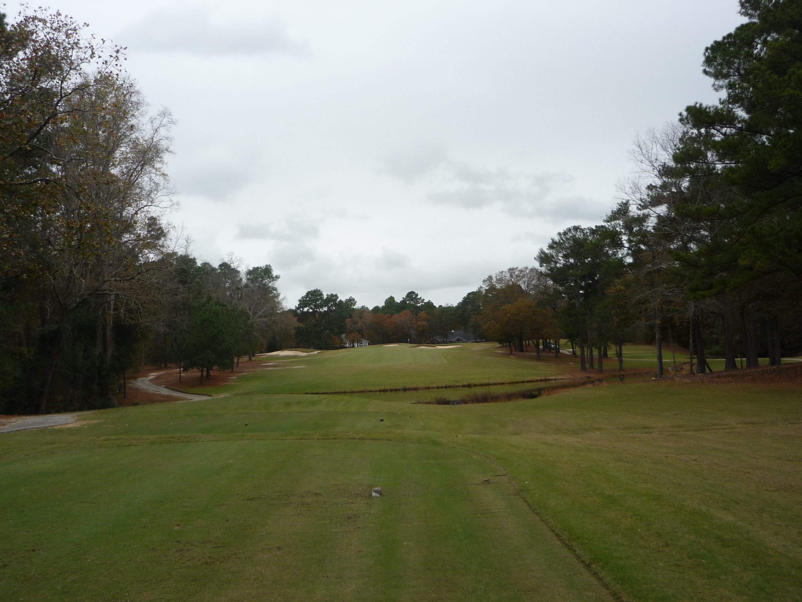 As you can see, this hole plays to a blind landing area. Once you get to the top of the hill, you have to make a decision to challenge the water or play for a layup yardage.