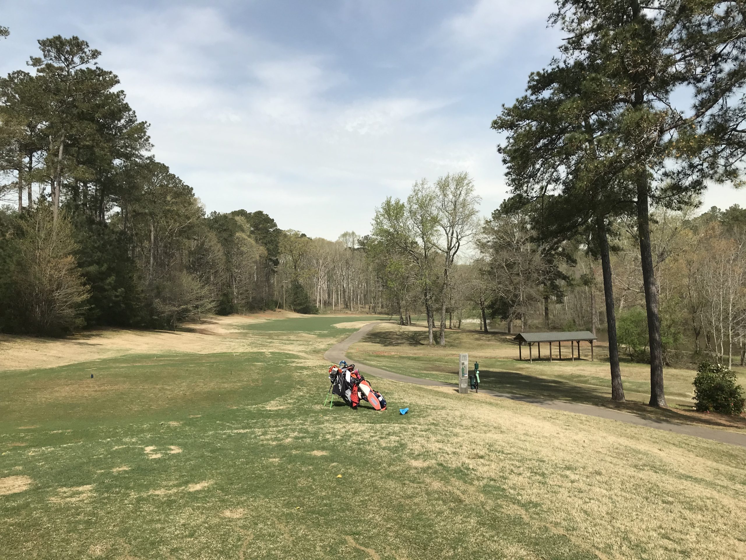 I’ve given you a lot of good so far on Mid Carolina Club. I’d be lying if I didn’t say there was some bad. It has some truly quirky/awful holes. For example, the one below. You can see the green through the trees, but the path is a 90 degree dogleg left. The approach plays up a steep hill to a shallow green with runoffs. It’s a bad hole, period.