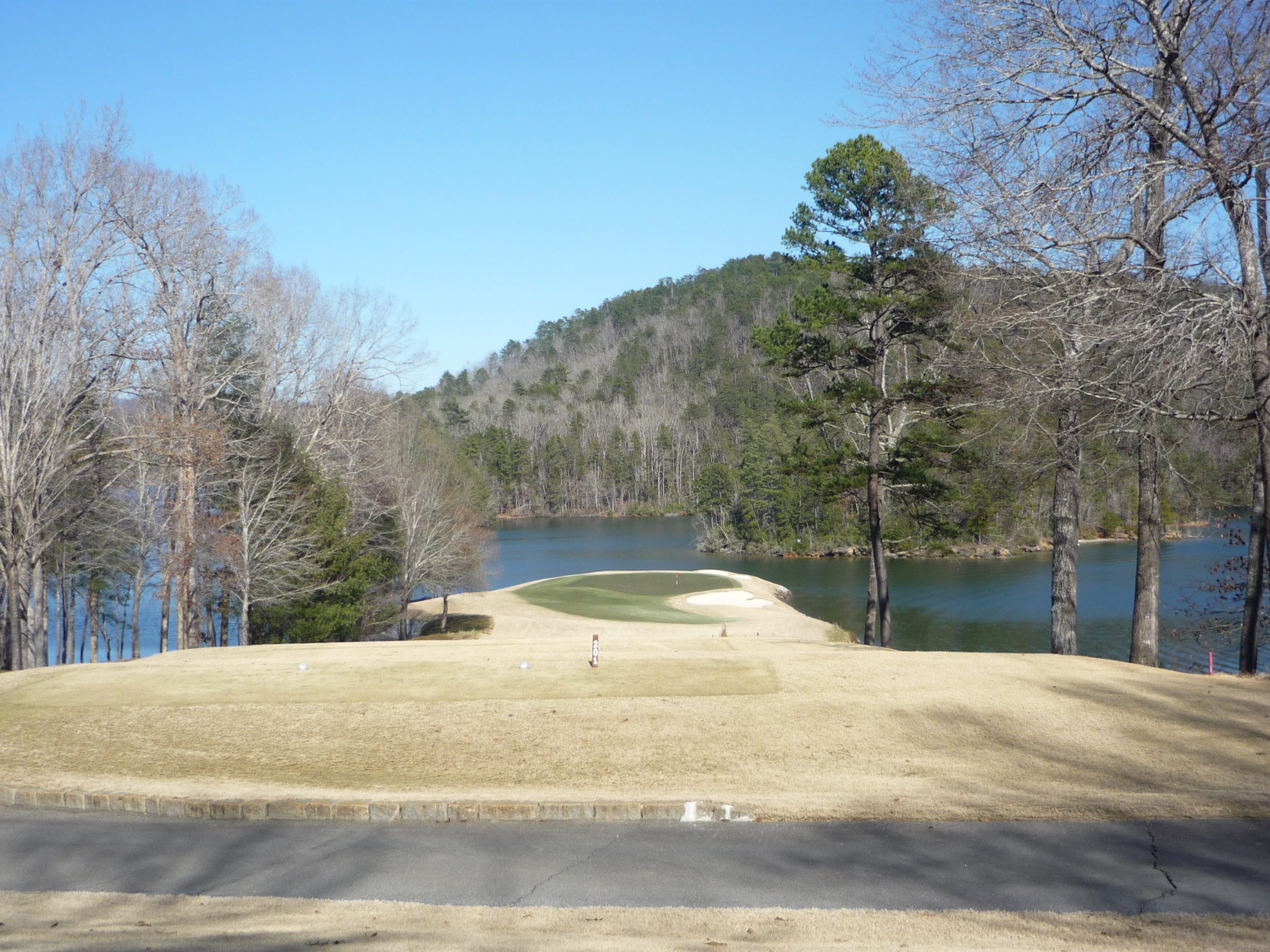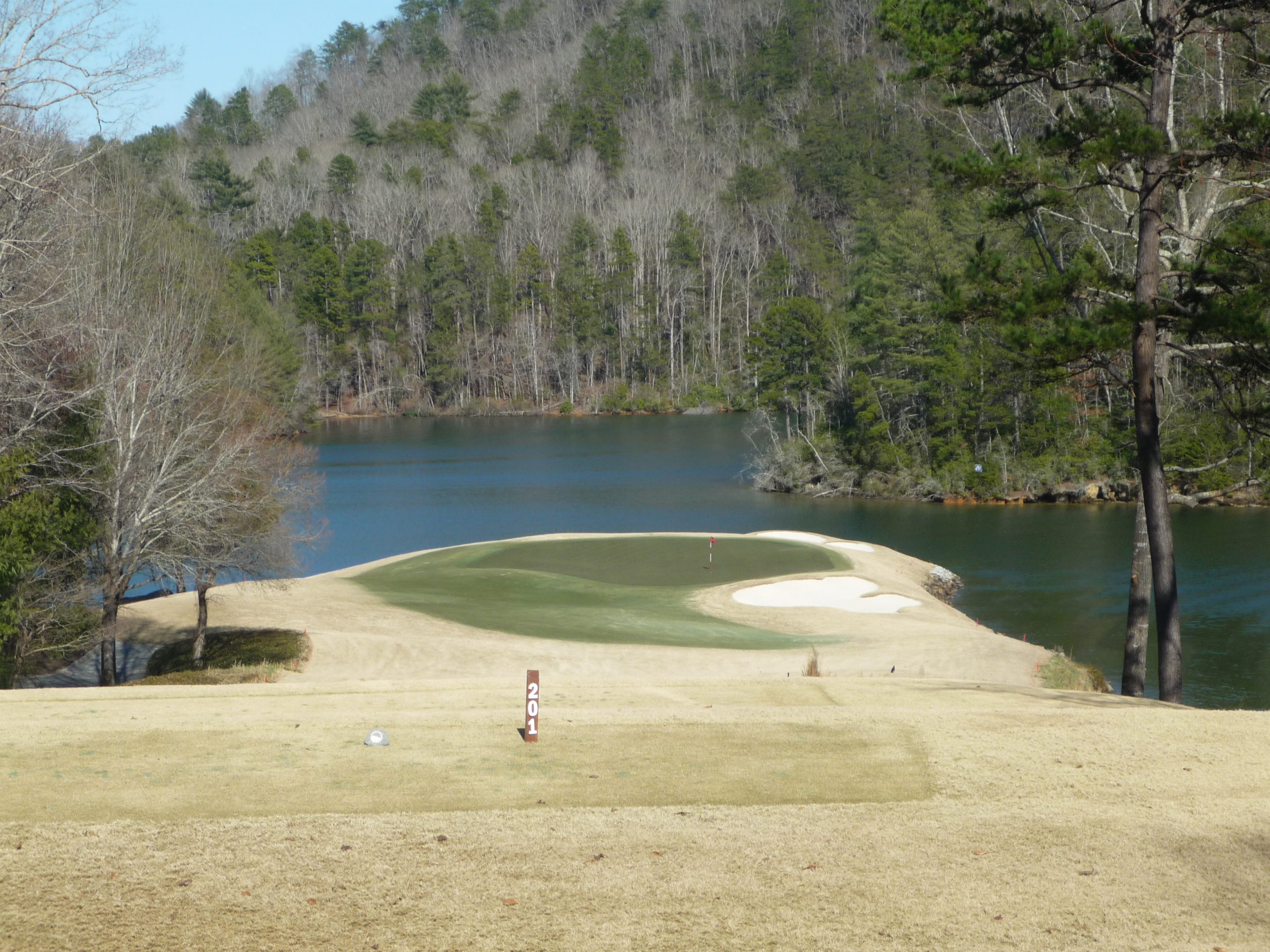 This is the view from the tips. Thank goodness we weren’t playing back here. Our tee is in the second photo. Either way, this is the signature hole here at Keowee Vineyards.