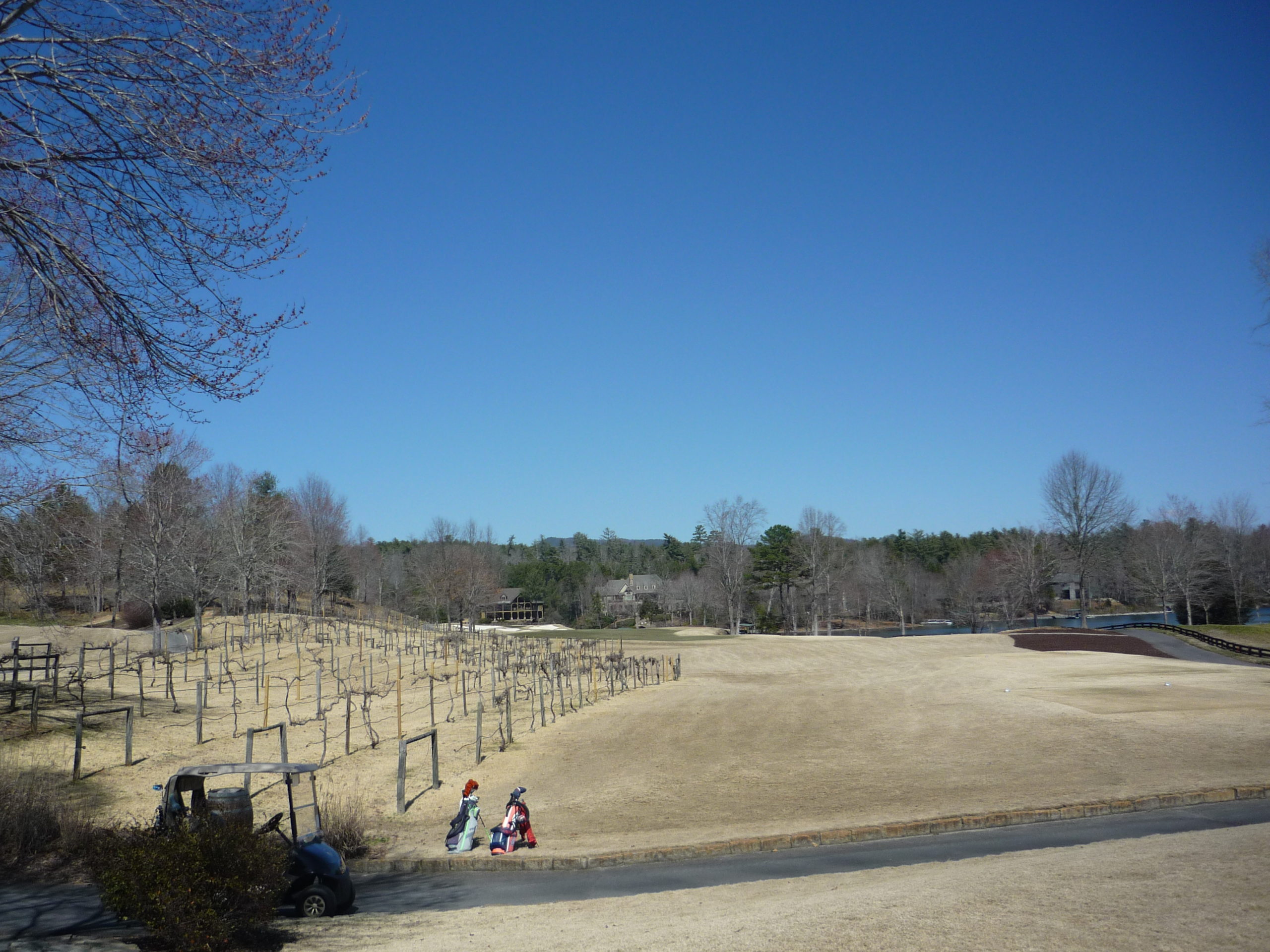 It’s not often you get to play between a vineyard and a lake. Favoring the left side of this fairway is the play here.